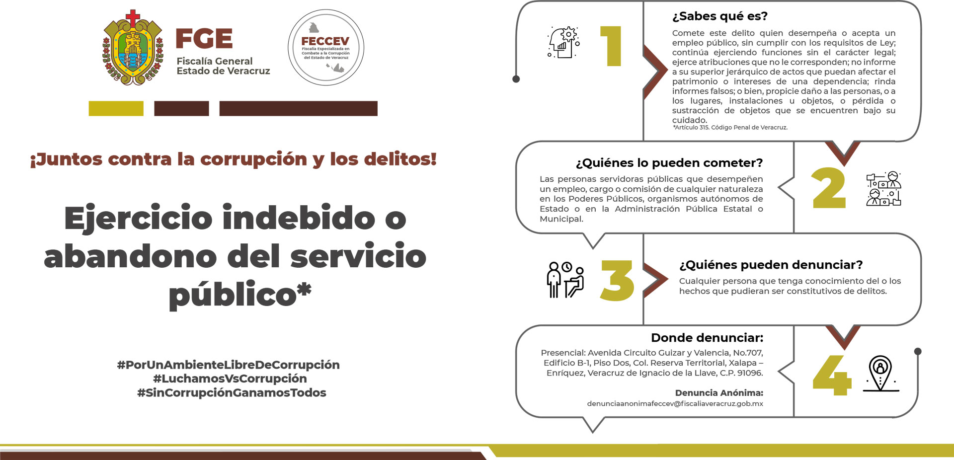 Se reciben denuncias por hechos que la ley considera como delitos por hechos de corrupción comprendidos en los tipos penales del Título XVII del Código Penal del Estado de Veracruz de Ignacio de la Llave, con excepción del Capítulo II Ter, Desaparición Forzada de Personas, por ser competencia de la Fiscalía Especializada para la Atención de Denuncias por Personas Desaparecidas.