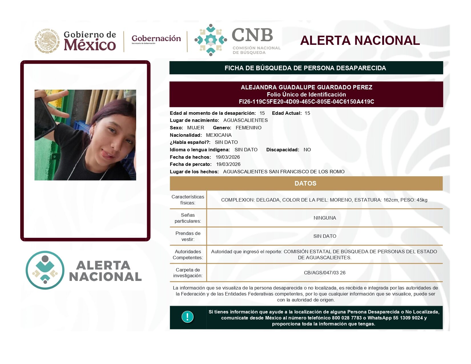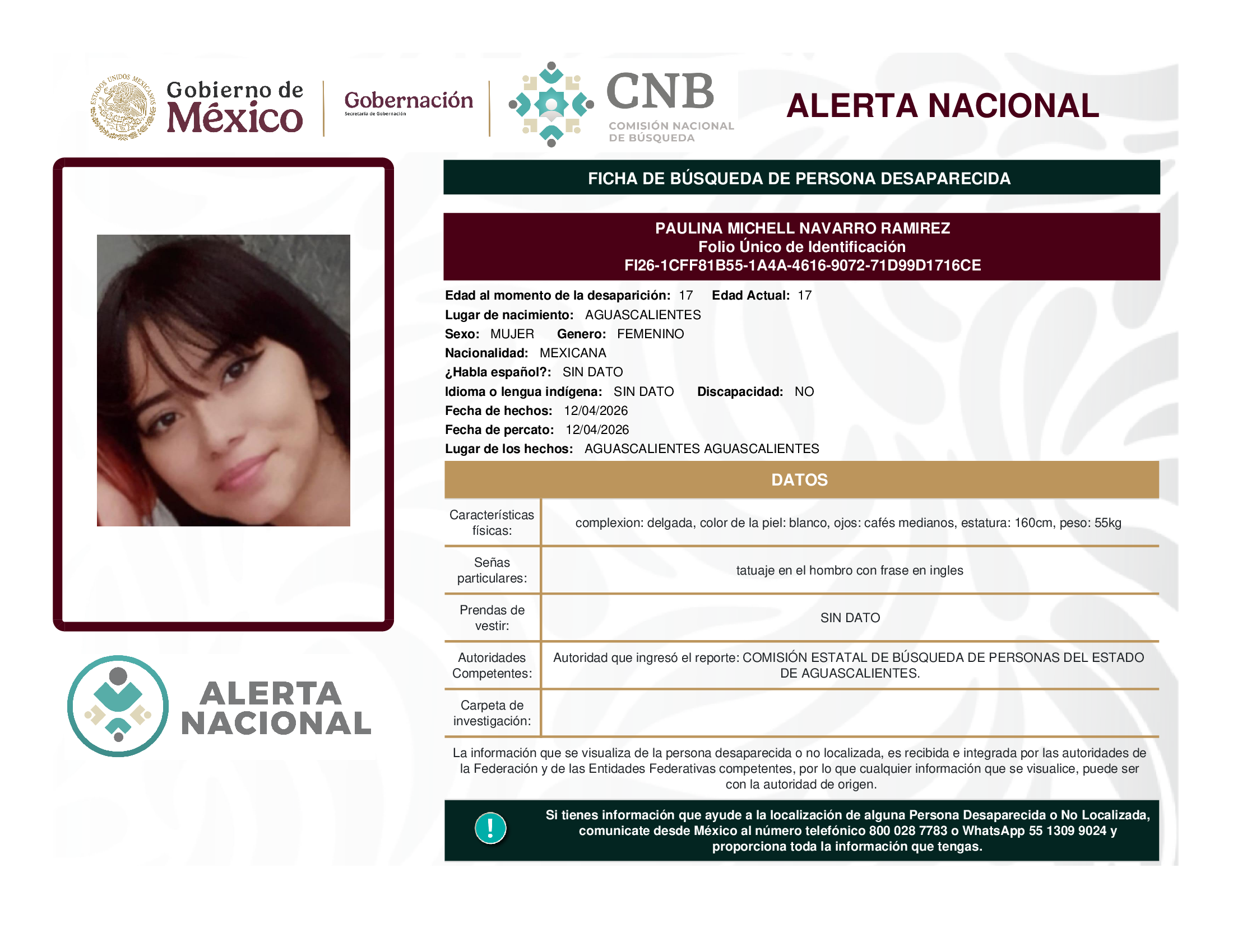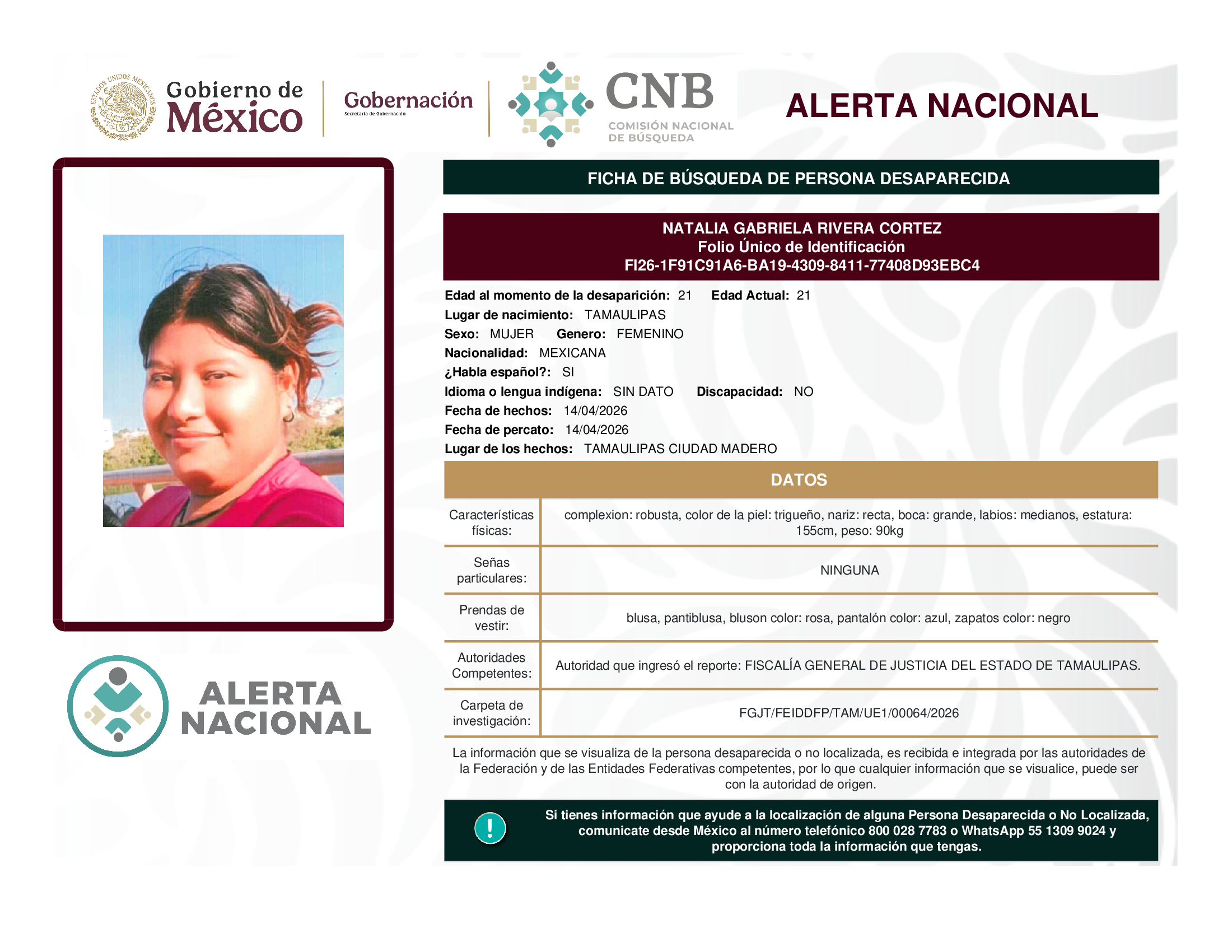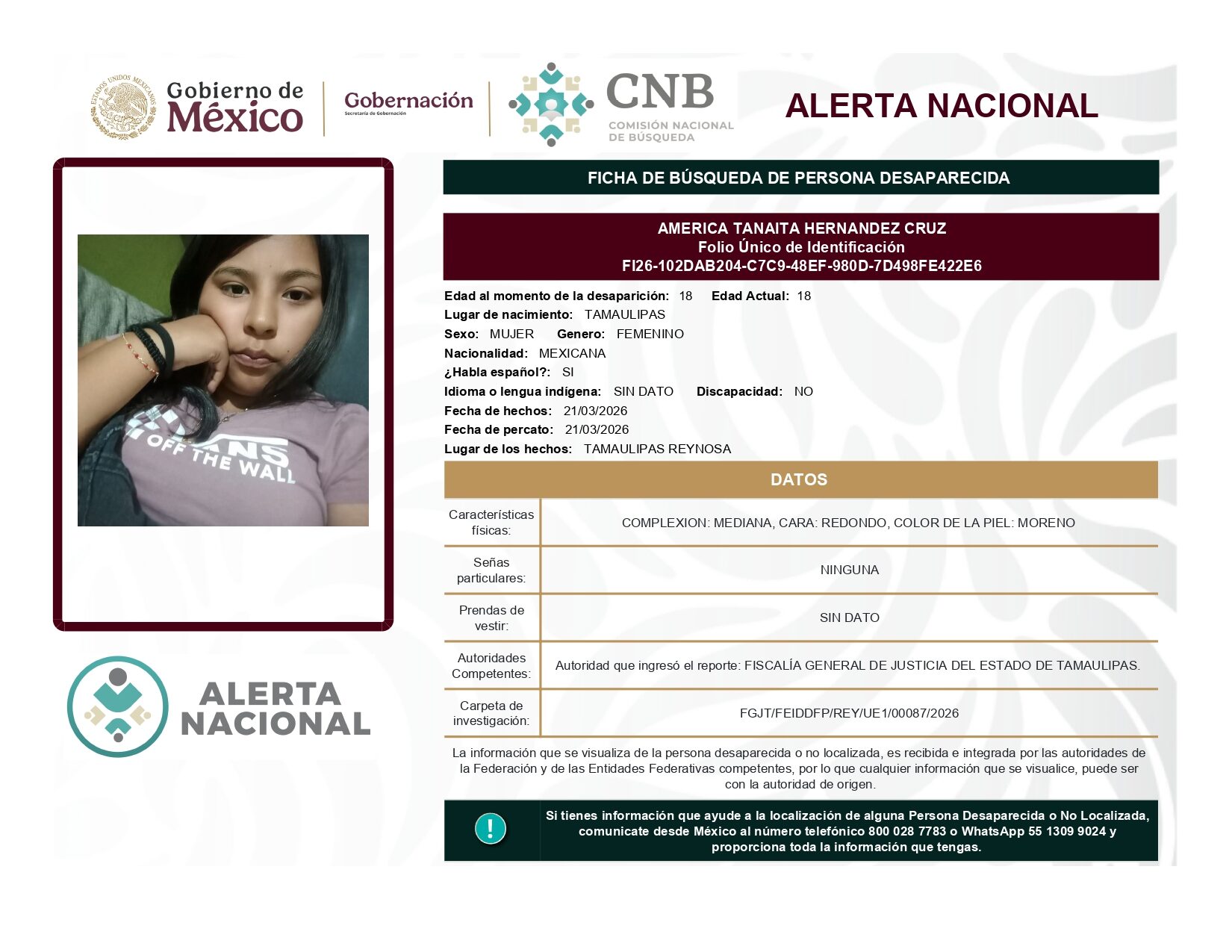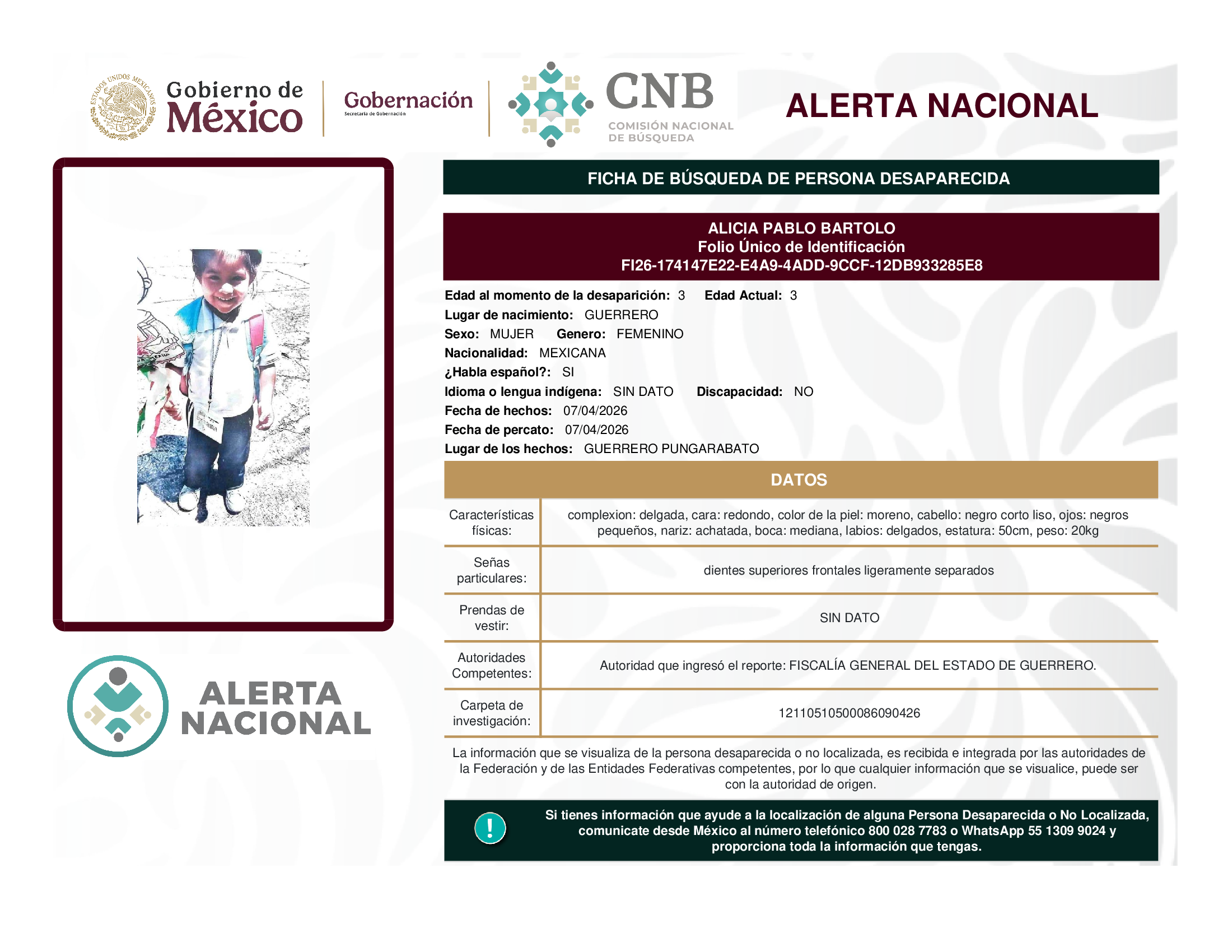 ALERTA NACIONAL DE BÚSQUEDA, LOCALIZACIÓN E IDENTIFICACIÓN DE PERSONAS DESAPARECIDAS Y NO LOCALIZADAS