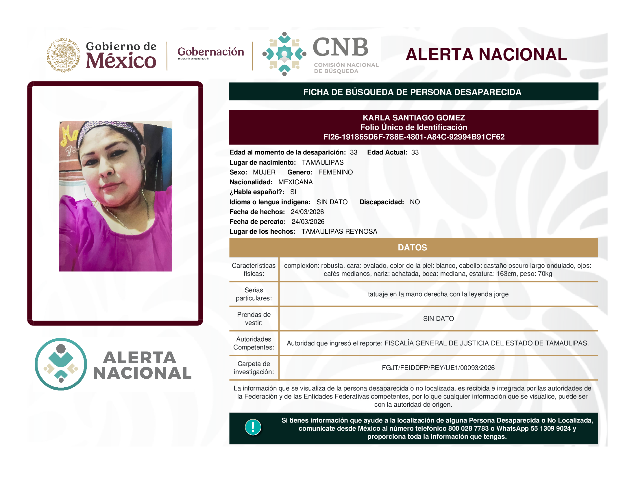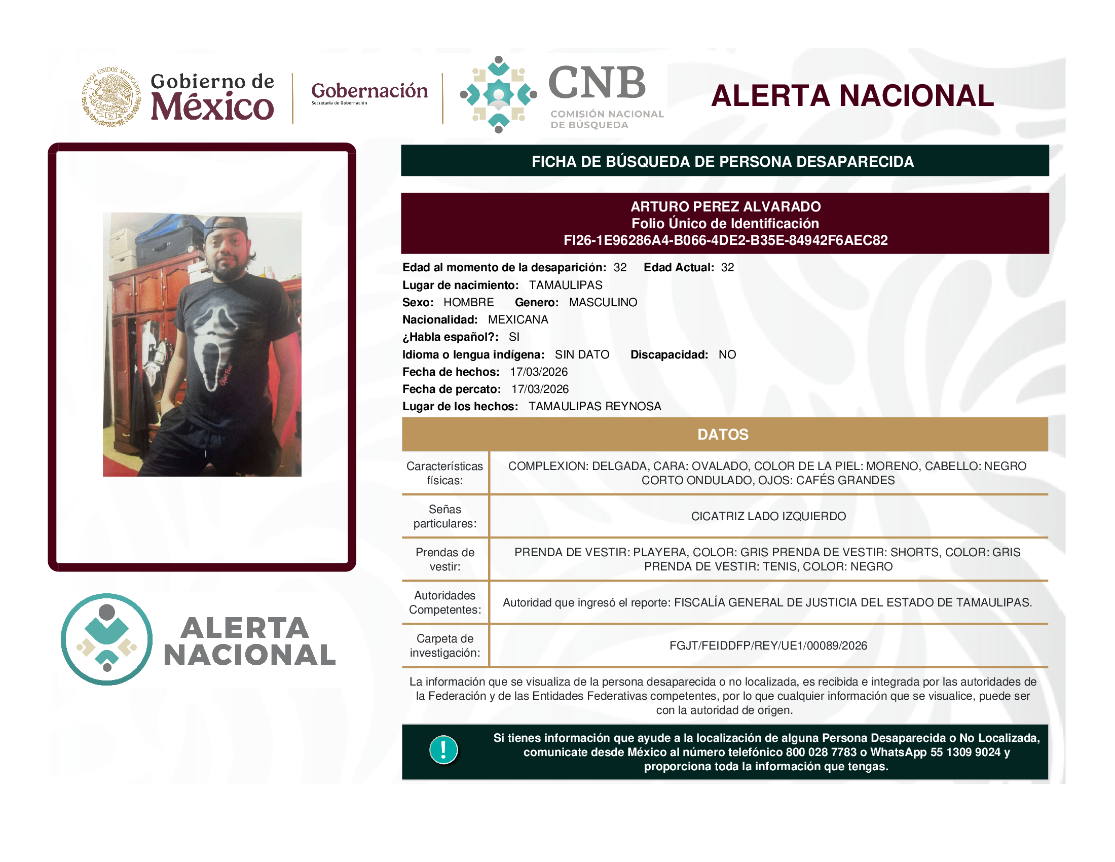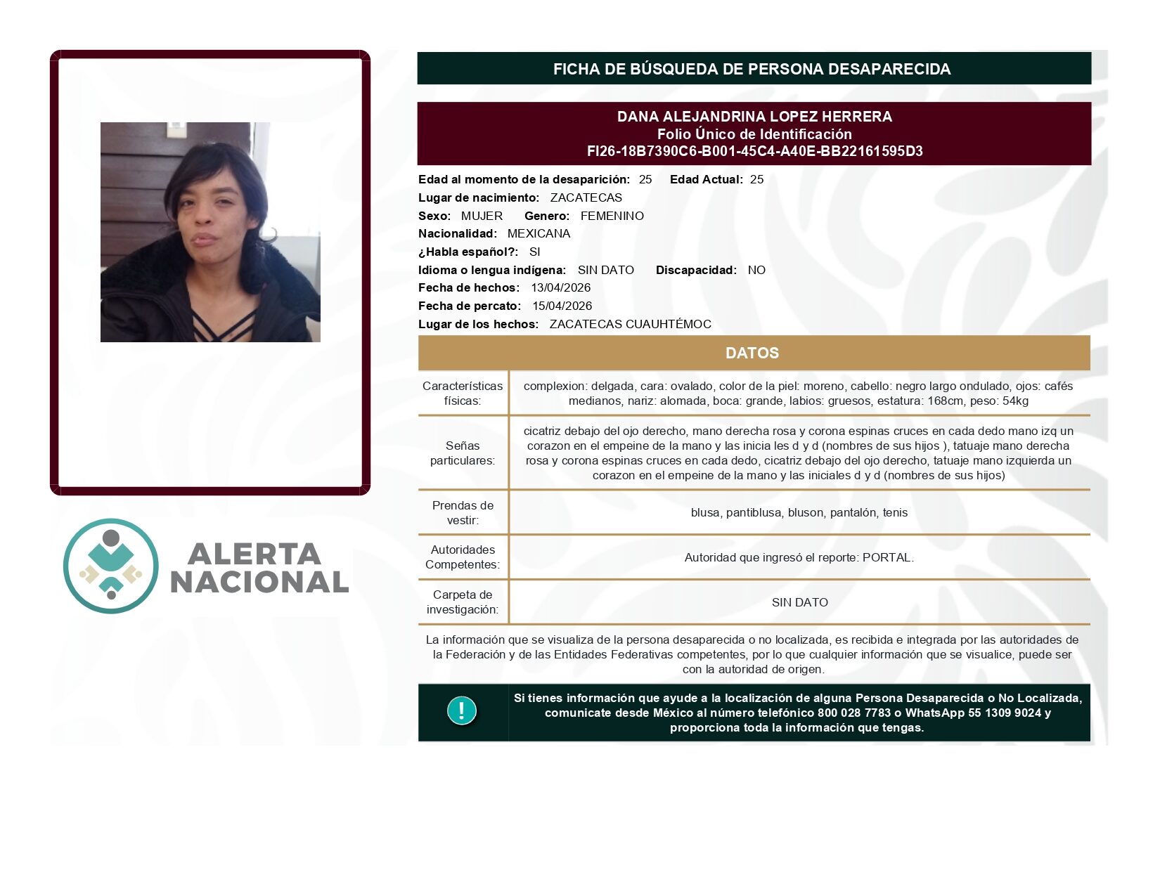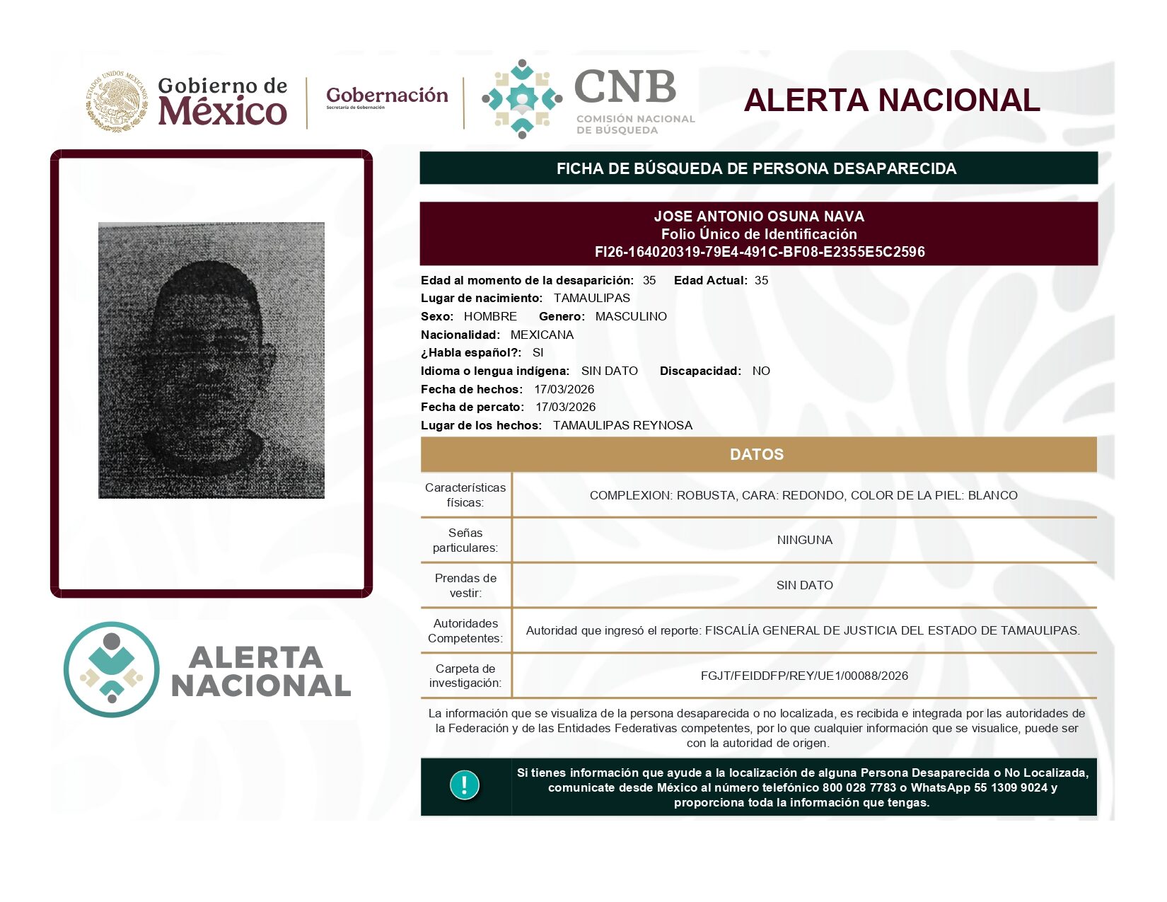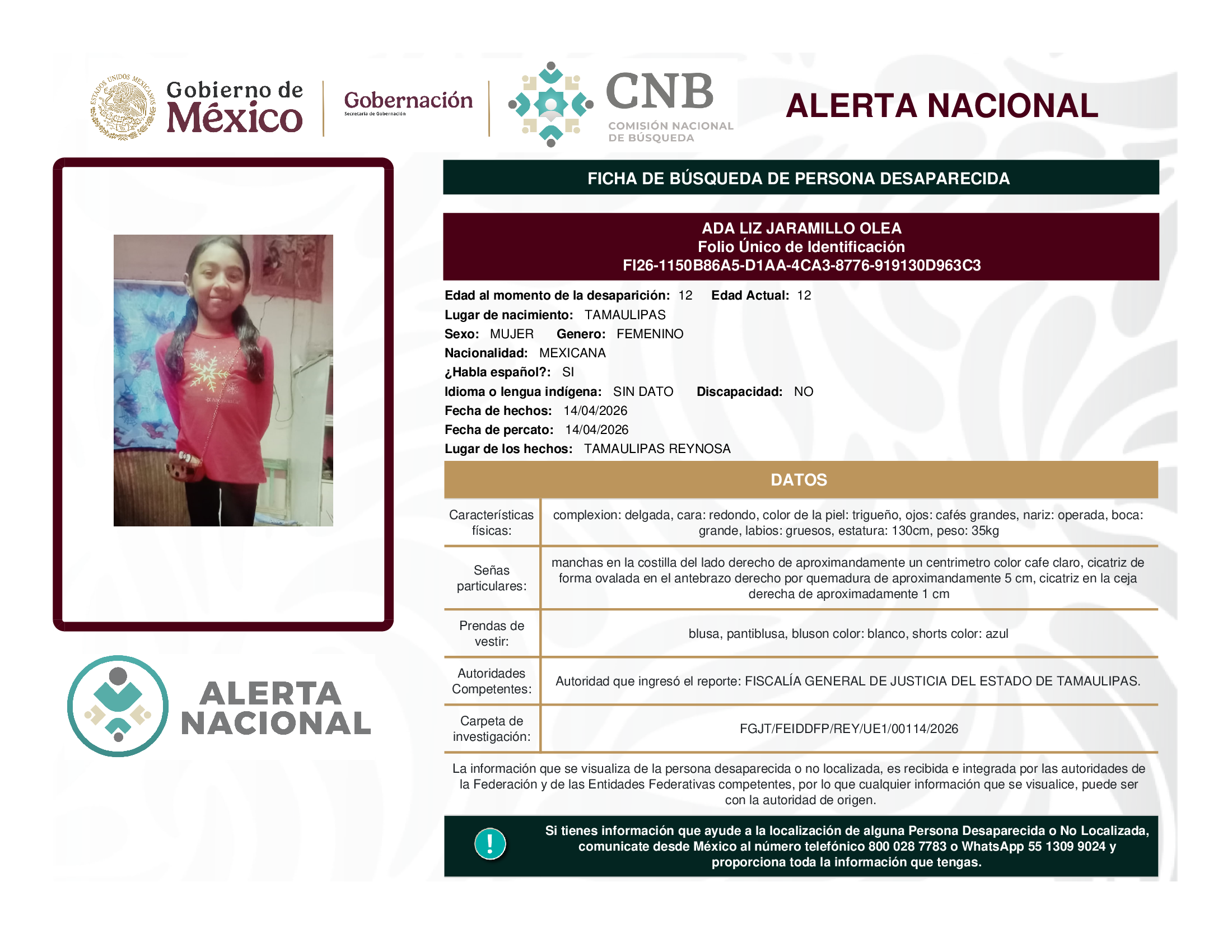 ALERTA NACIONAL DE BÚSQUEDA, LOCALIZACIÓN E IDENTIFICACIÓN DE PERSONAS DESAPARECIDAS Y NO LOCALIZADAS
