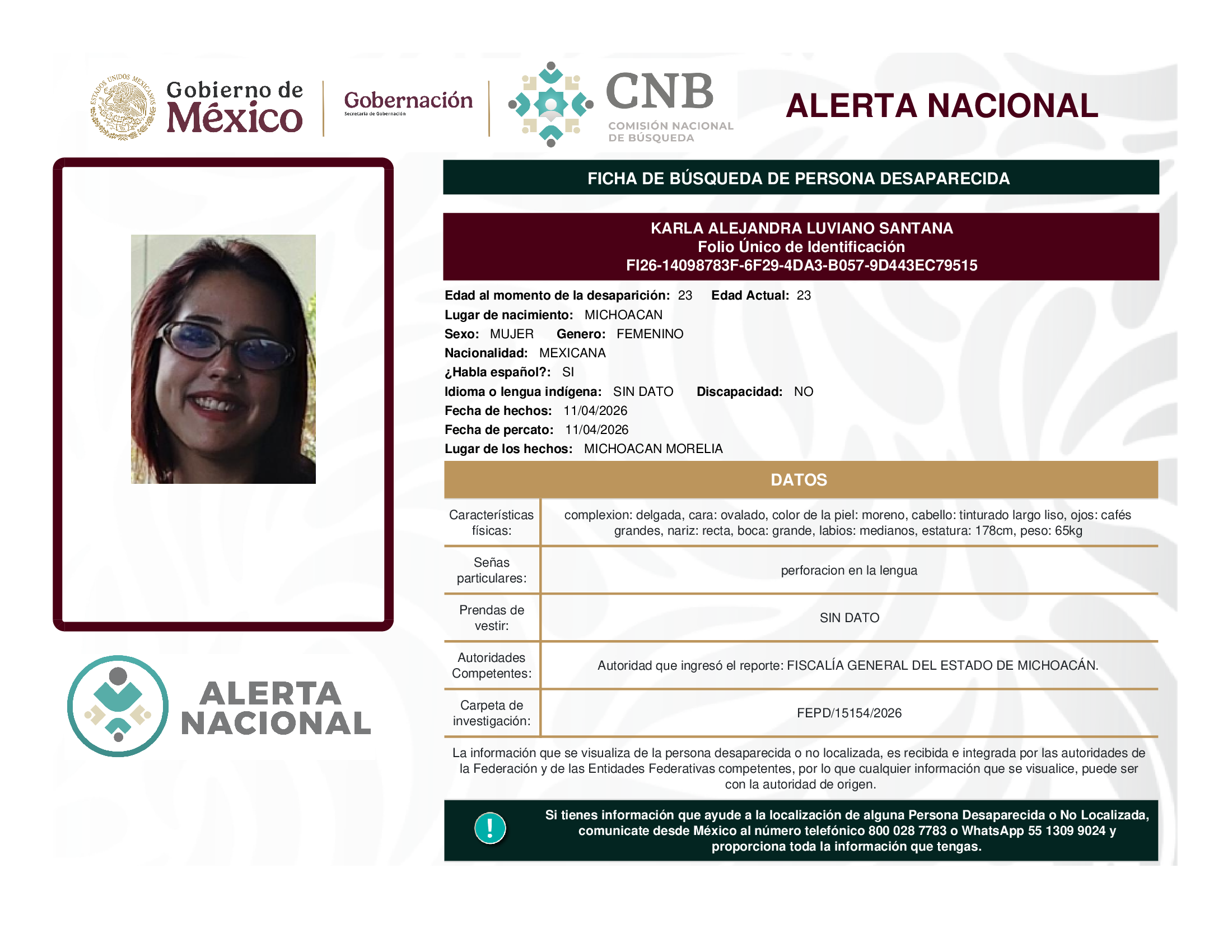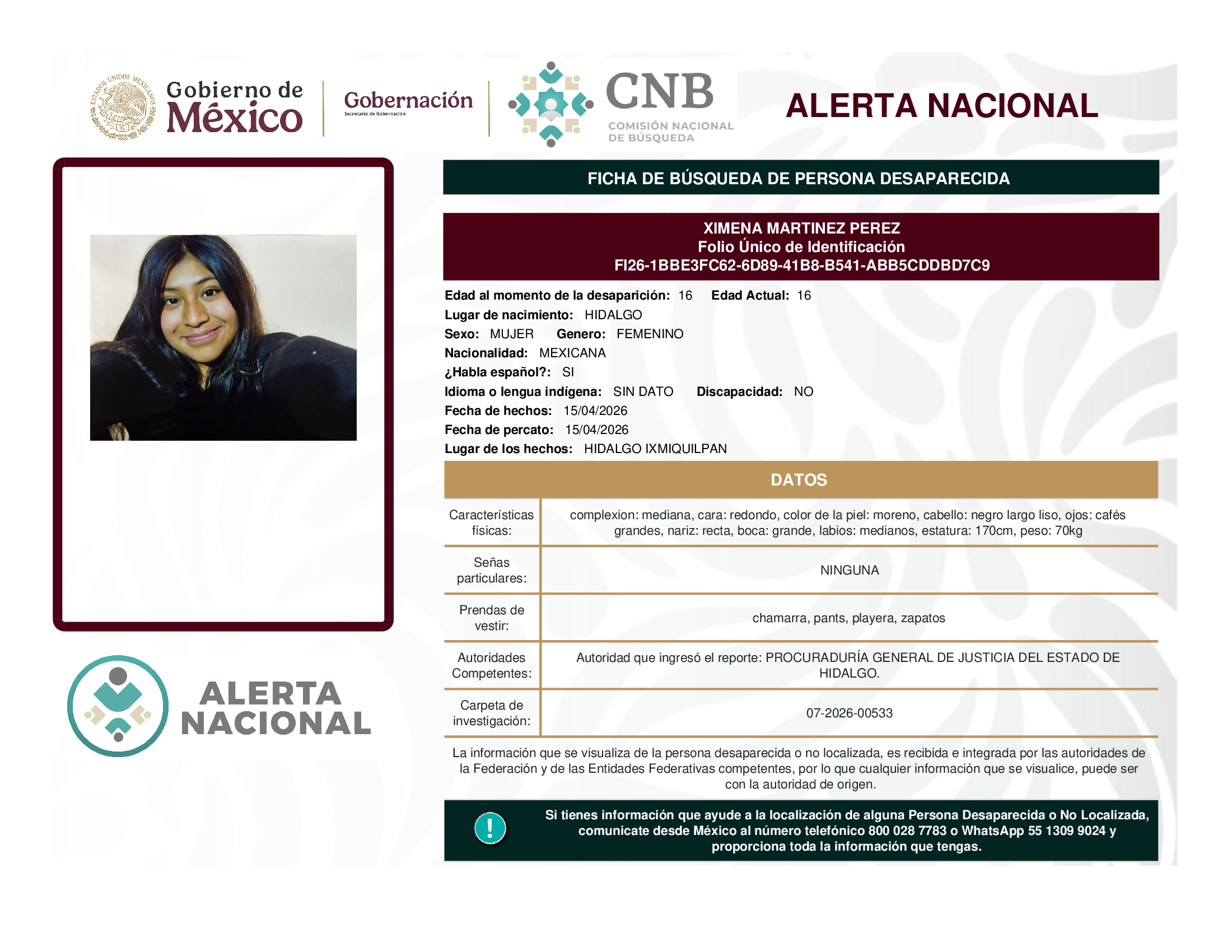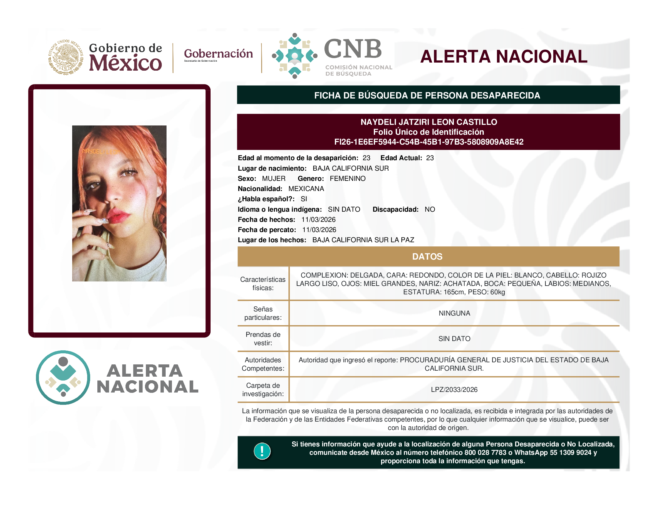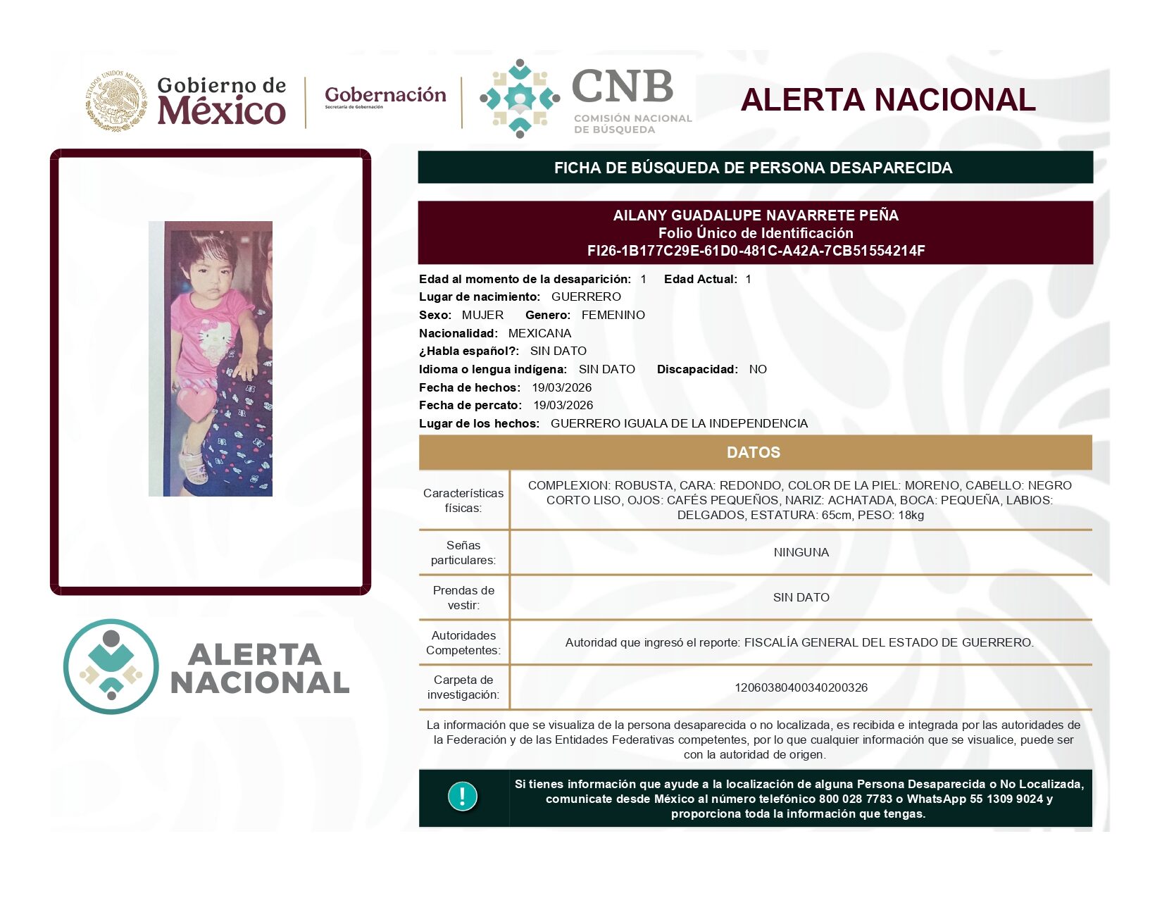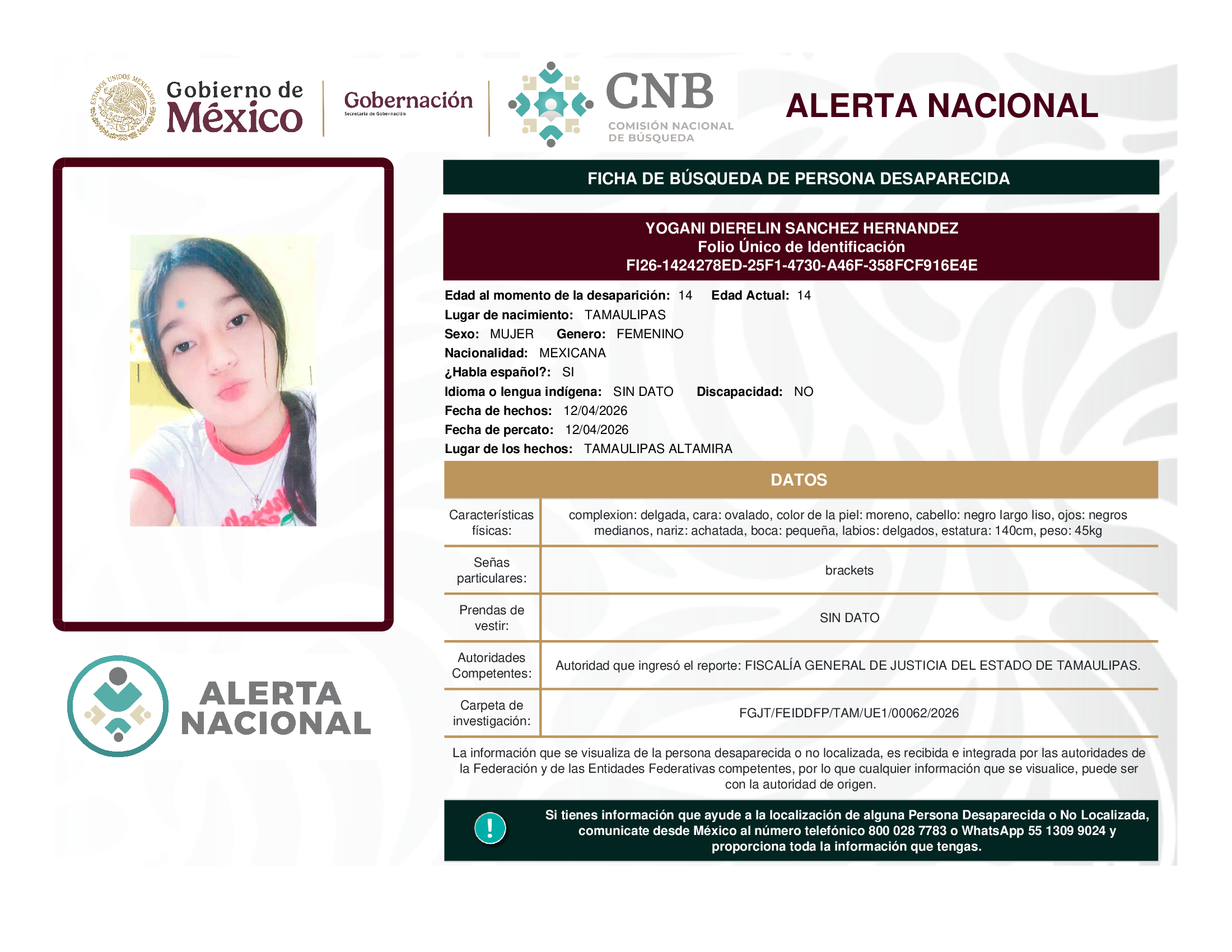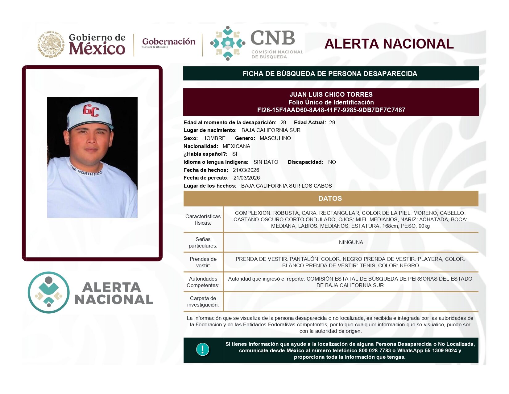 ALERTA NACIONAL DE BÚSQUEDA, LOCALIZACIÓN E IDENTIFICACIÓN DE PERSONAS DESAPARECIDAS Y NO LOCALIZADAS