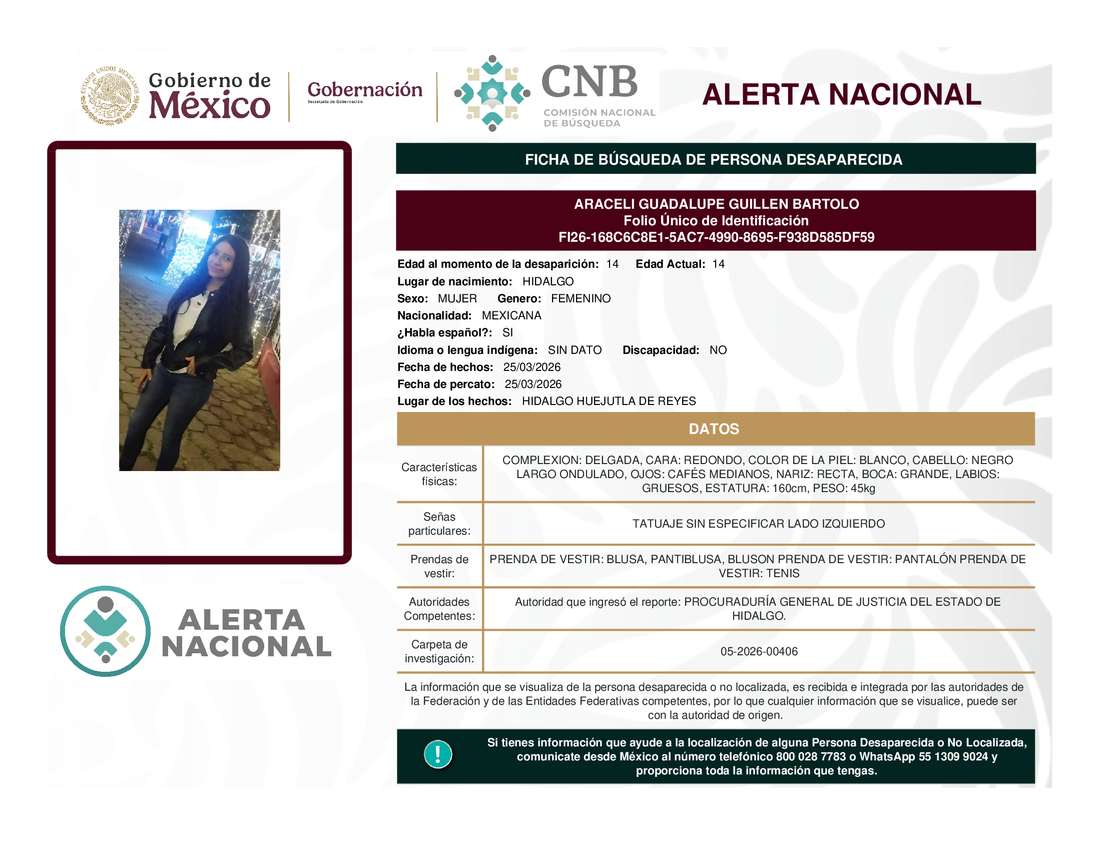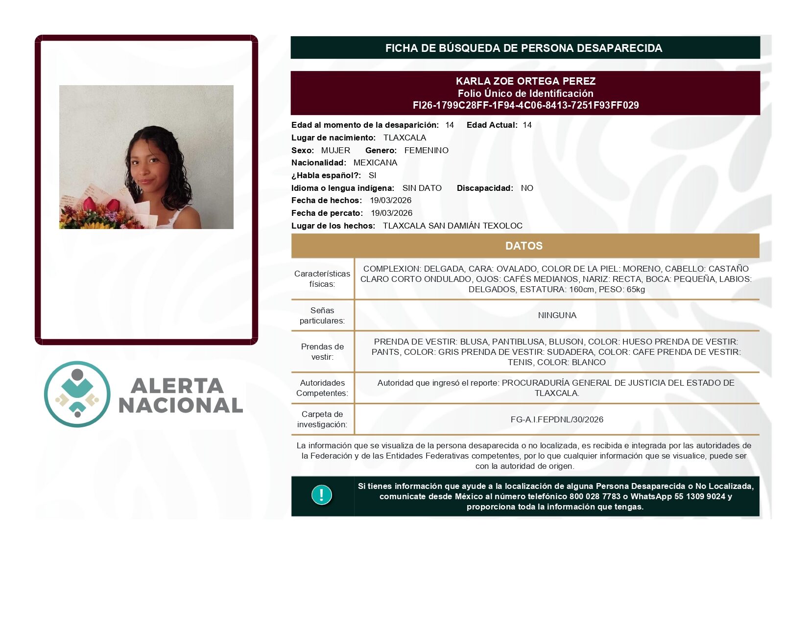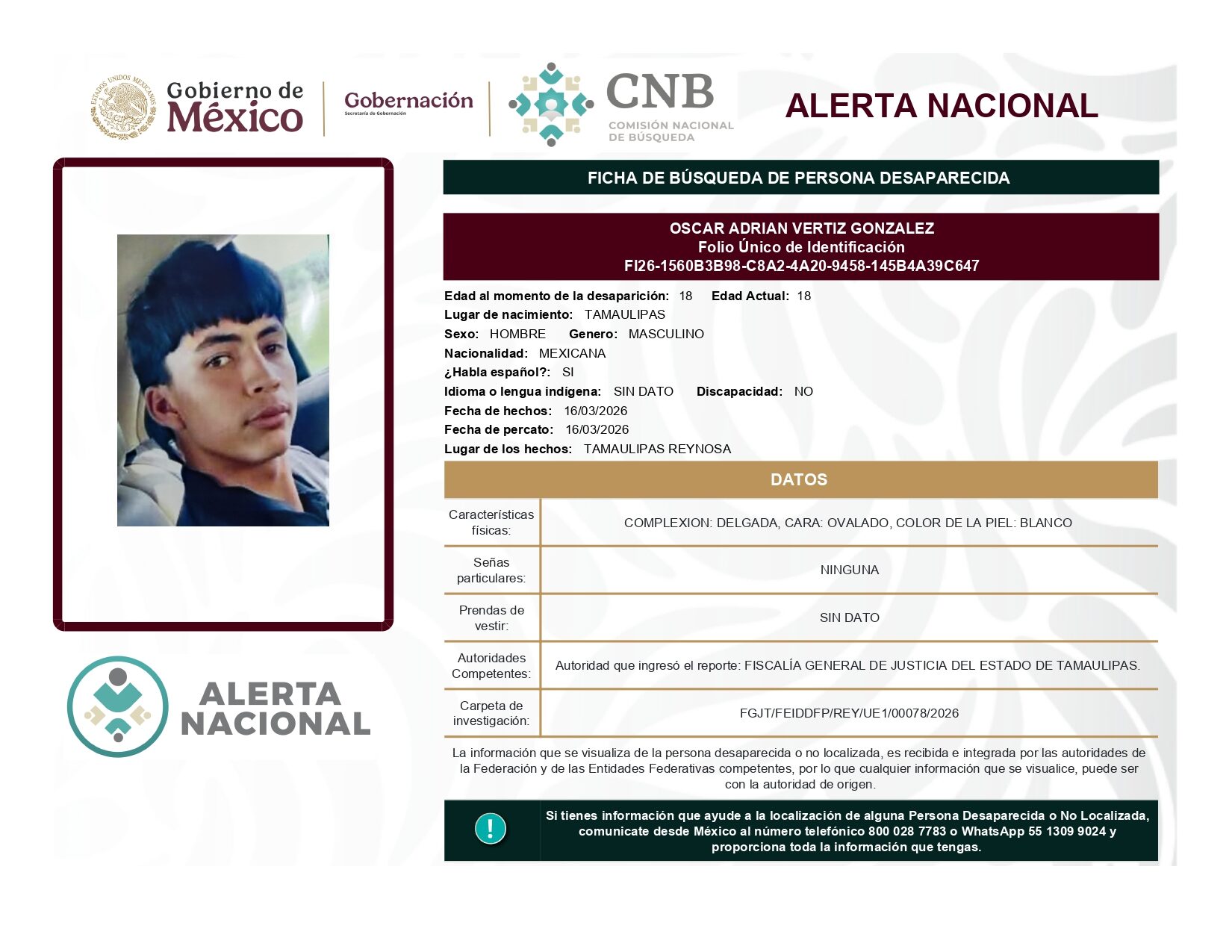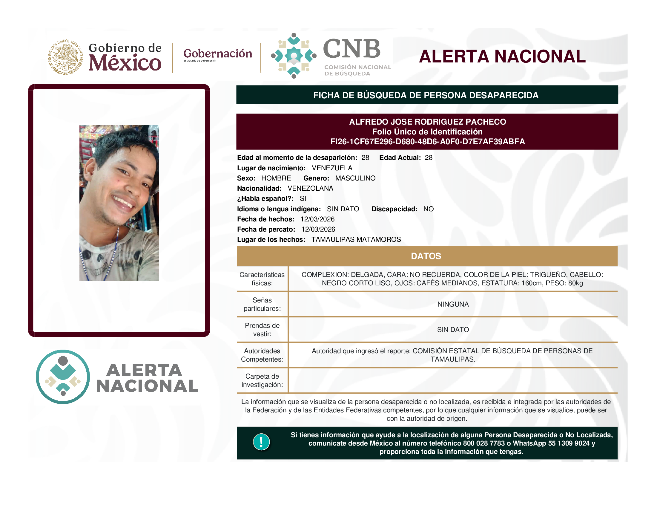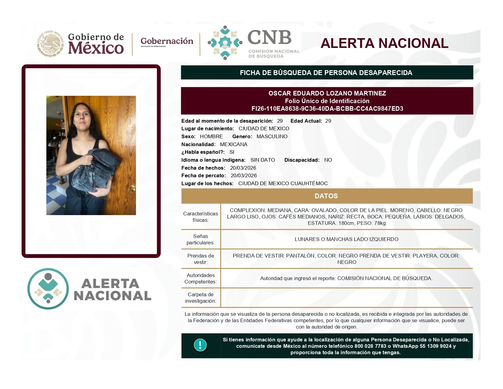 ALERTA NACIONAL DE BÚSQUEDA, LOCALIZACIÓN E IDENTIFICACIÓN DE PERSONAS DESAPARECIDAS Y NO LOCALIZADAS