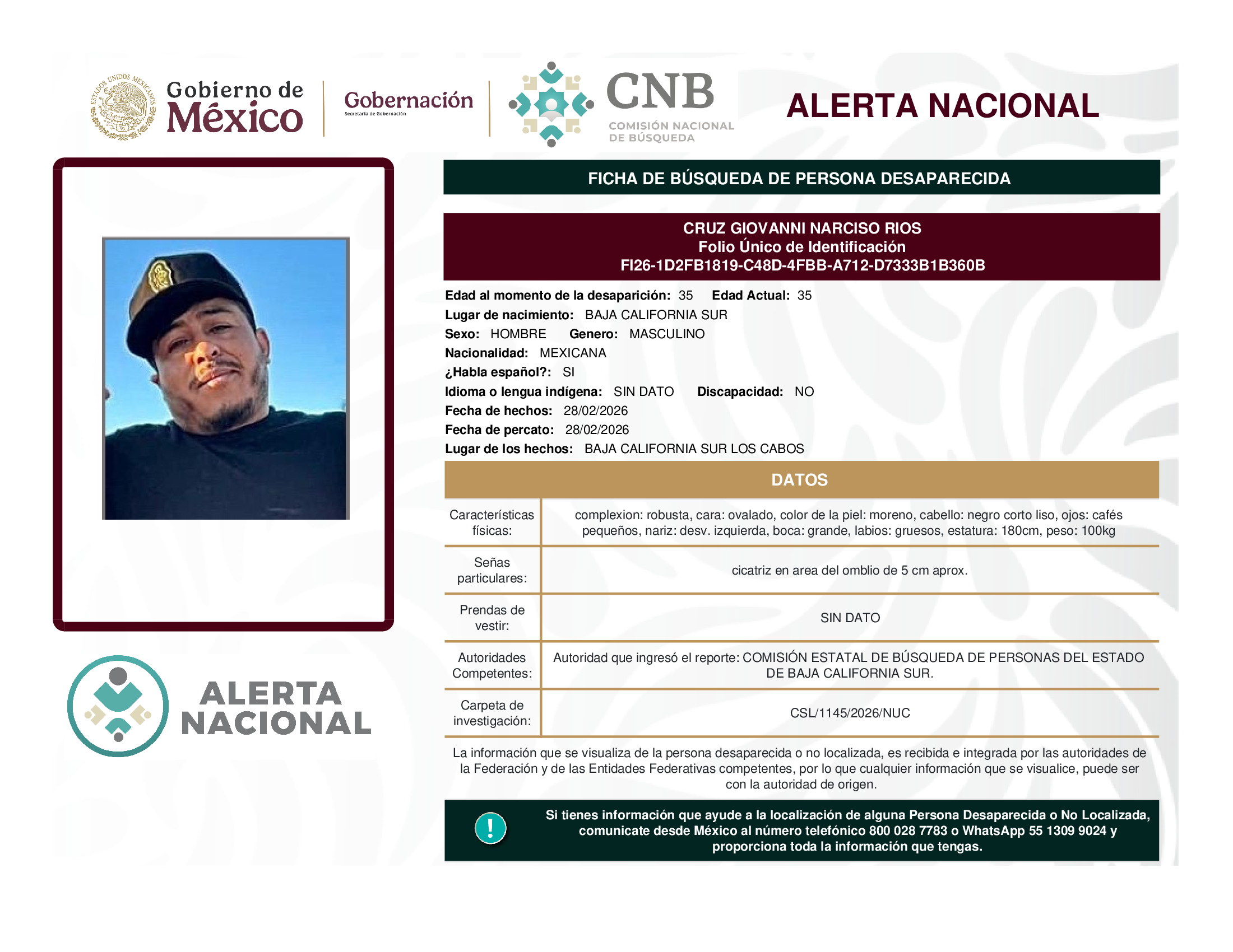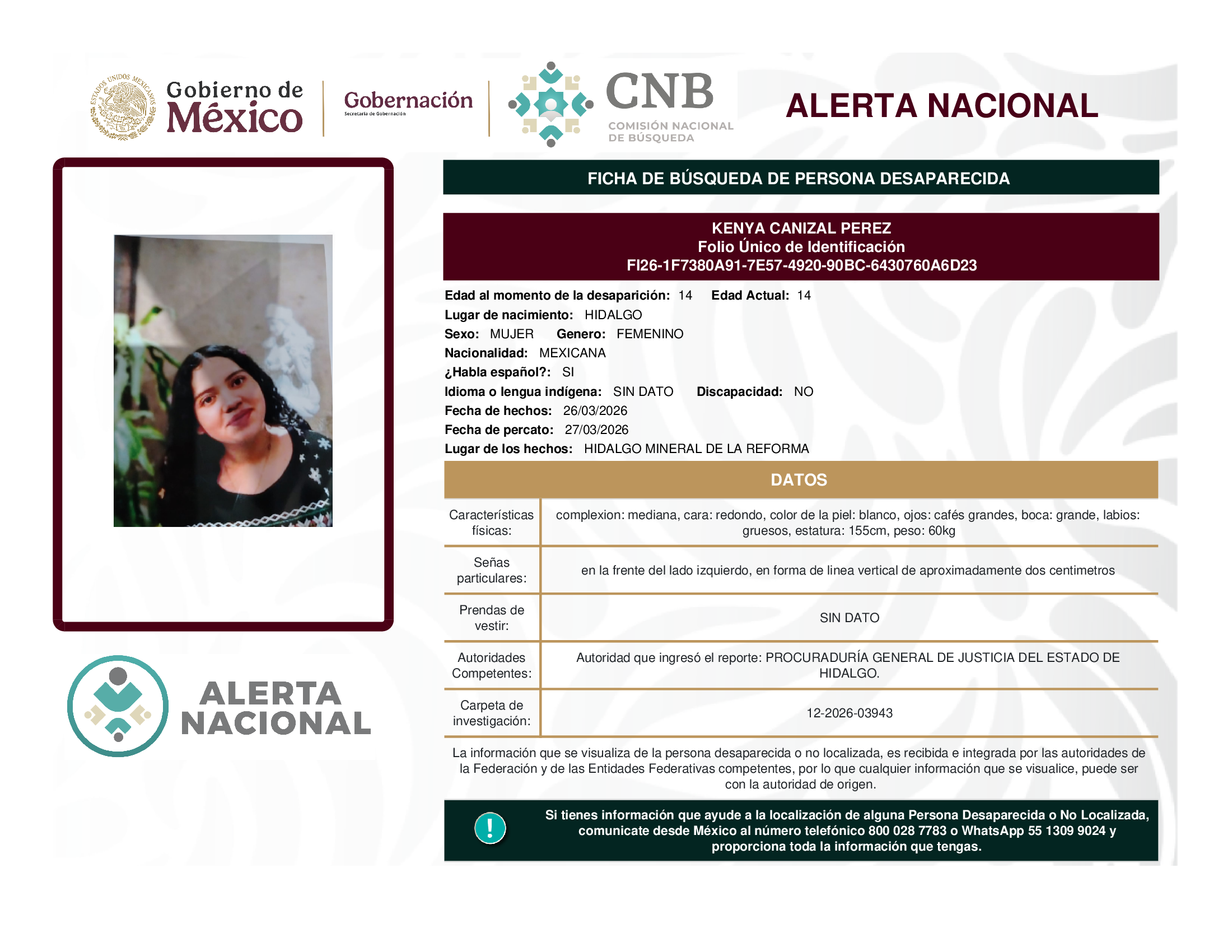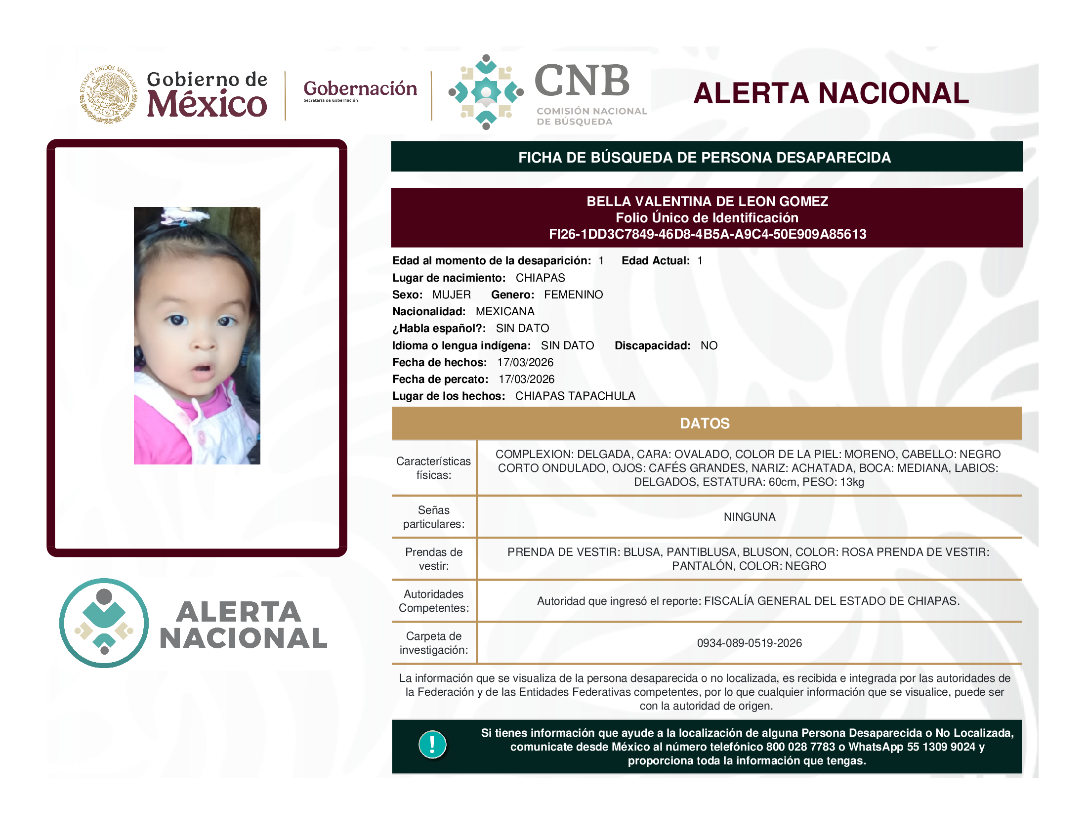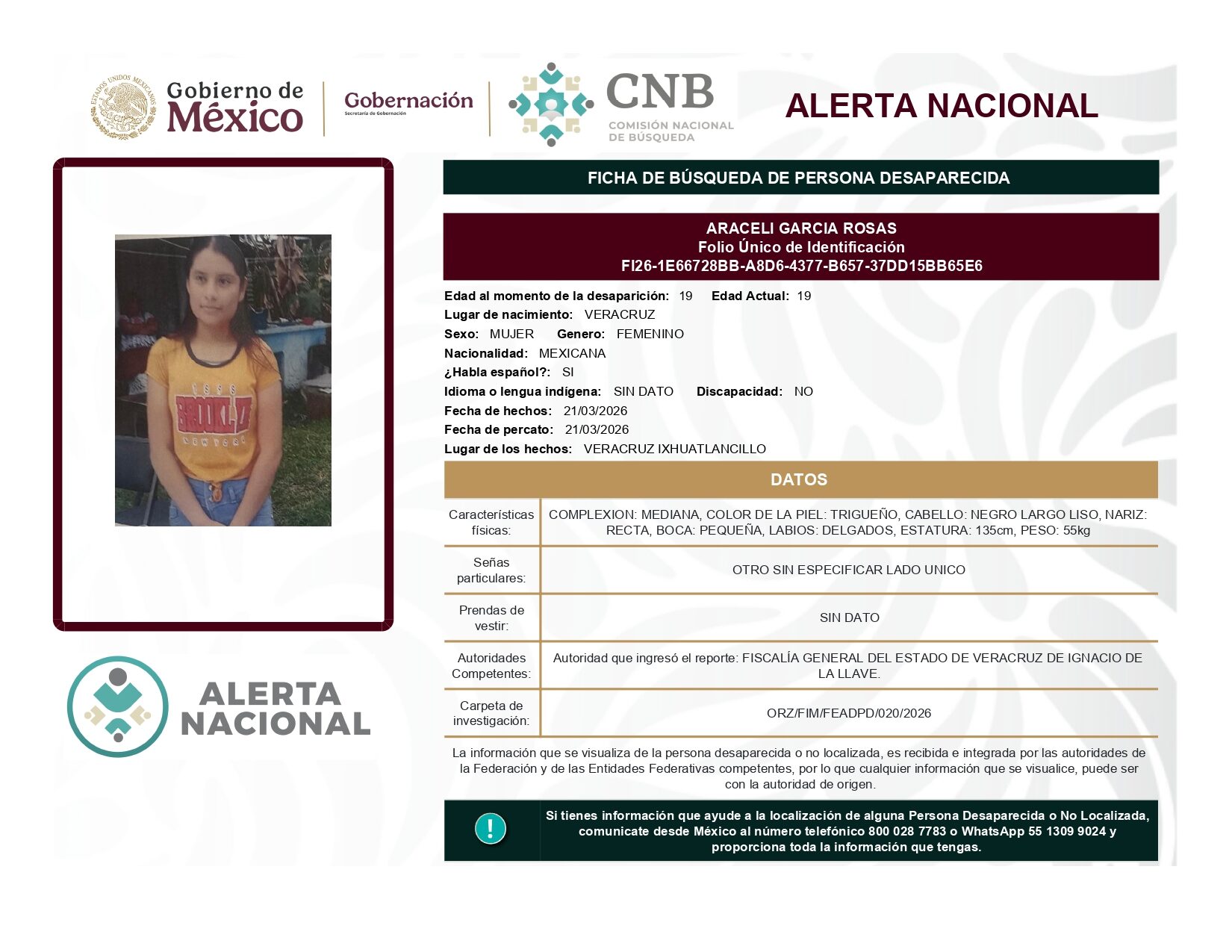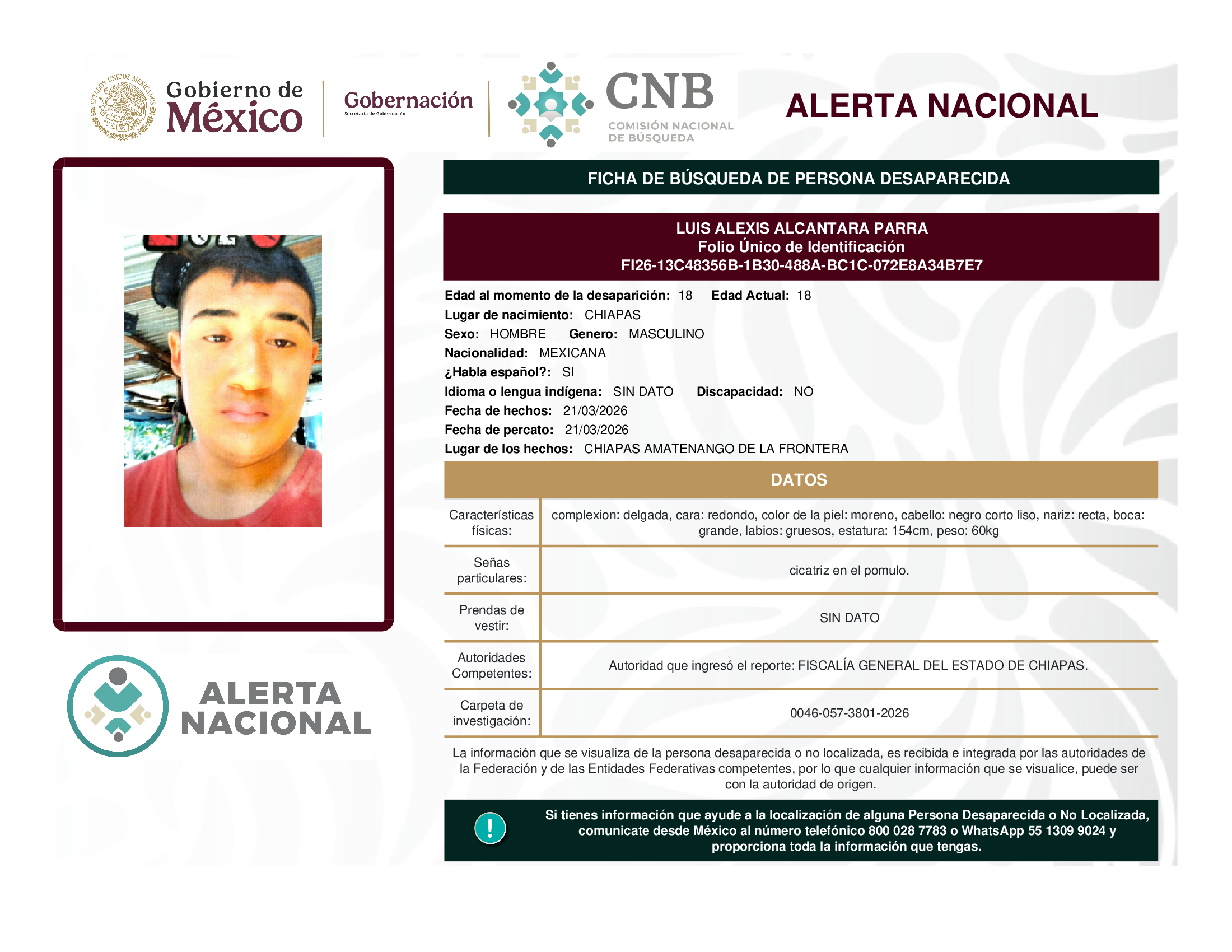 ALERTA NACIONAL DE BÚSQUEDA, LOCALIZACIÓN E IDENTIFICACIÓN DE PERSONAS DESAPARECIDAS Y NO LOCALIZADAS