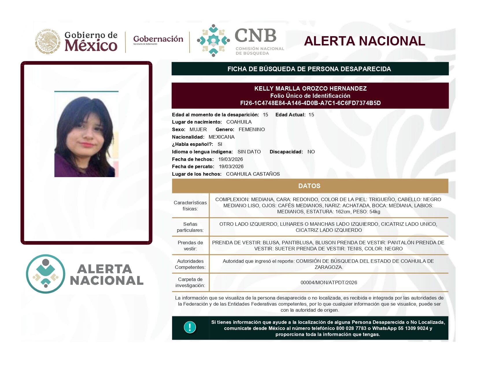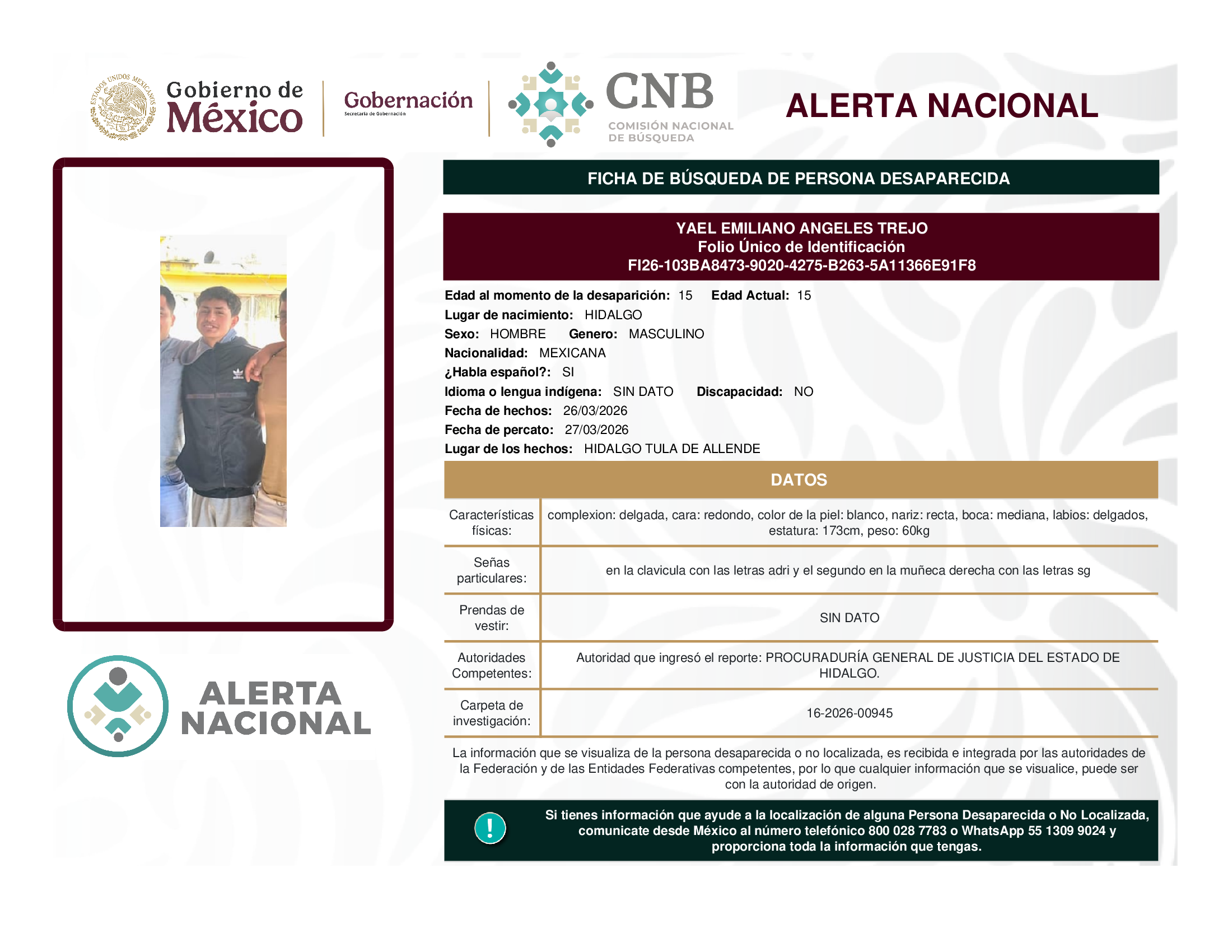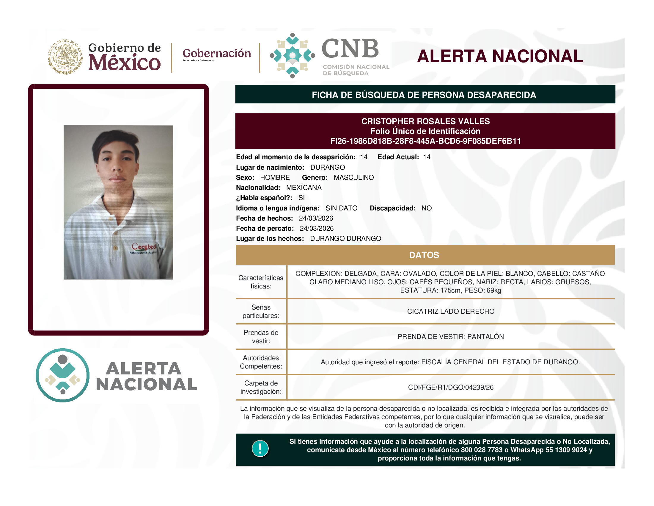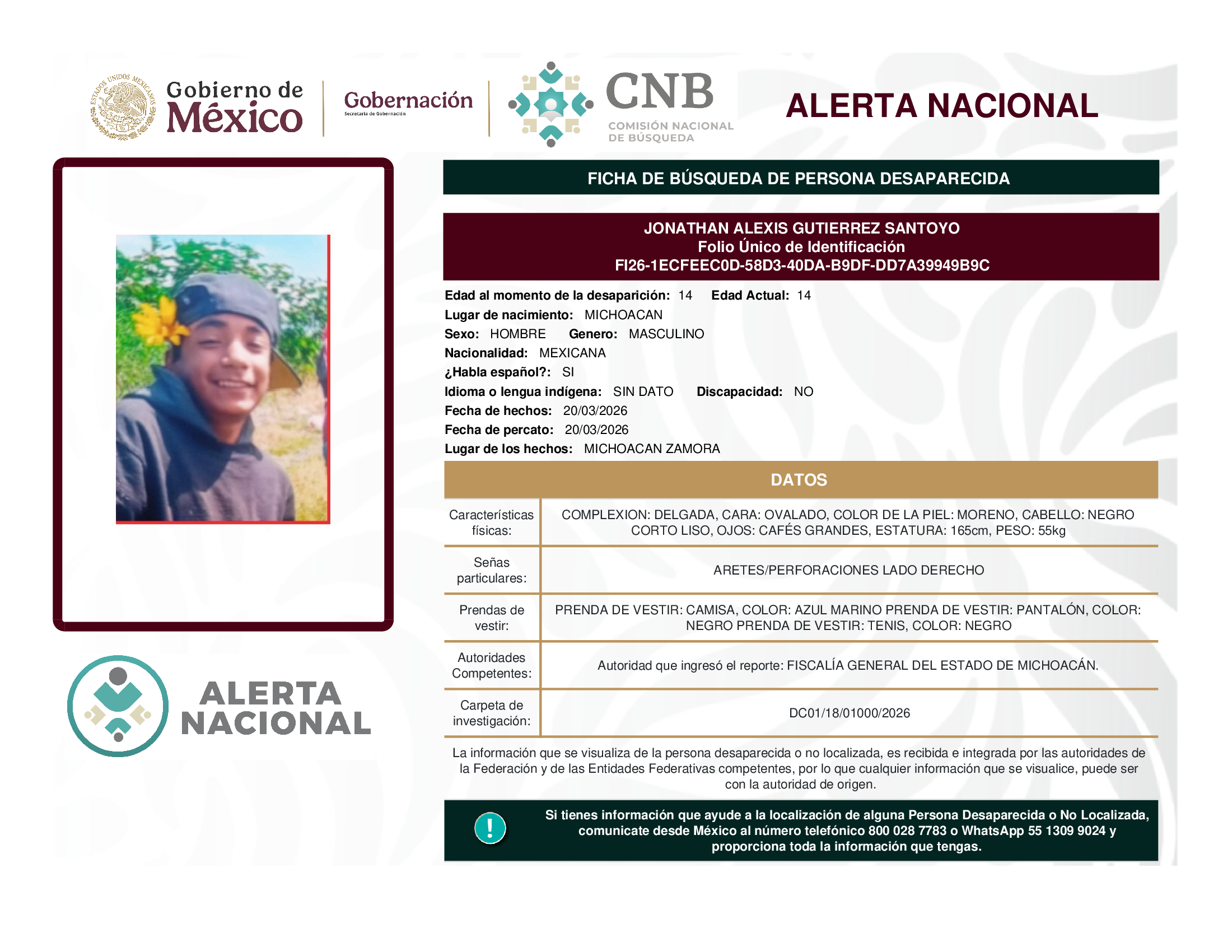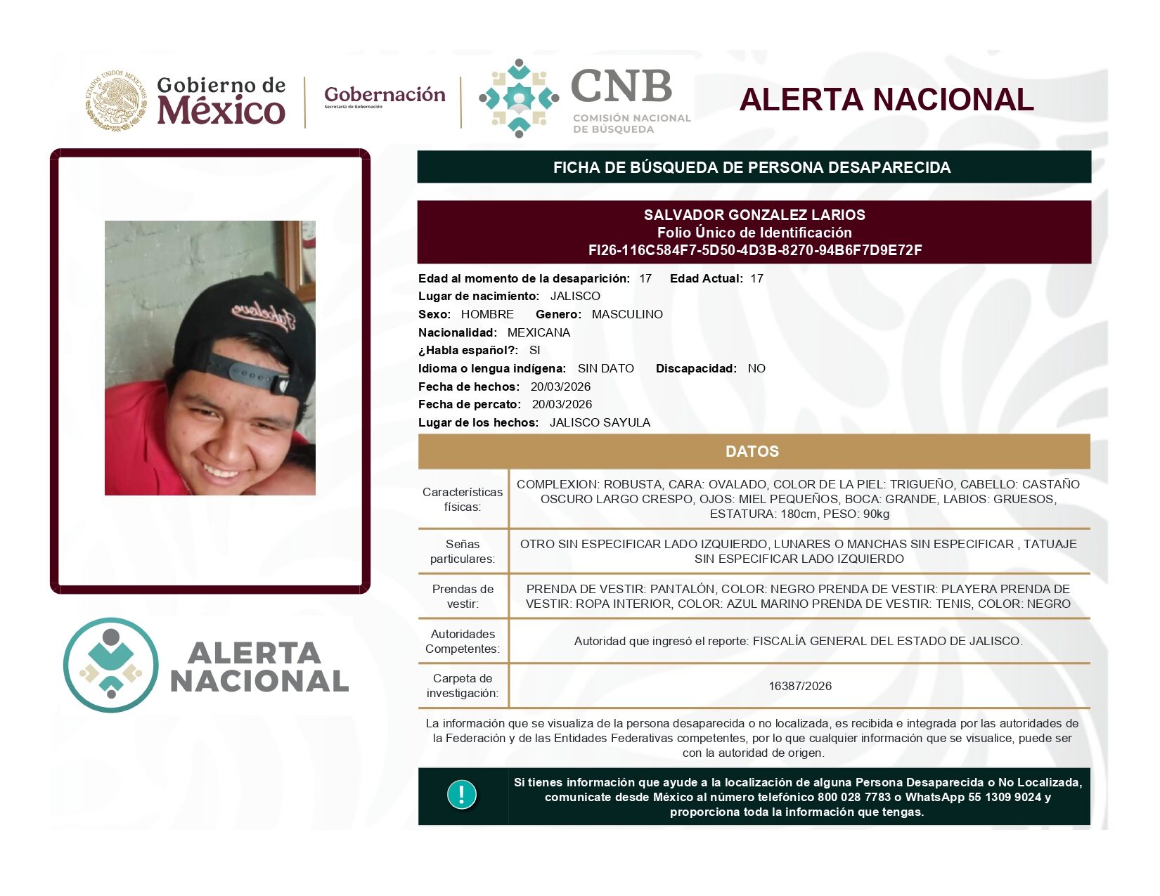 ALERTA NACIONAL DE BÚSQUEDA, LOCALIZACIÓN E IDENTIFICACIÓN DE PERSONAS DESAPARECIDAS Y NO LOCALIZADAS