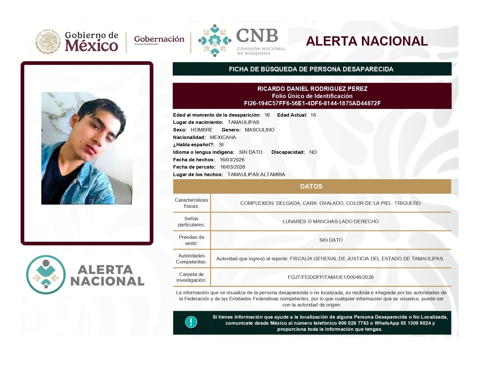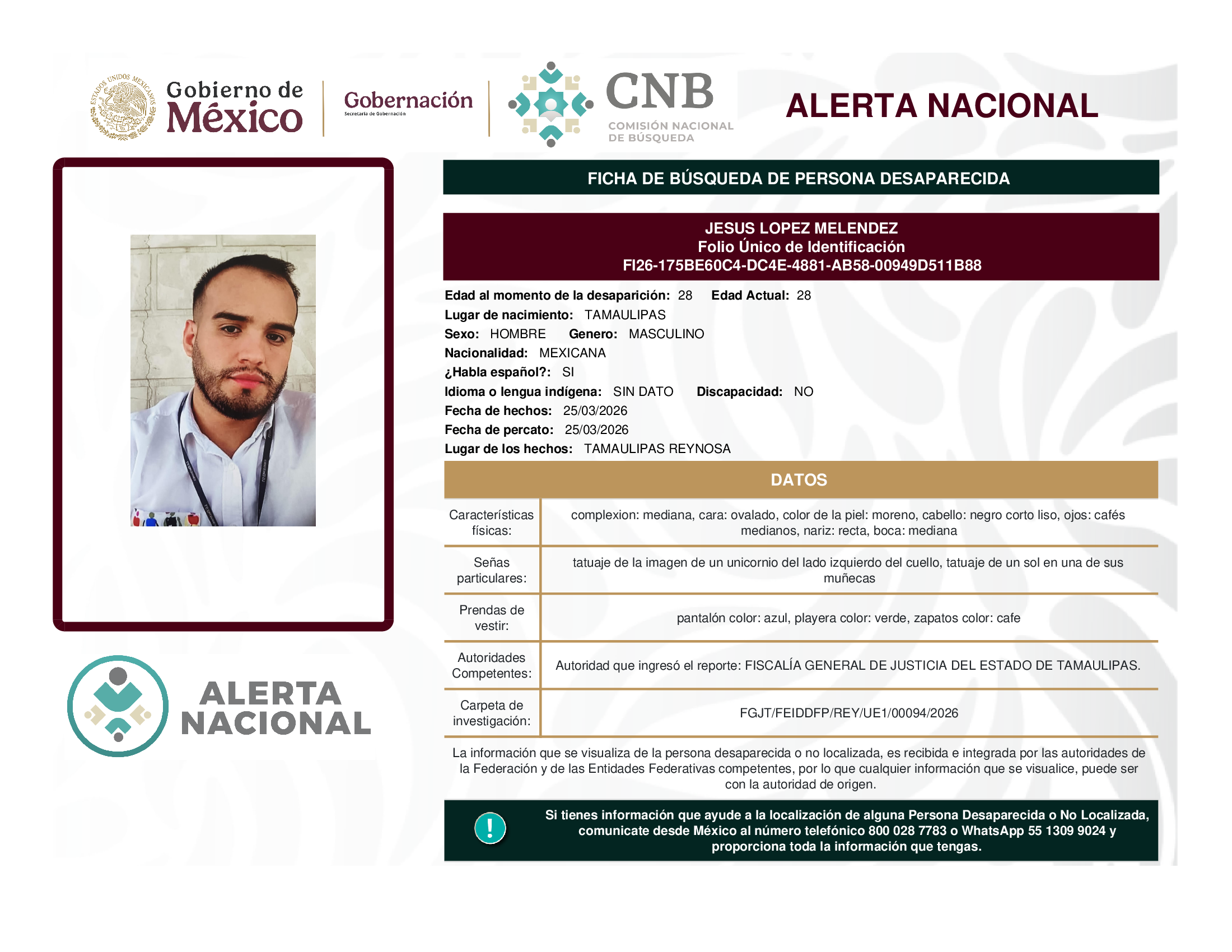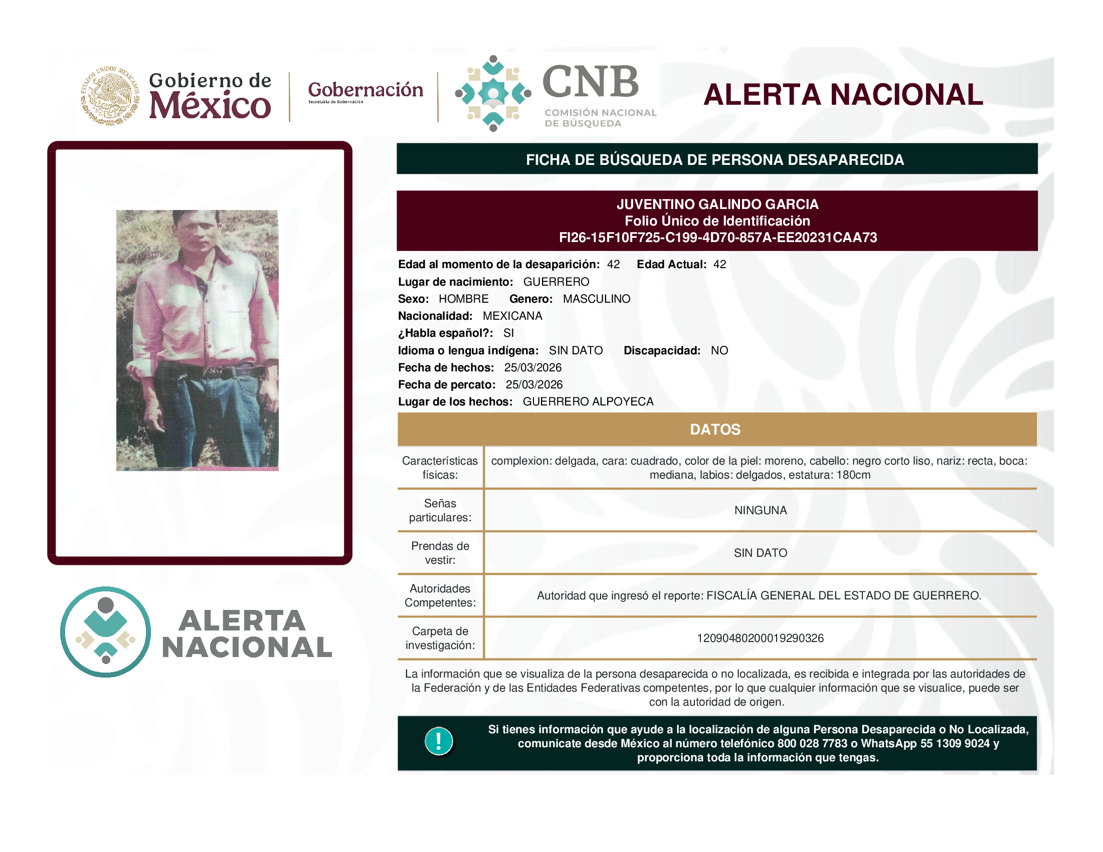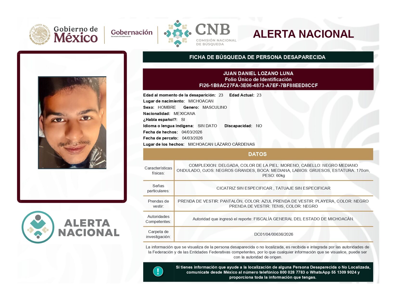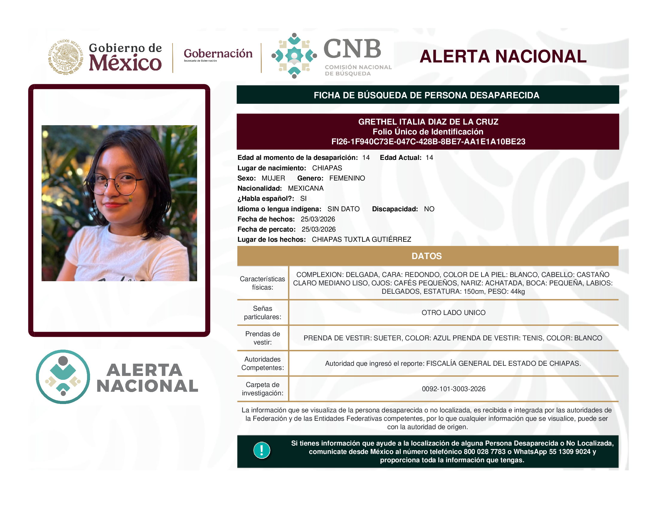 ALERTA NACIONAL DE BÚSQUEDA, LOCALIZACIÓN E IDENTIFICACIÓN DE PERSONAS DESAPARECIDAS Y NO LOCALIZADAS