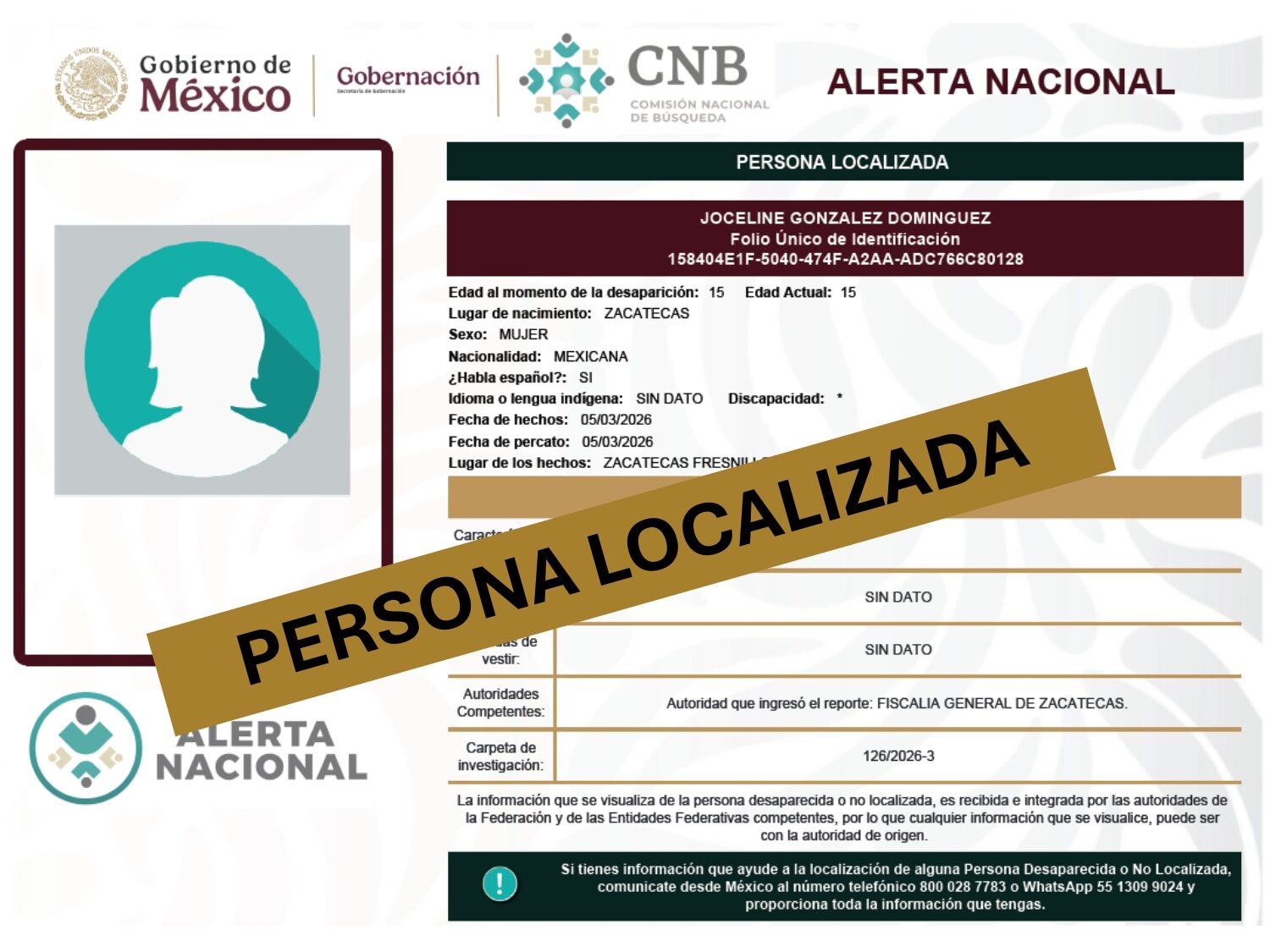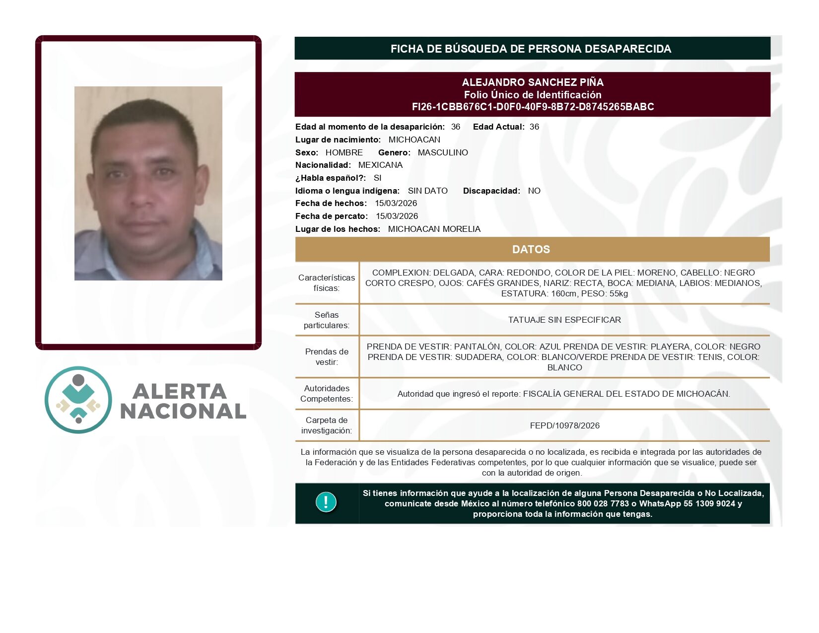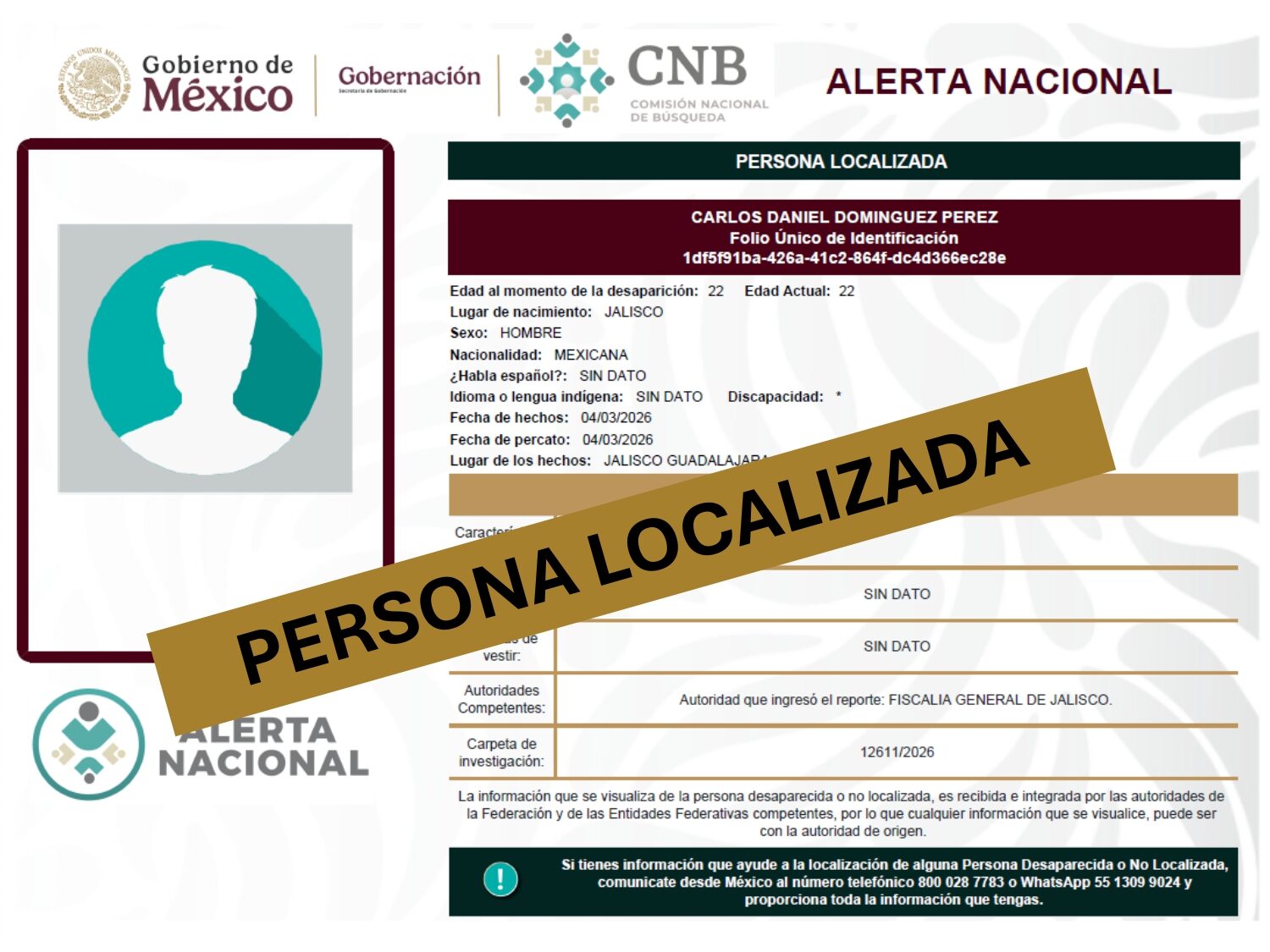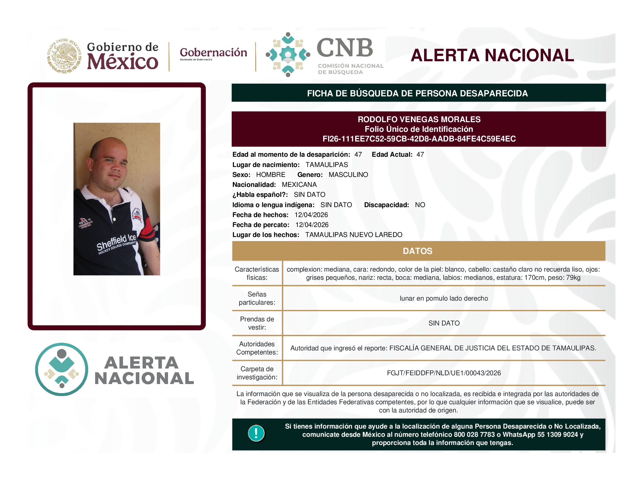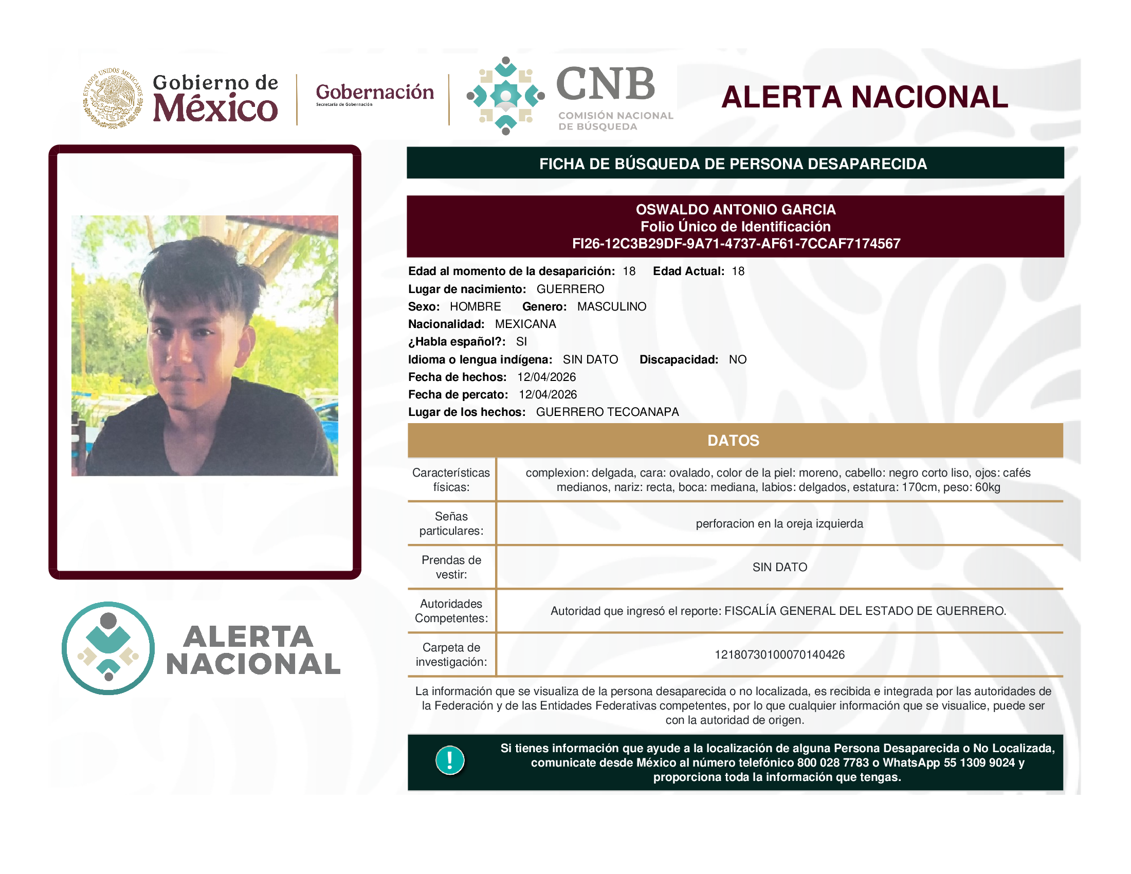ALERTA NACIONAL DE BÚSQUEDA, LOCALIZACIÓN E IDENTIFICACIÓN DE PERSONAS DESAPARECIDAS Y NO LOCALIZADAS