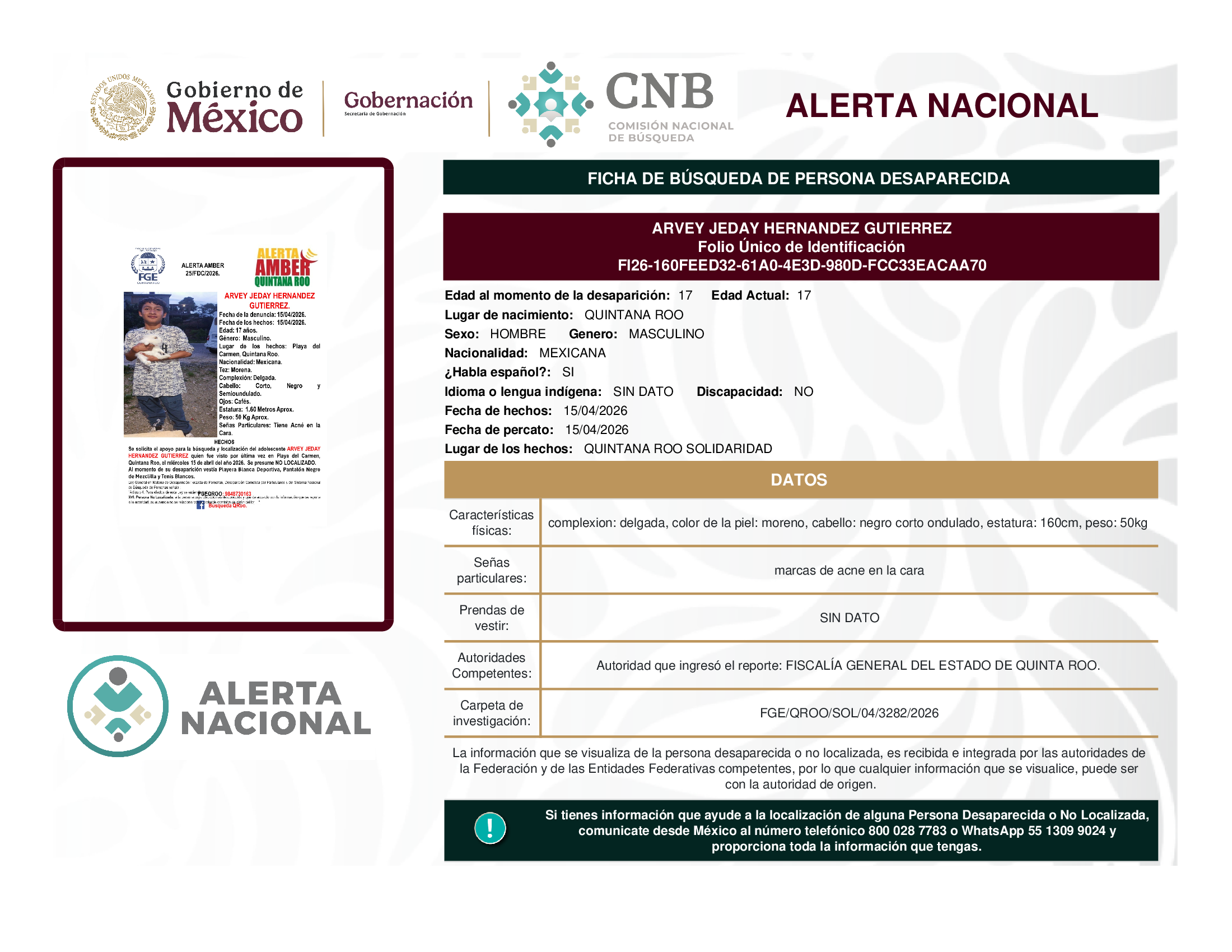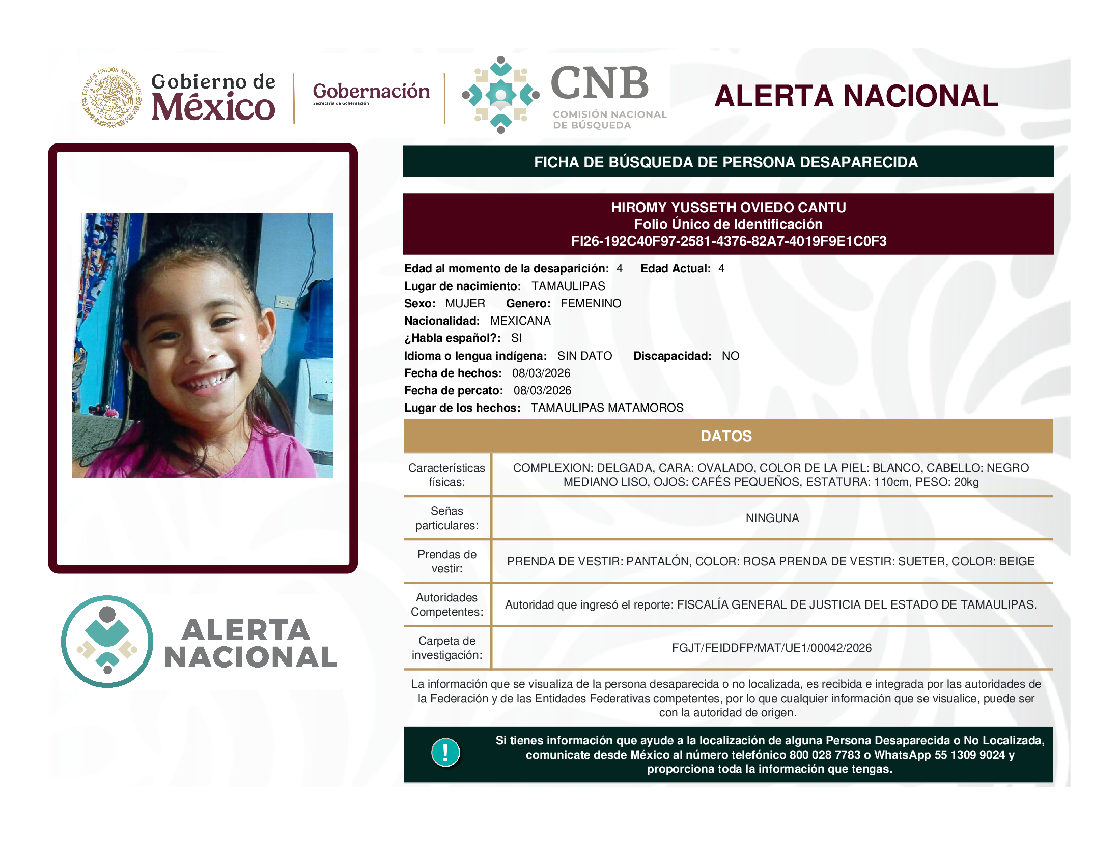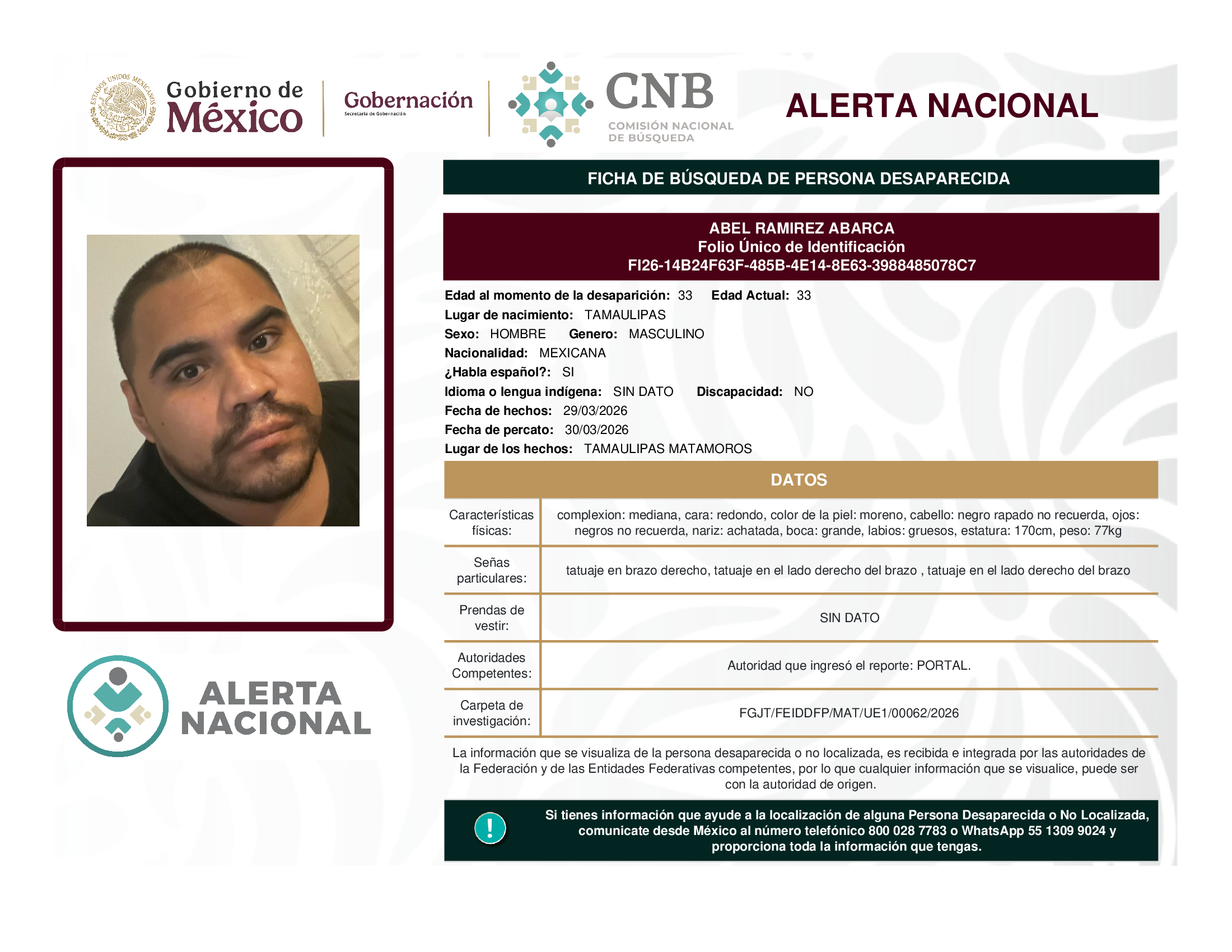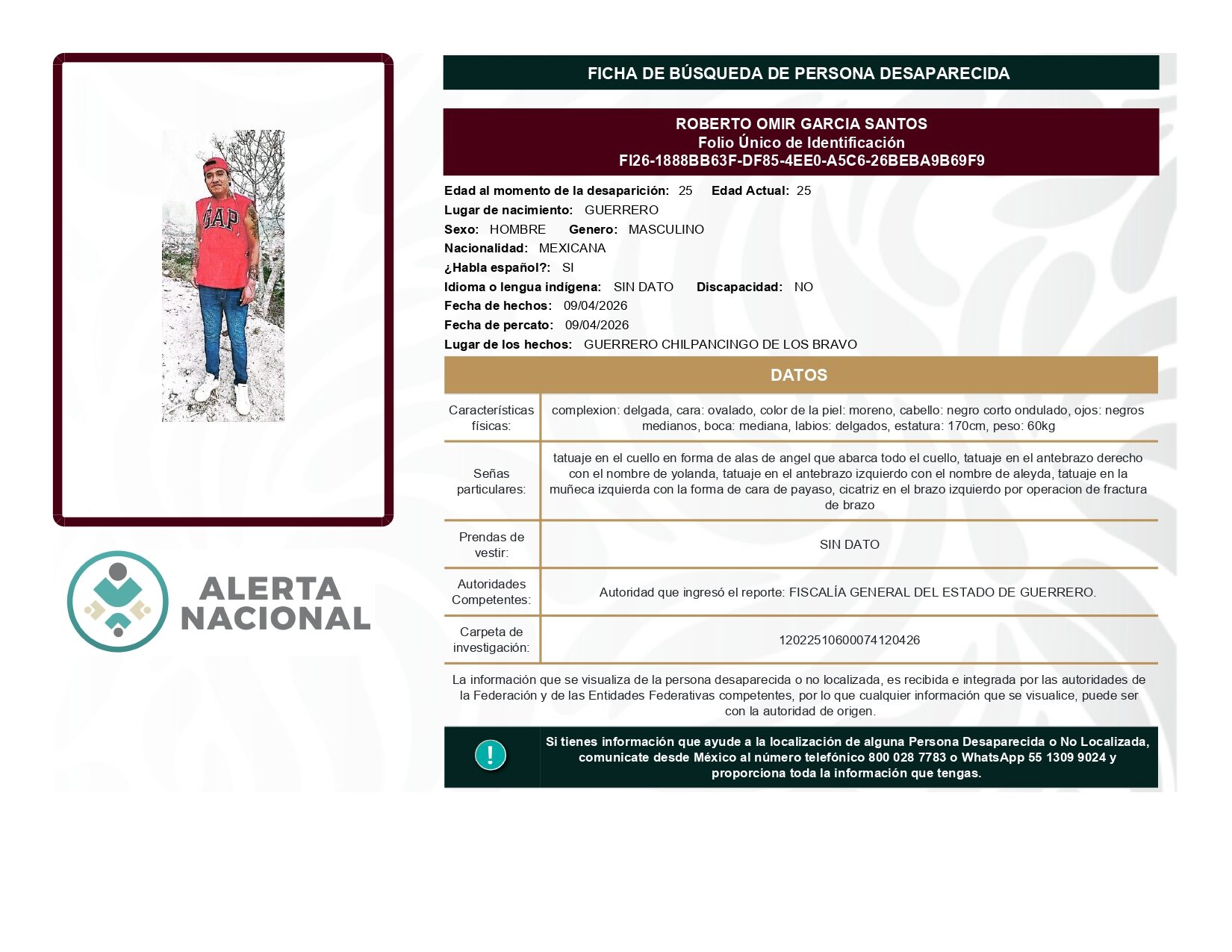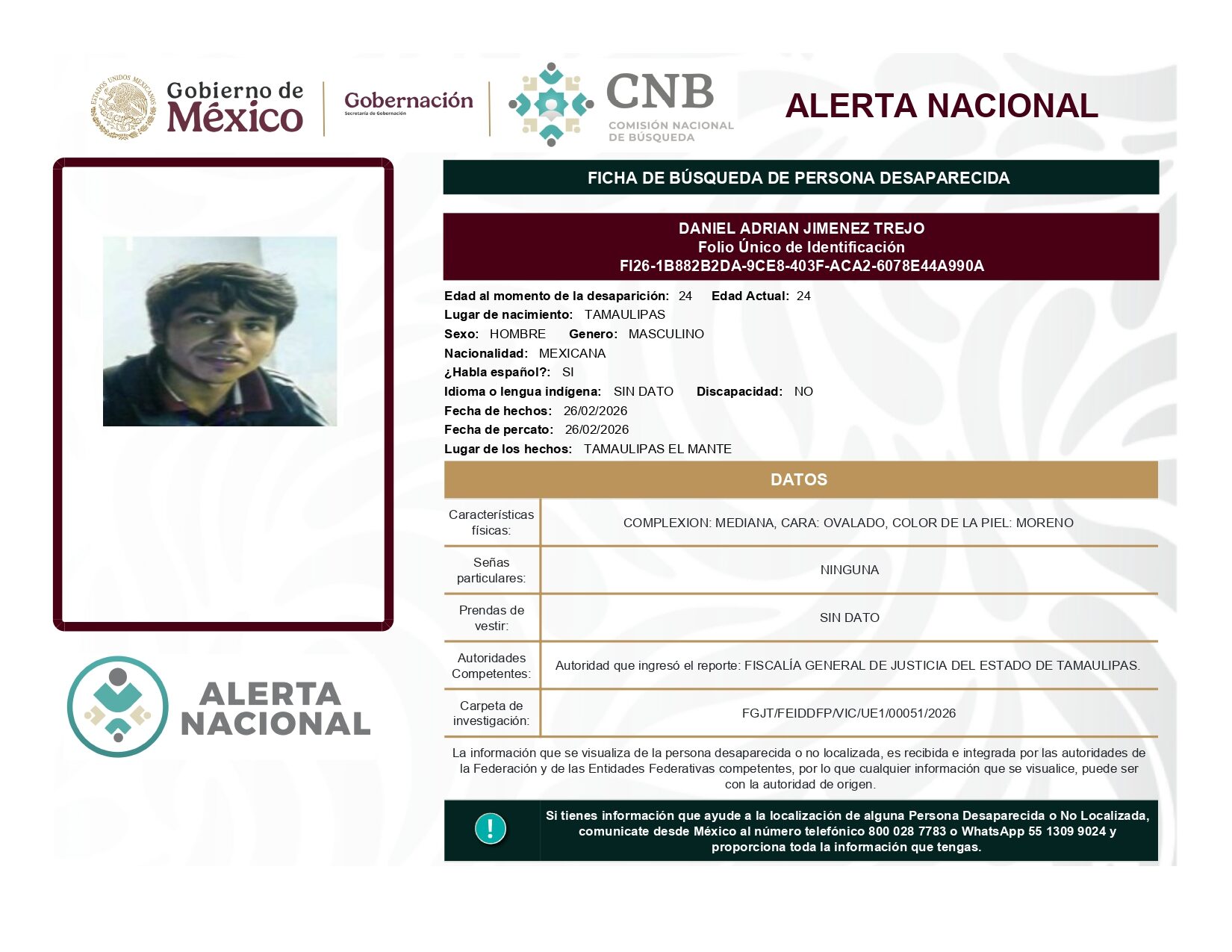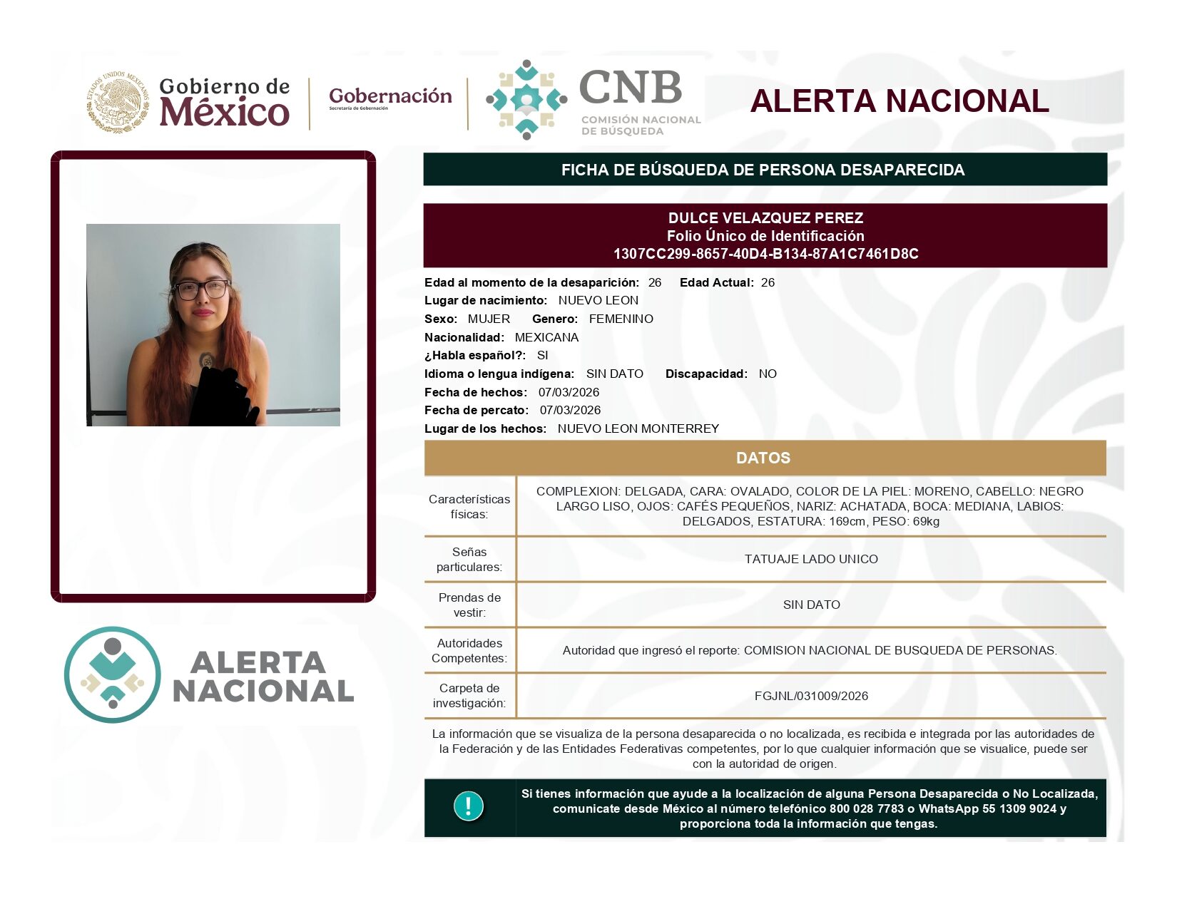 ALERTA NACIONAL DE BÚSQUEDA, LOCALIZACIÓN E IDENTIFICACIÓN DE PERSONAS DESAPARECIDAS Y NO LOCALIZADAS