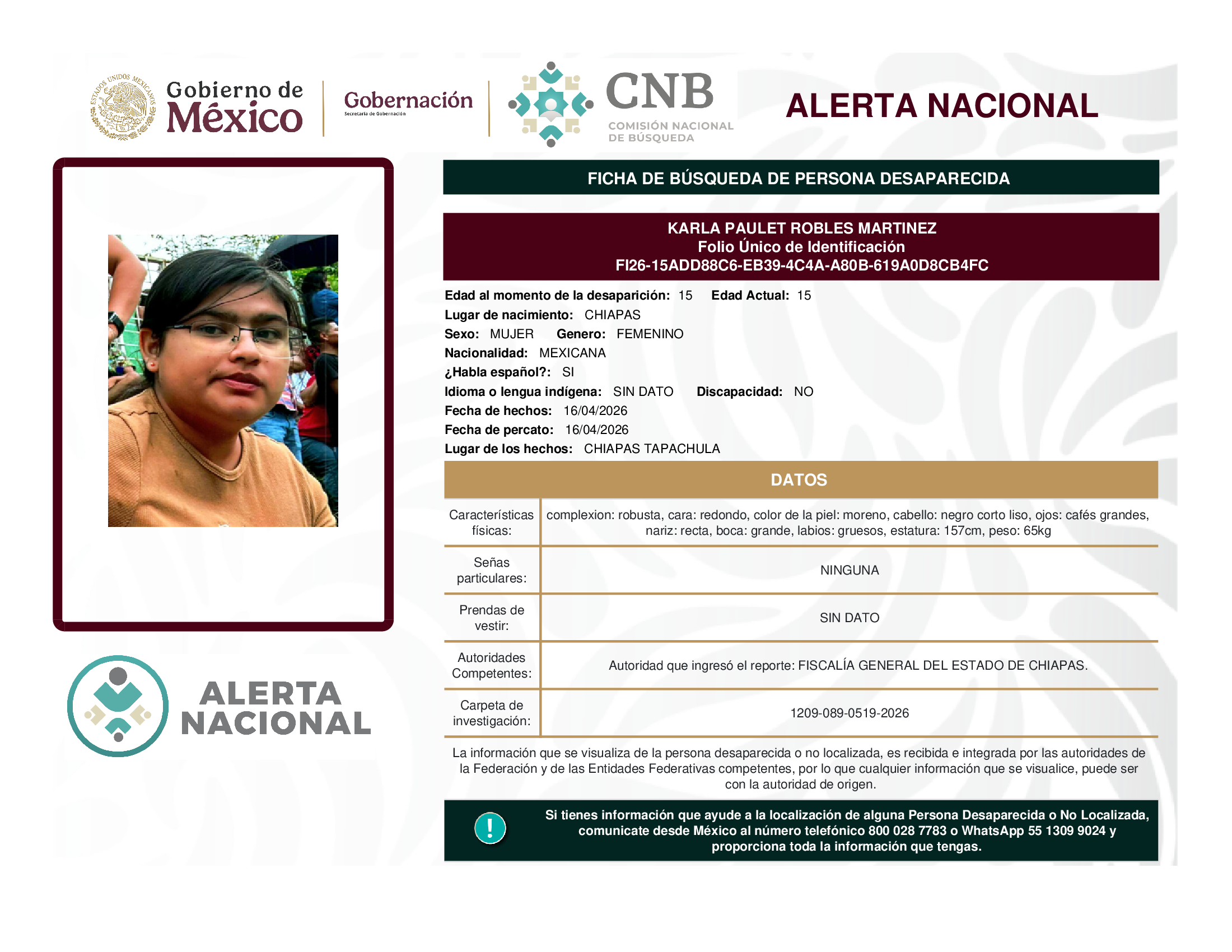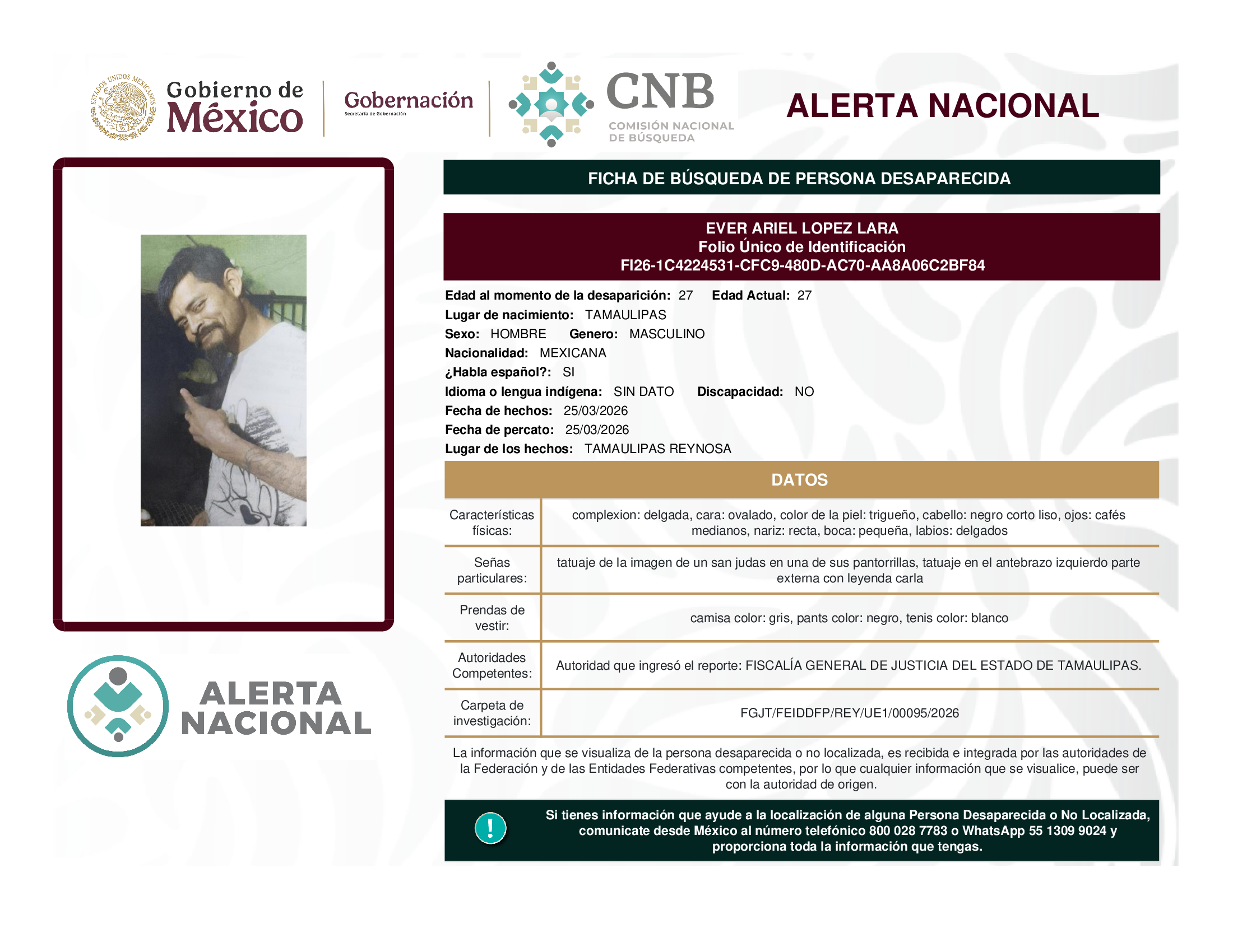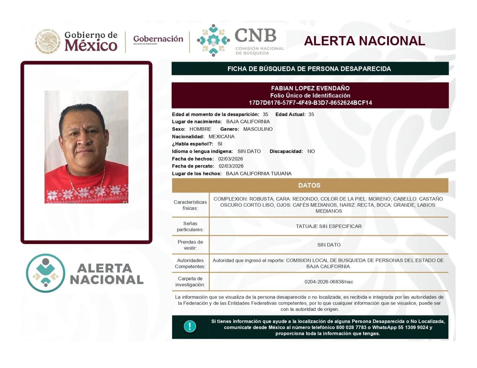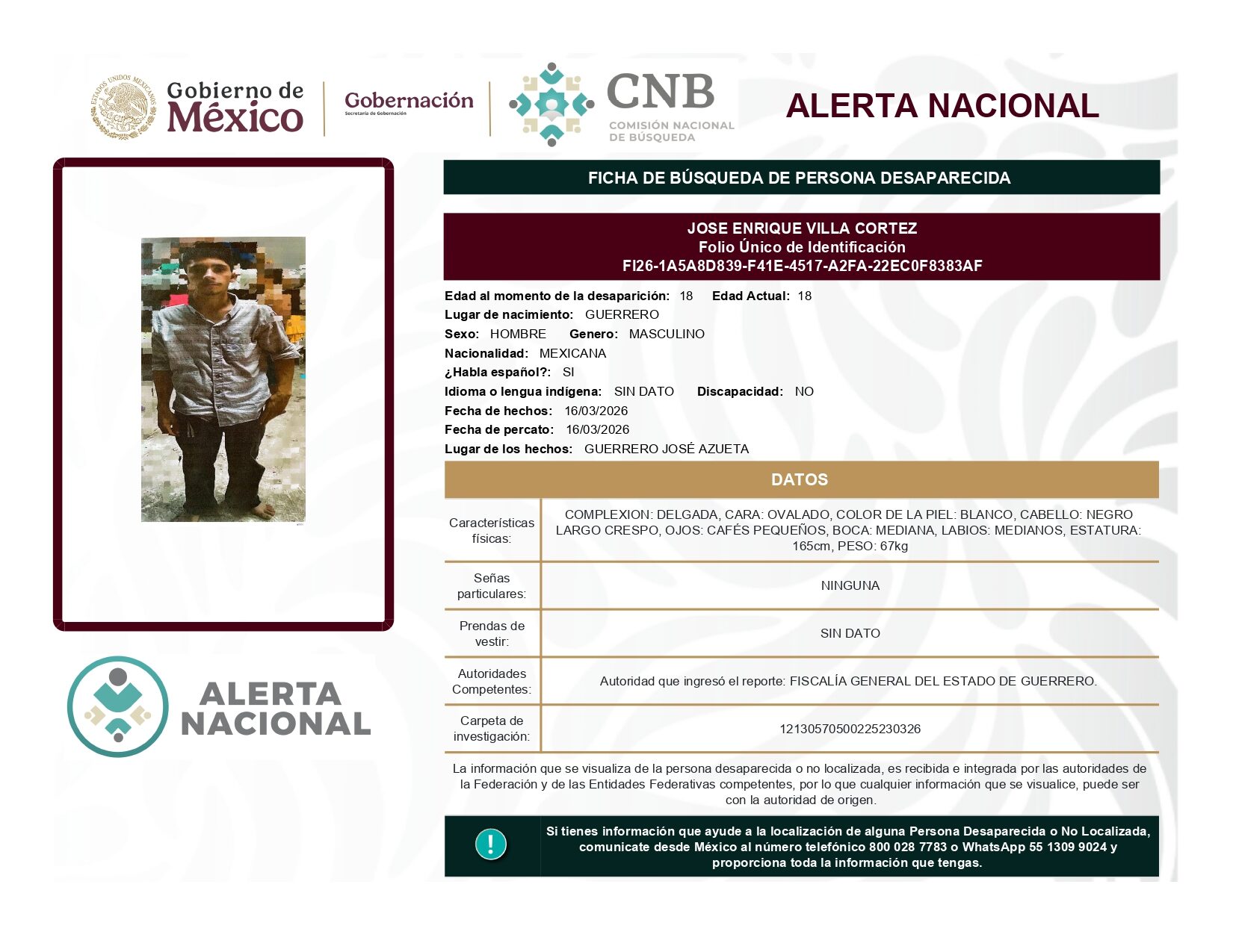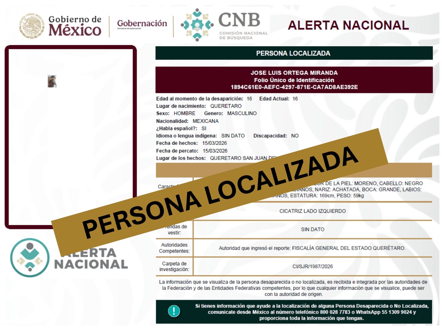 ALERTA NACIONAL DE BÚSQUEDA, LOCALIZACIÓN E IDENTIFICACIÓN DE PERSONAS DESAPARECIDAS Y NO LOCALIZADAS