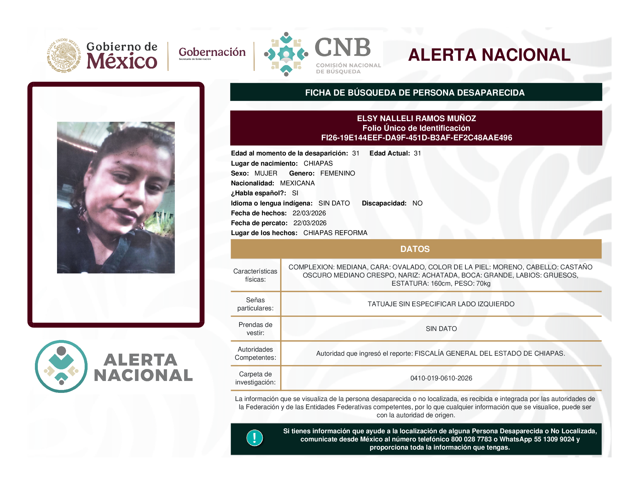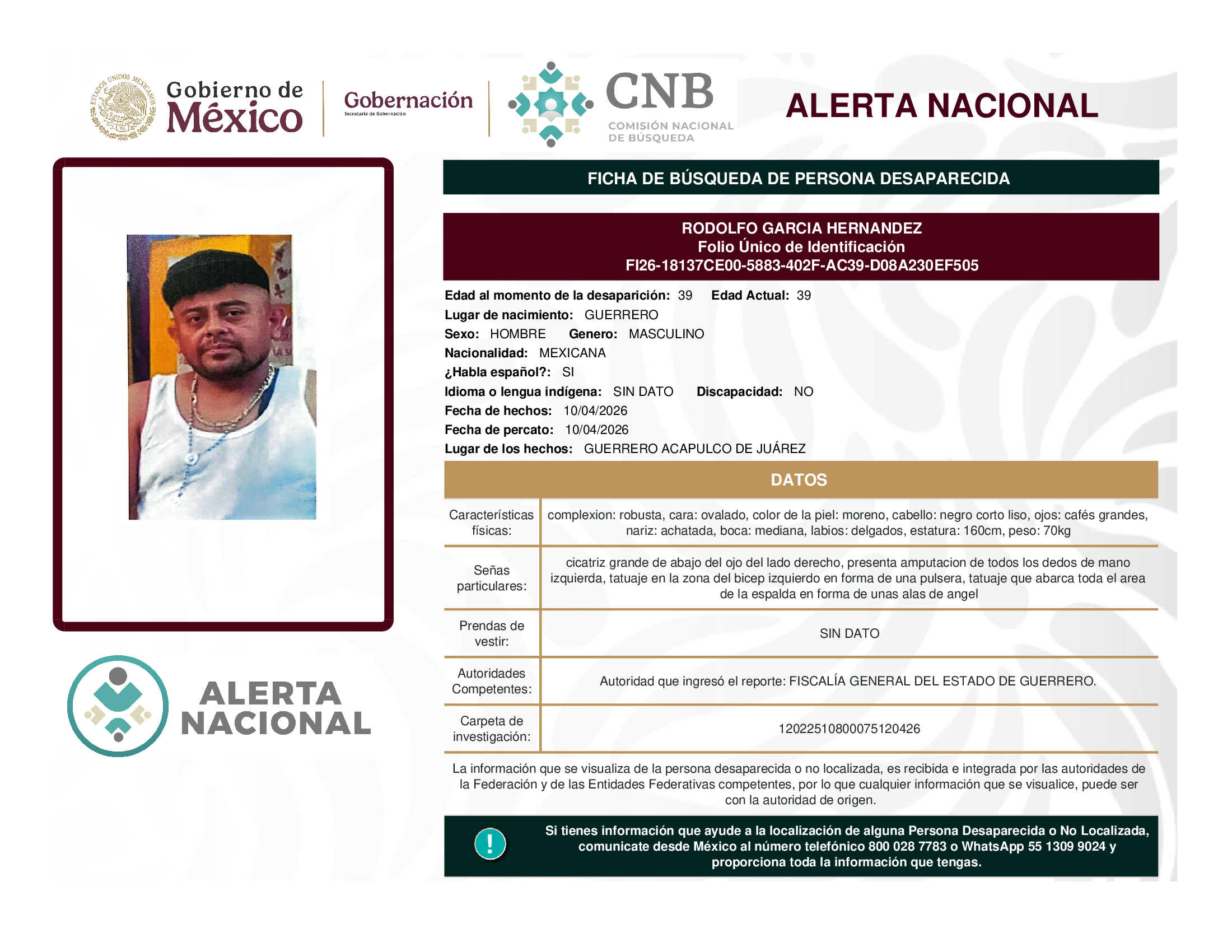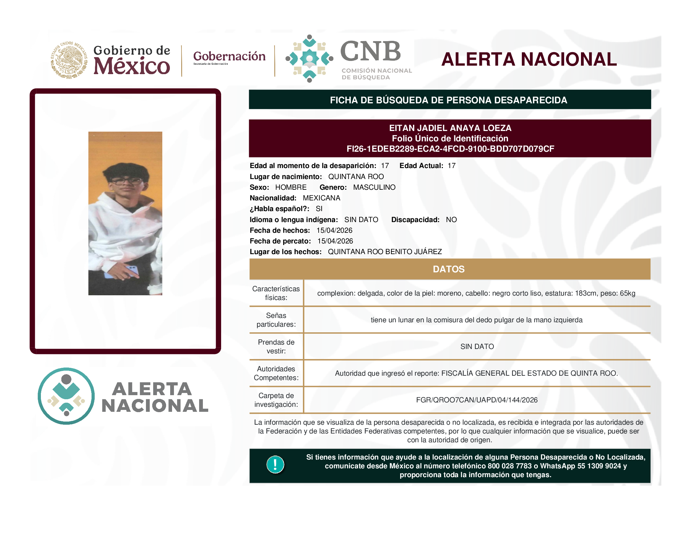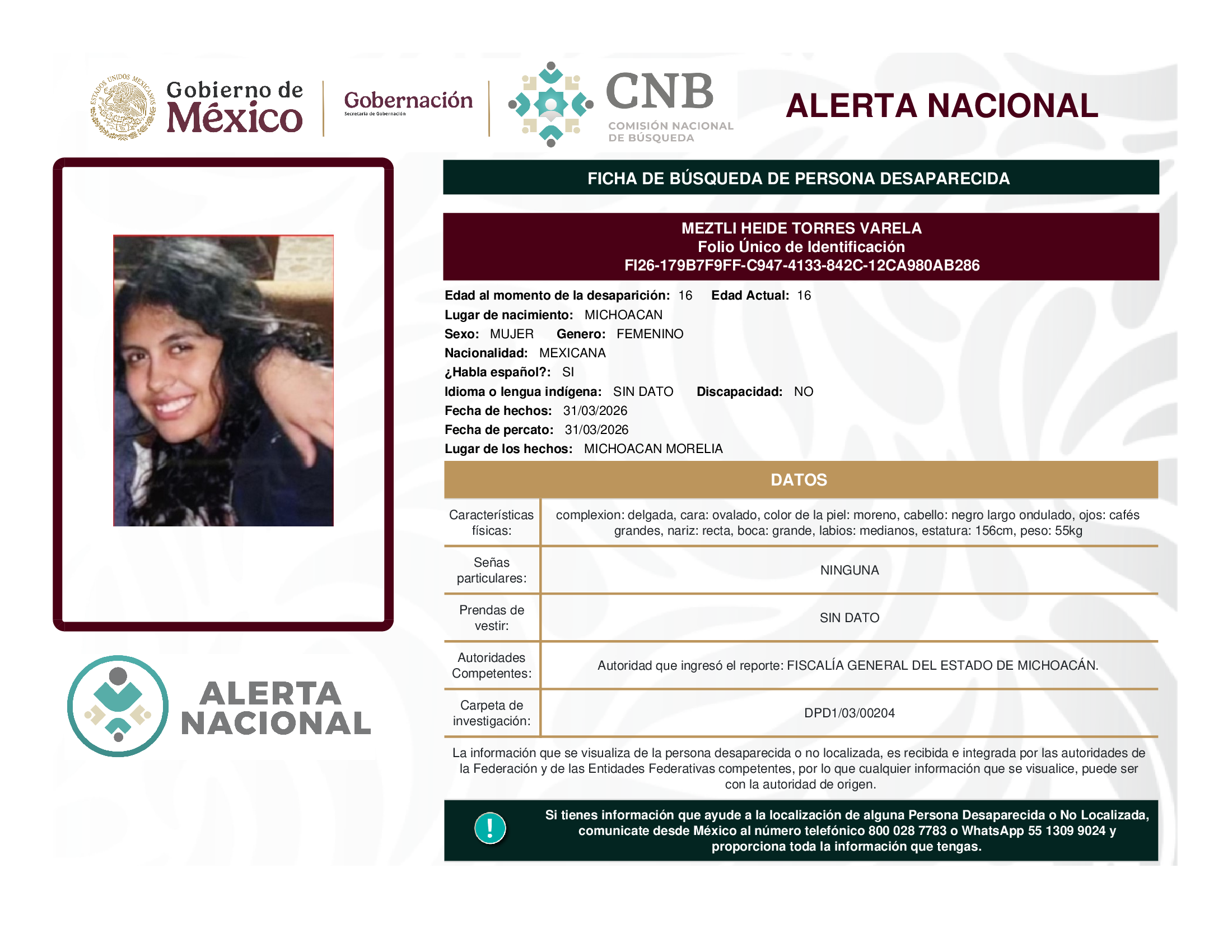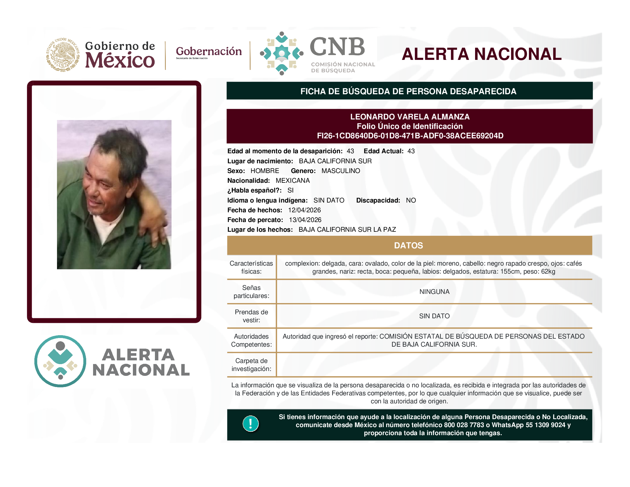 ALERTA NACIONAL DE BÚSQUEDA, LOCALIZACIÓN E IDENTIFICACIÓN DE PERSONAS DESAPARECIDAS Y NO LOCALIZADAS