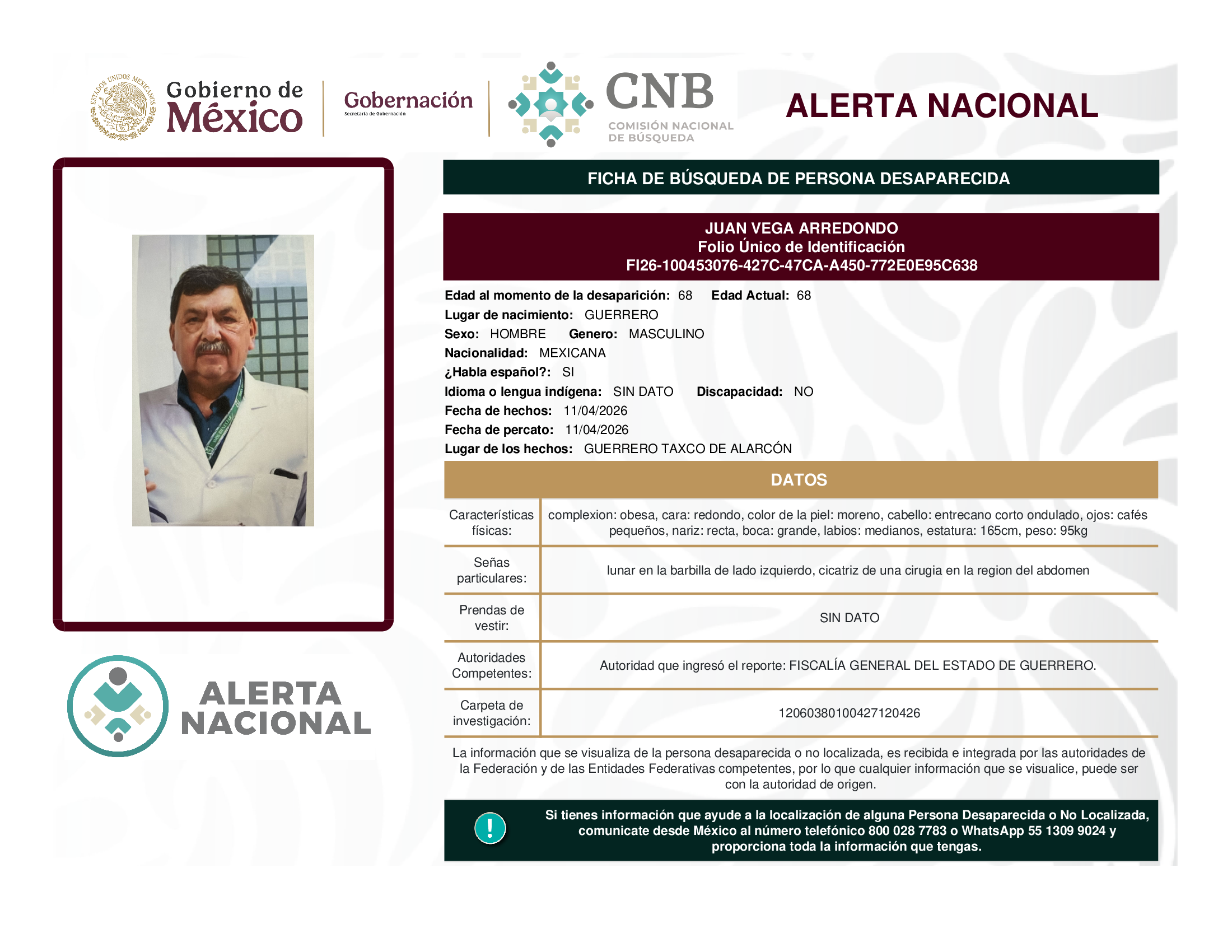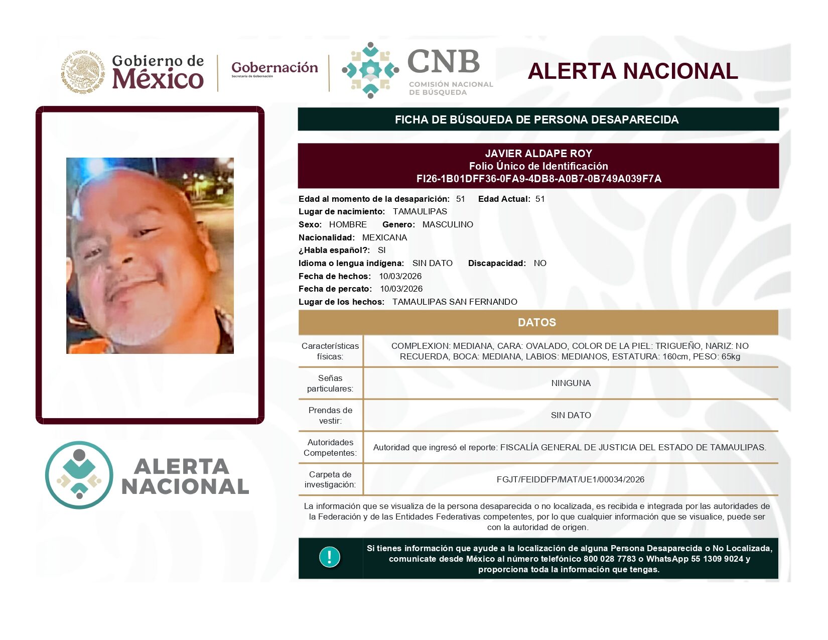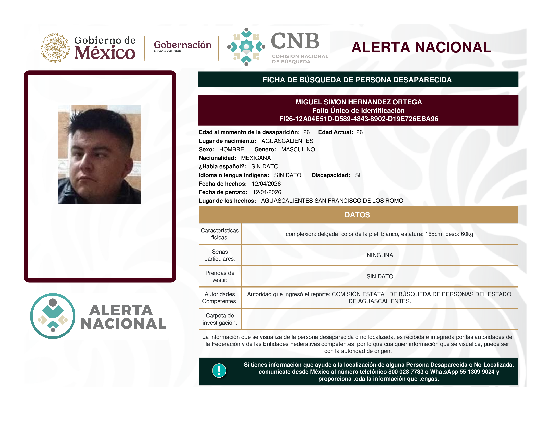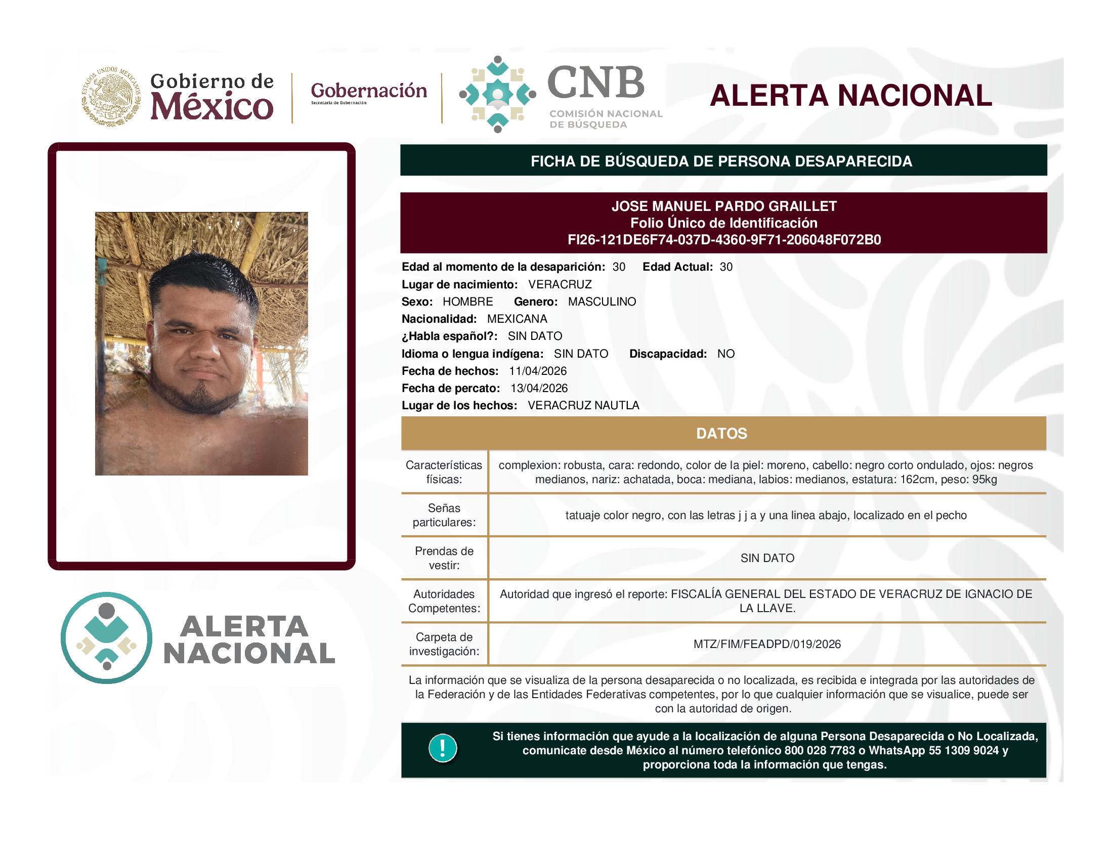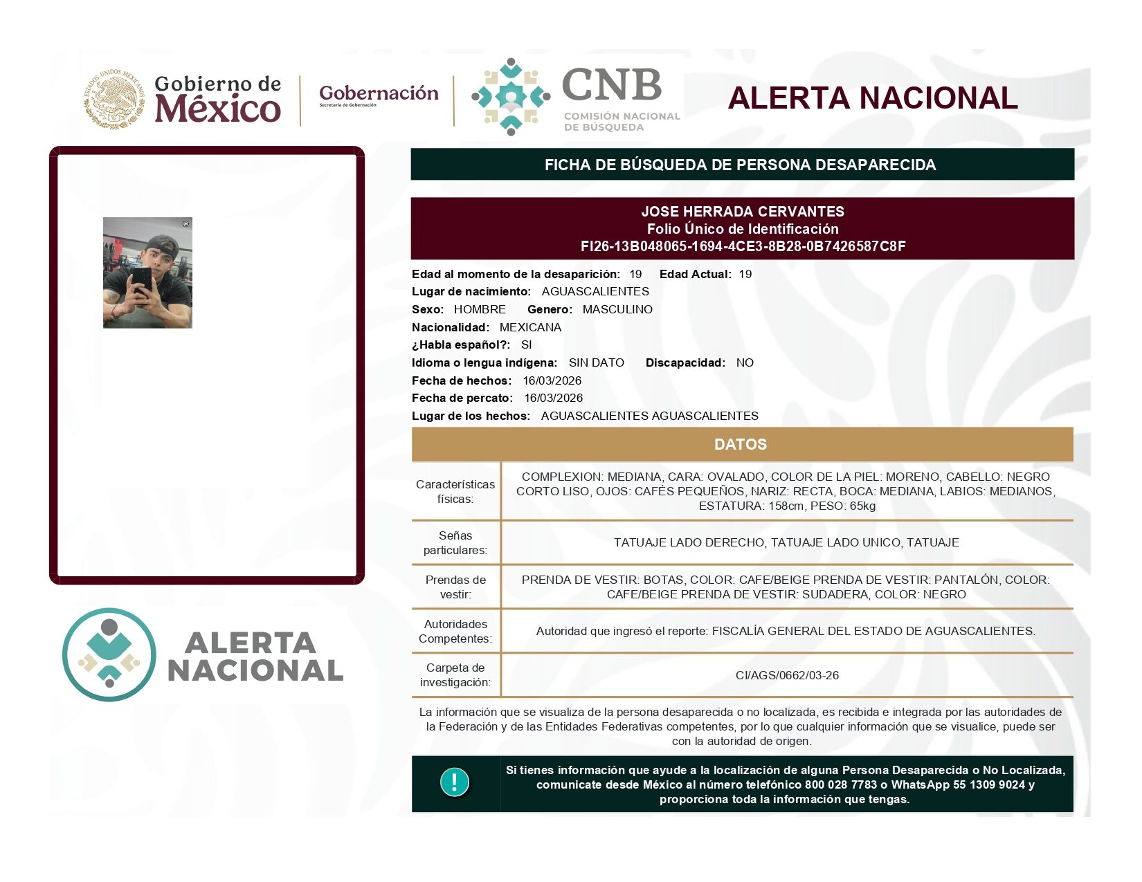 ALERTA NACIONAL DE BÚSQUEDA, LOCALIZACIÓN E IDENTIFICACIÓN DE PERSONAS DESAPARECIDAS Y NO LOCALIZADAS
