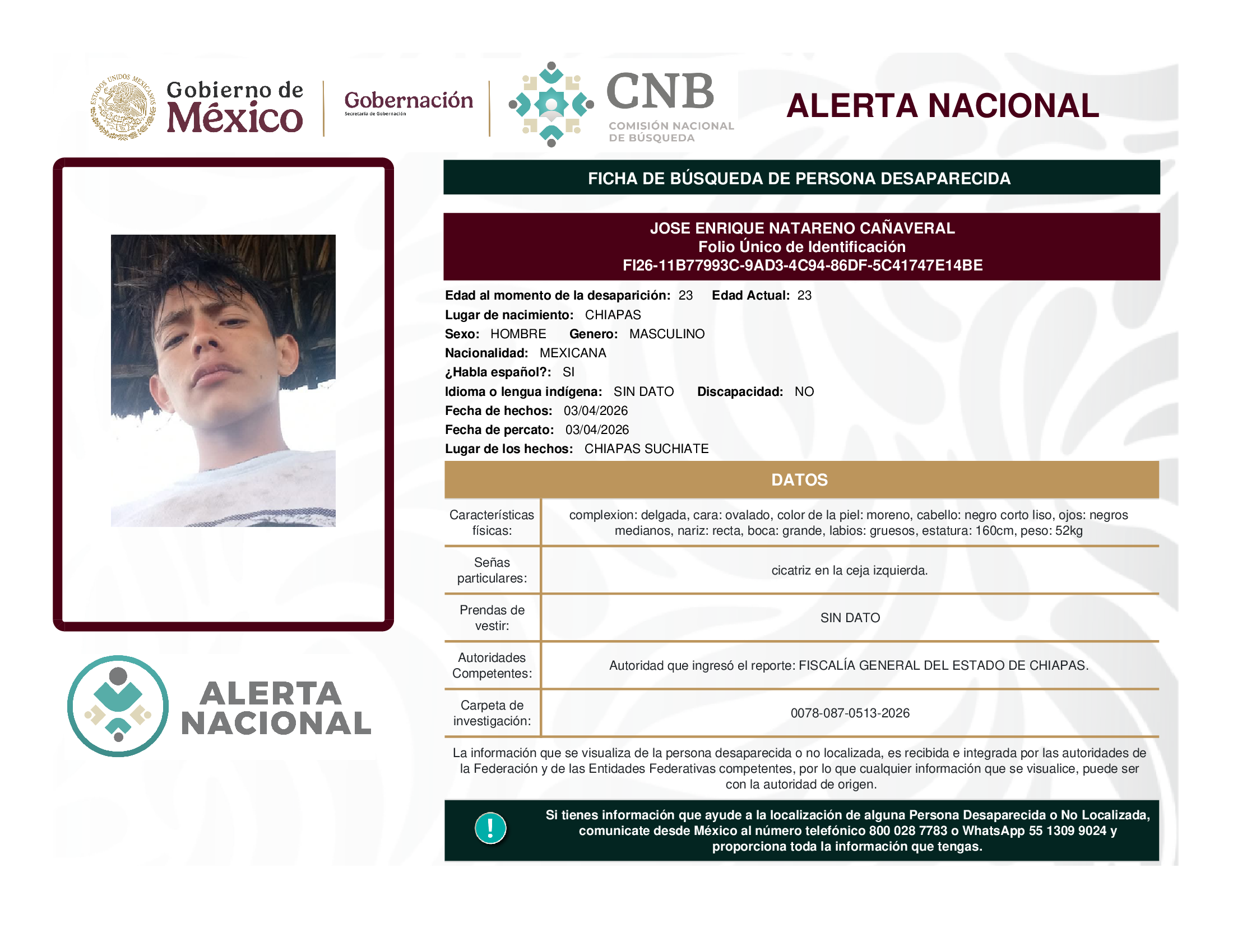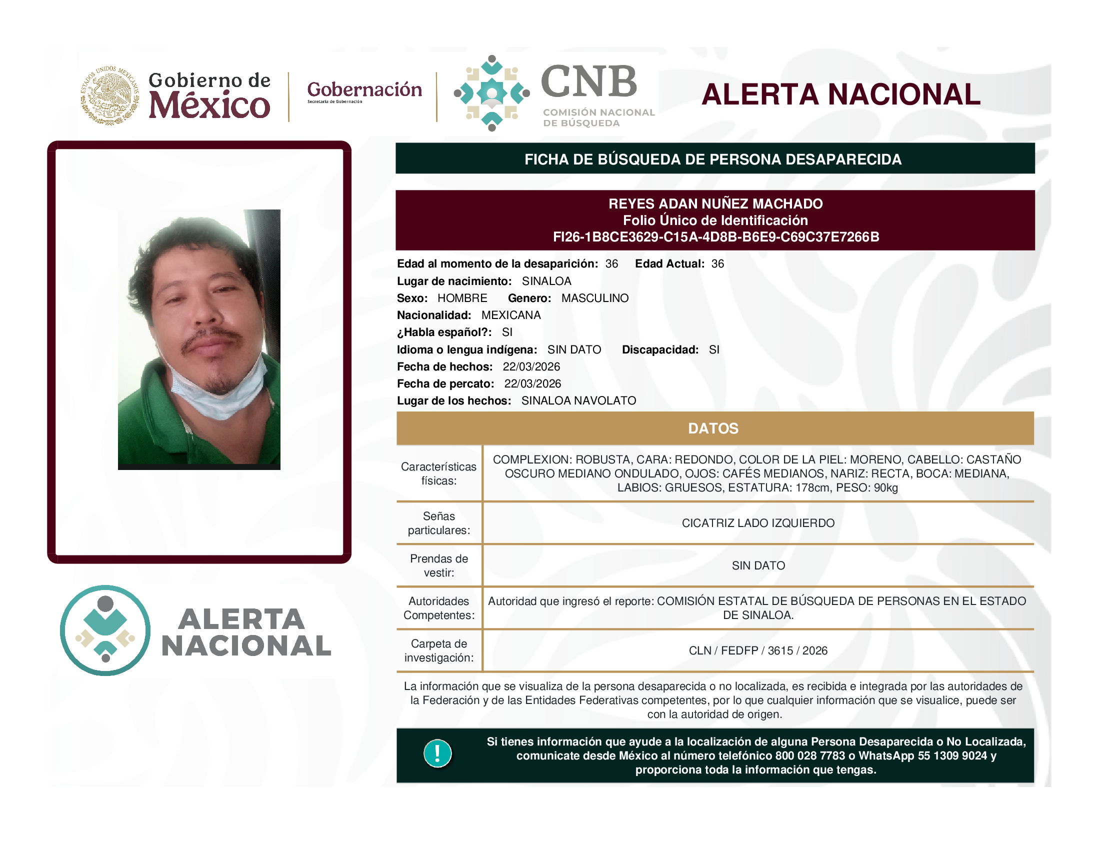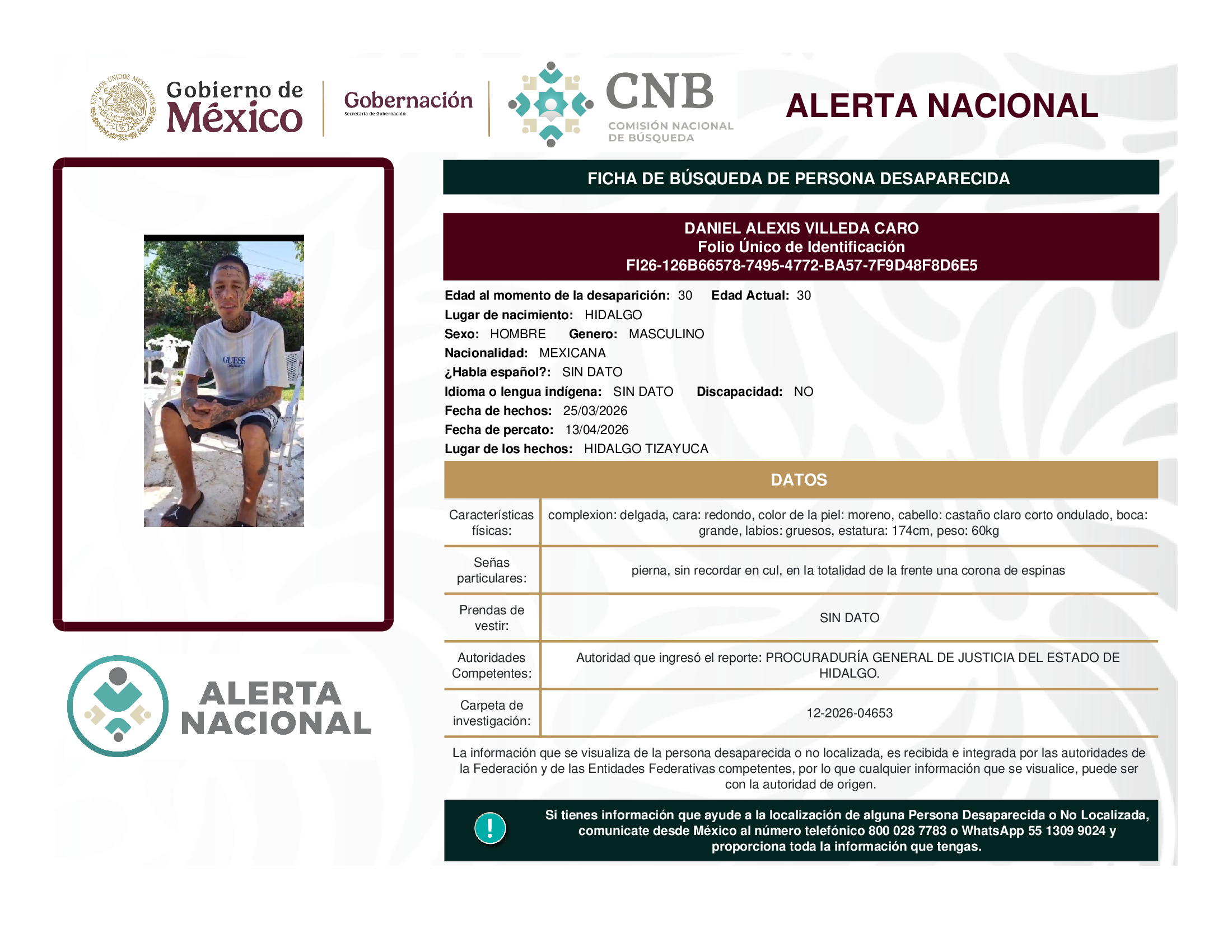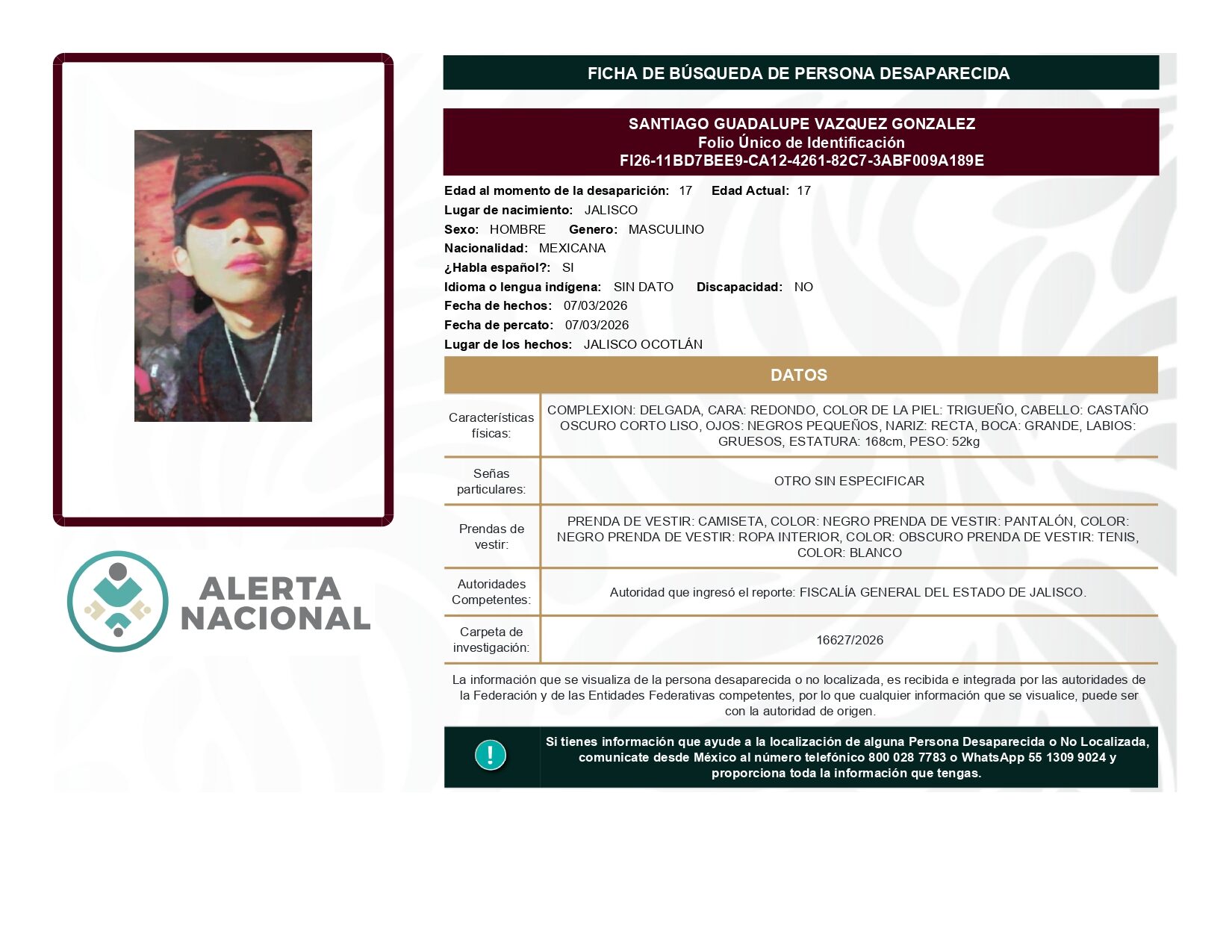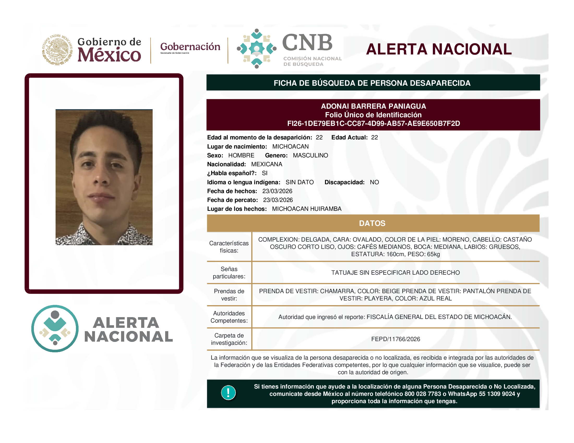 ALERTA NACIONAL DE BÚSQUEDA, LOCALIZACIÓN E IDENTIFICACIÓN DE PERSONAS DESAPARECIDAS Y NO LOCALIZADAS