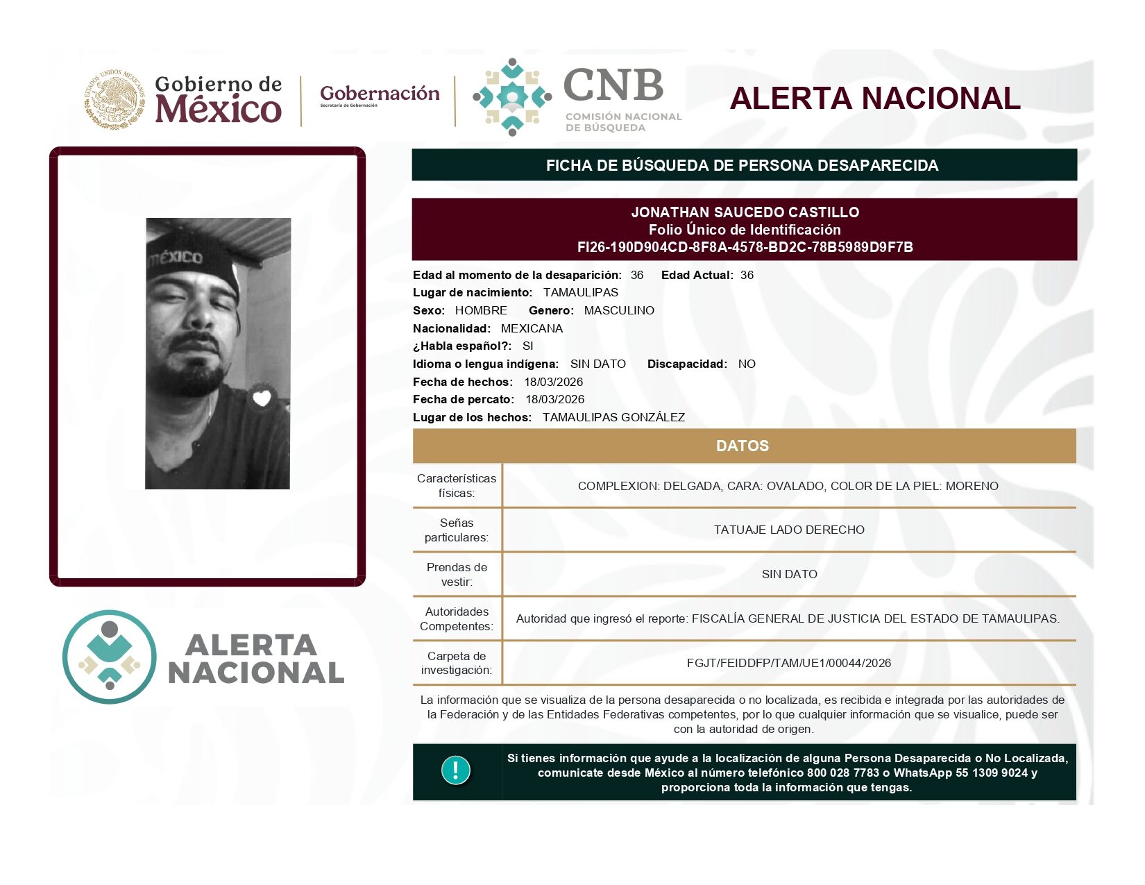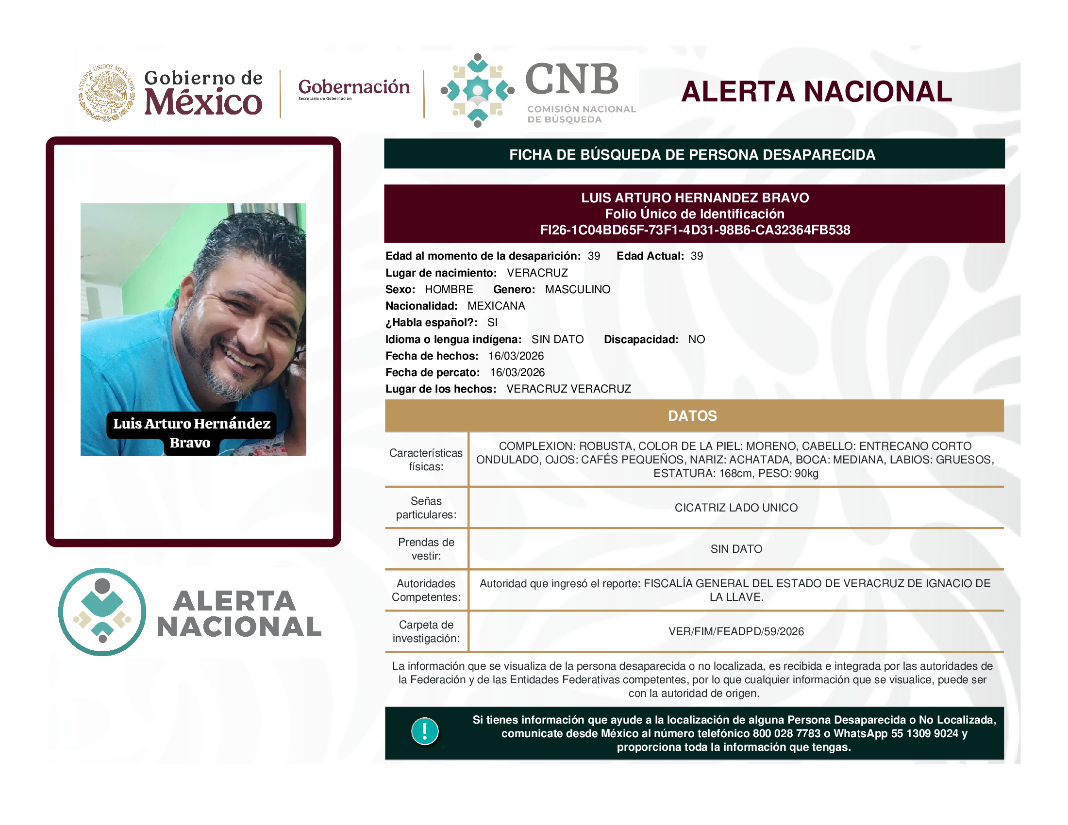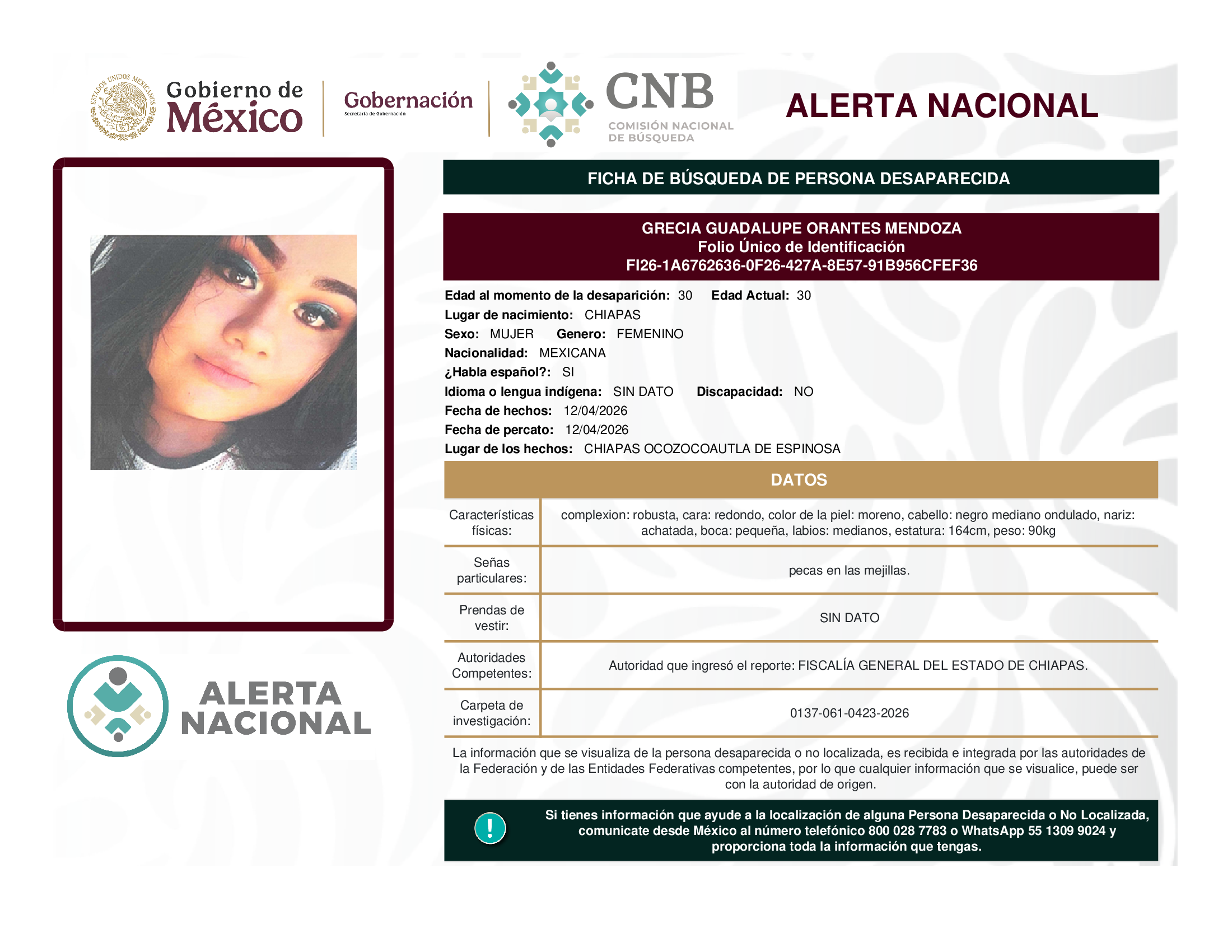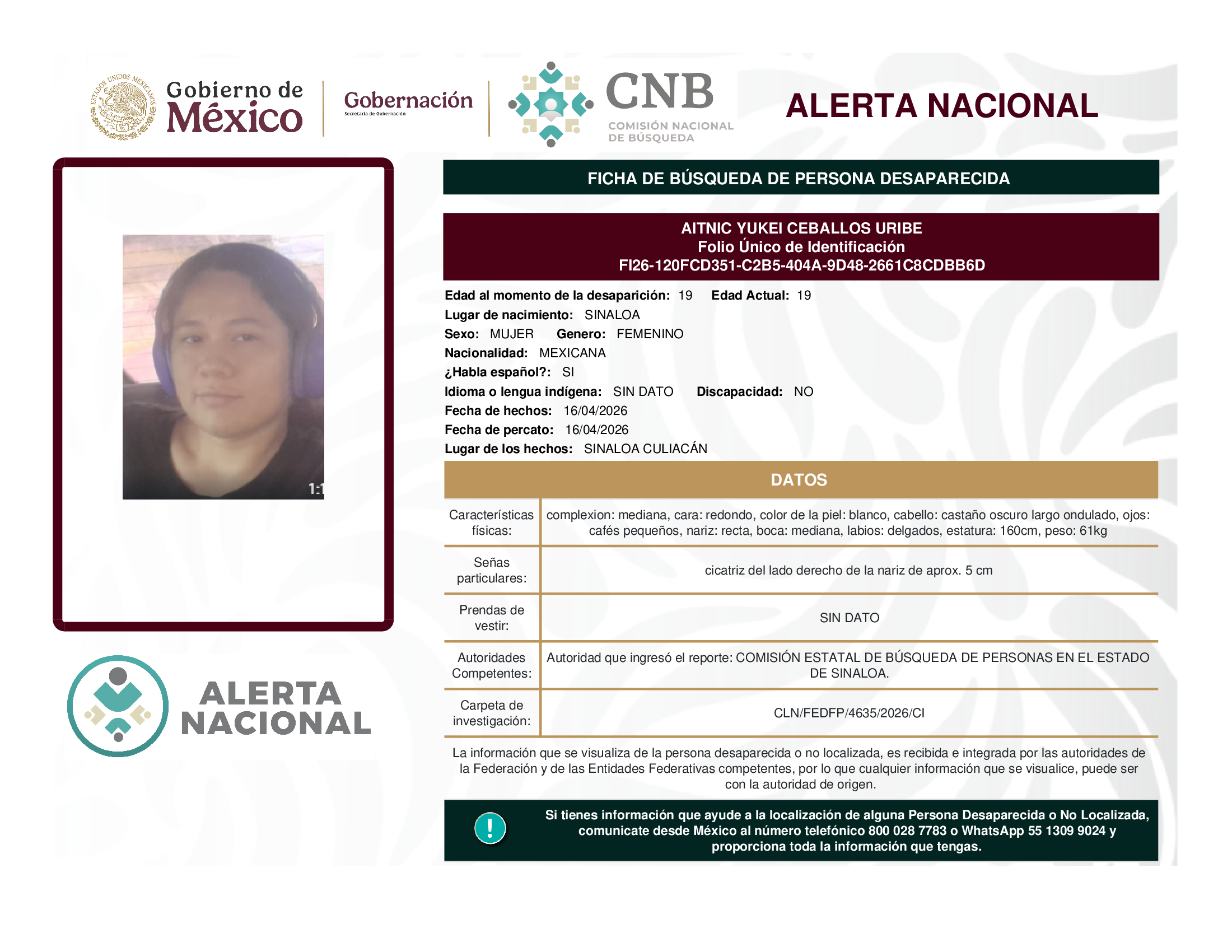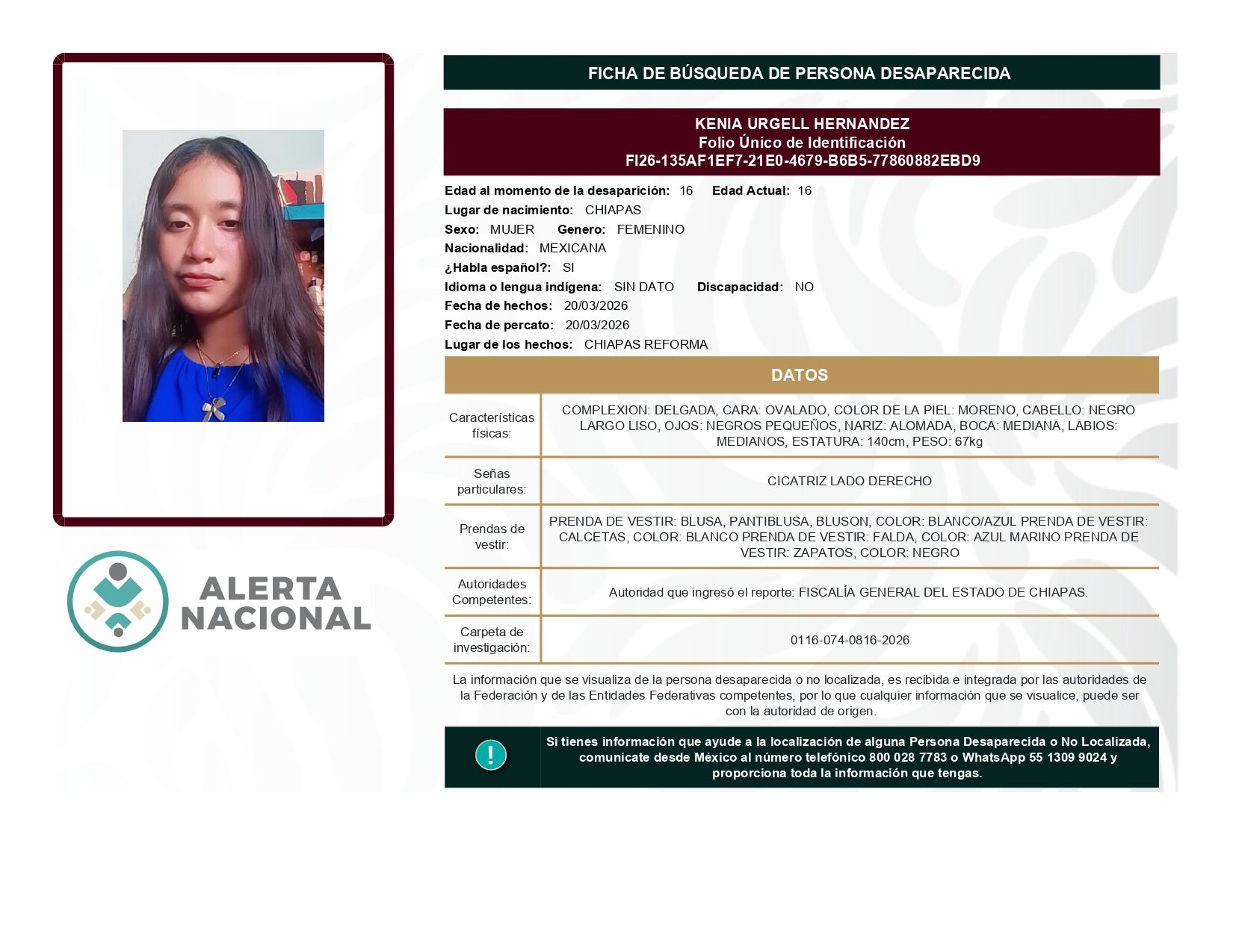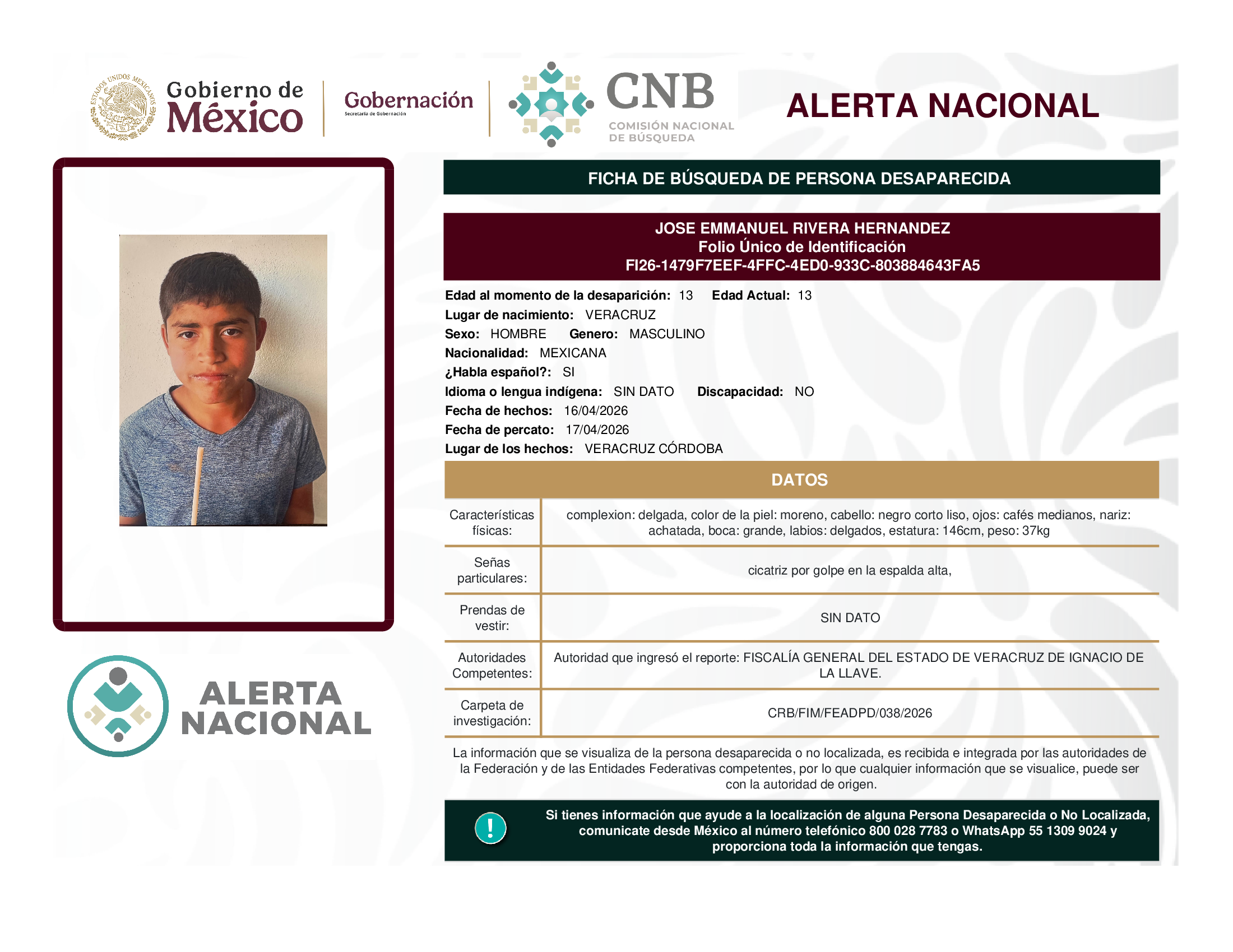 ALERTA NACIONAL DE BÚSQUEDA, LOCALIZACIÓN E IDENTIFICACIÓN DE PERSONAS DESAPARECIDAS Y NO LOCALIZADAS