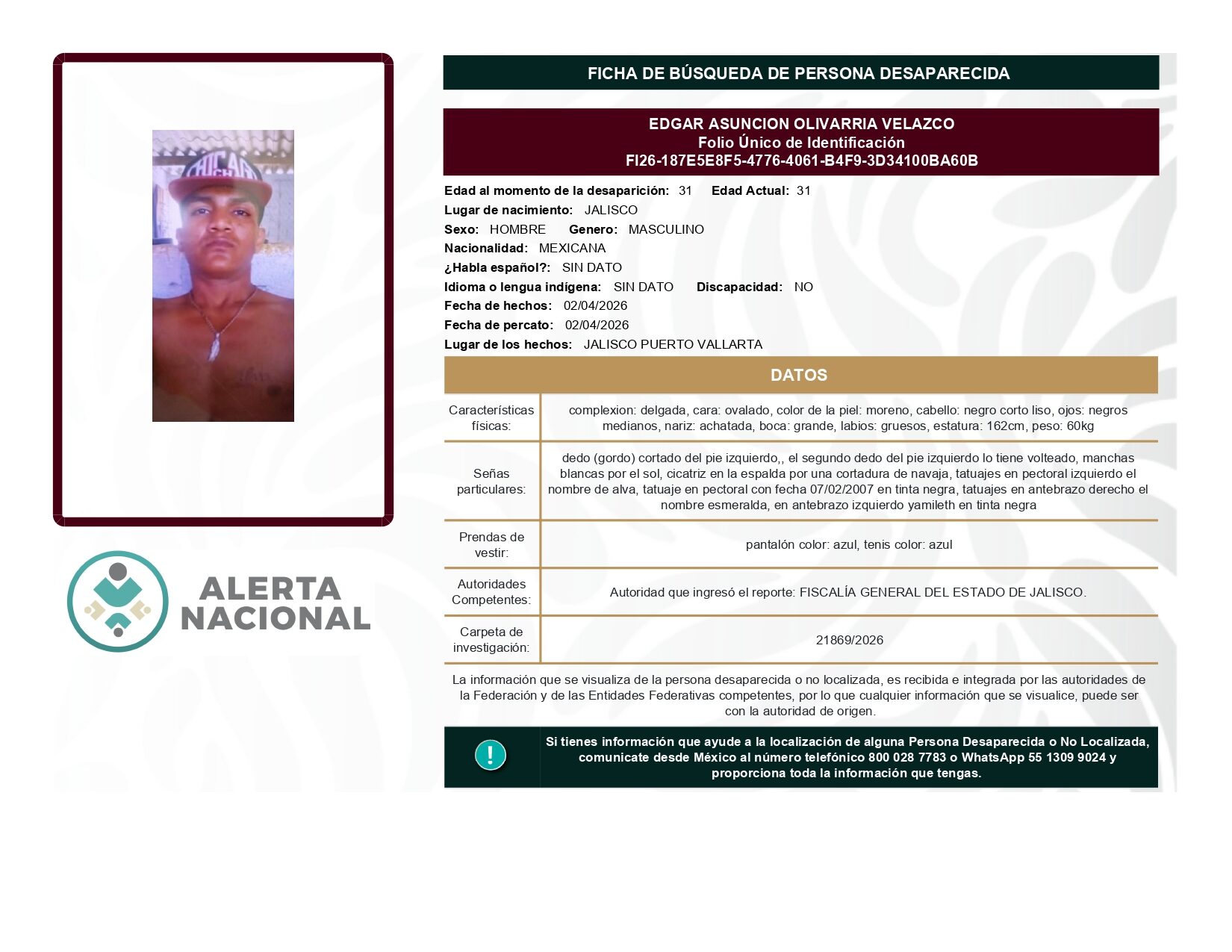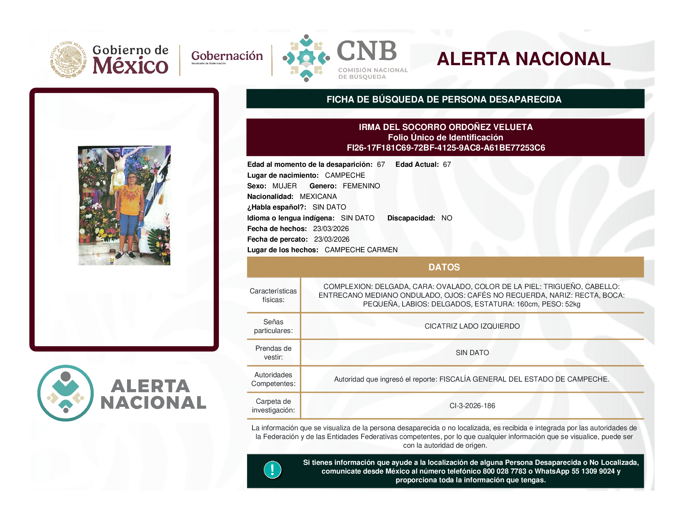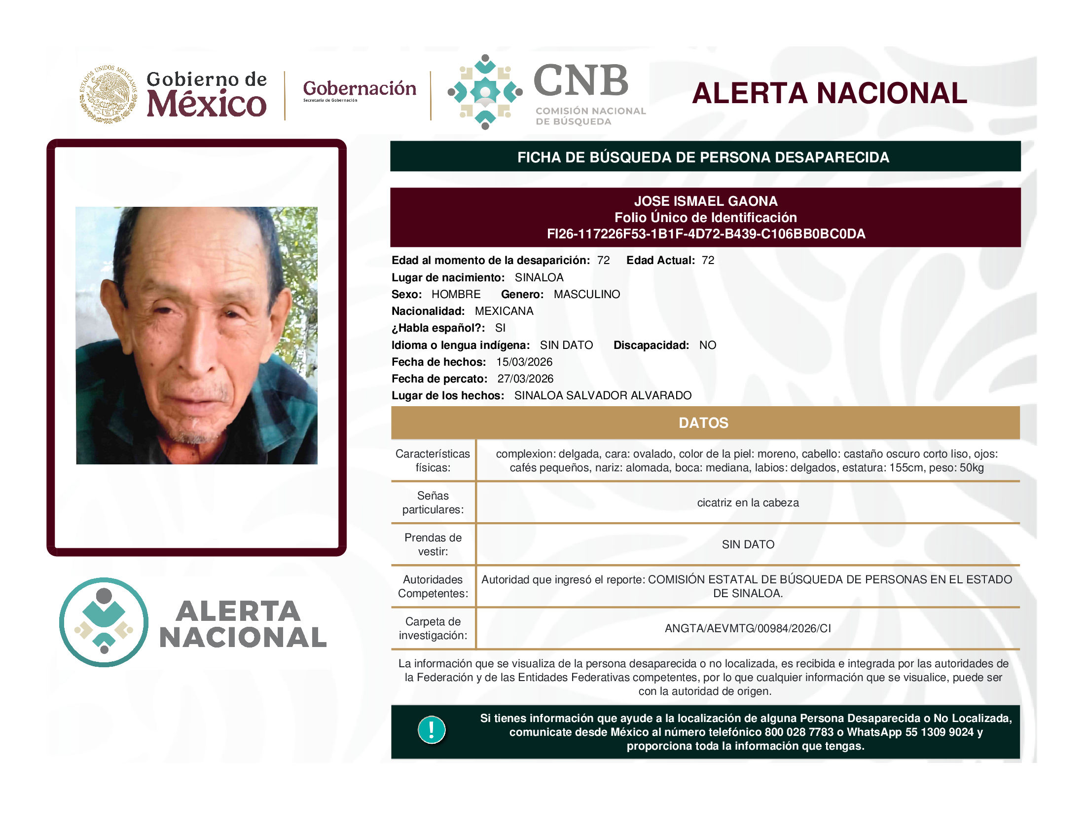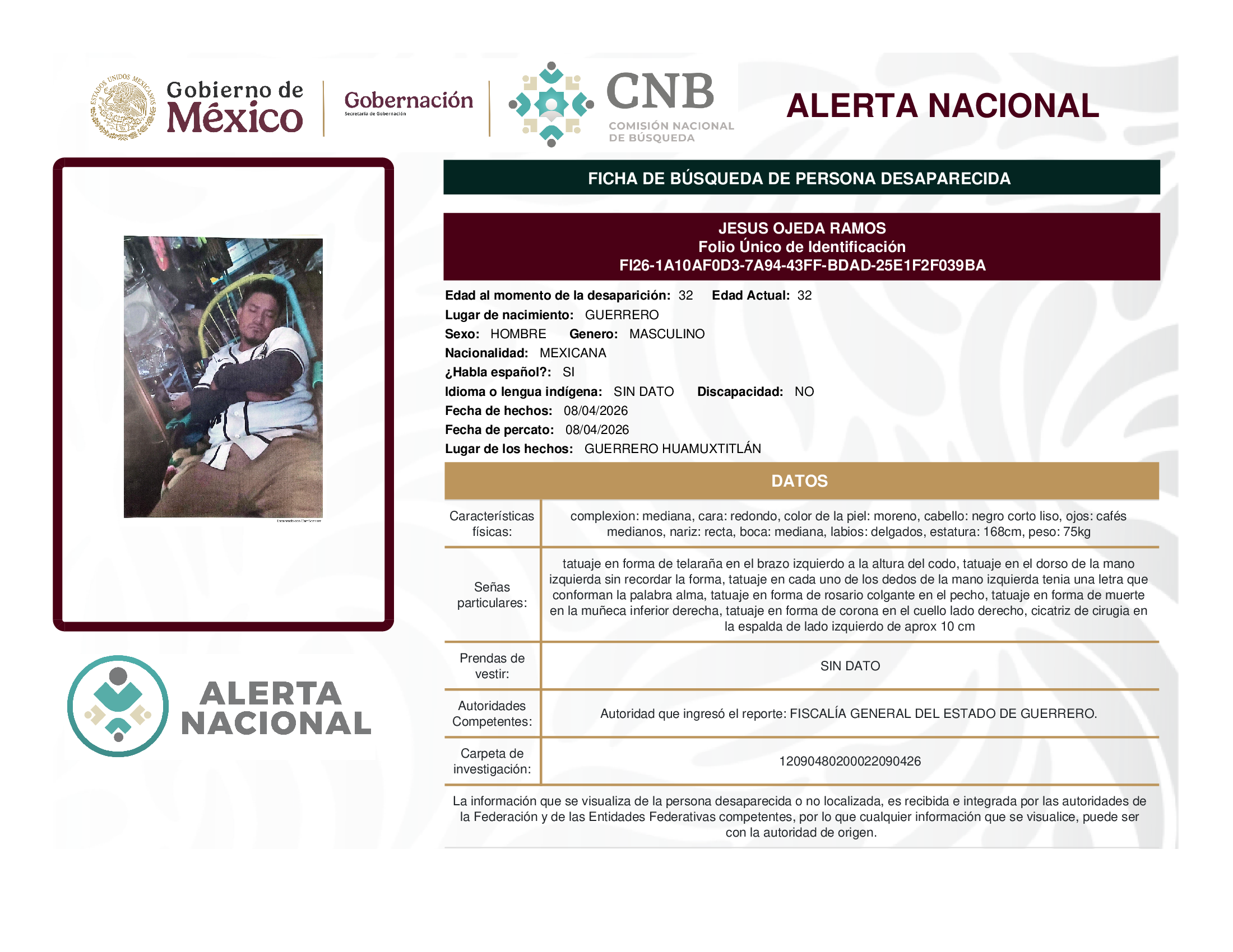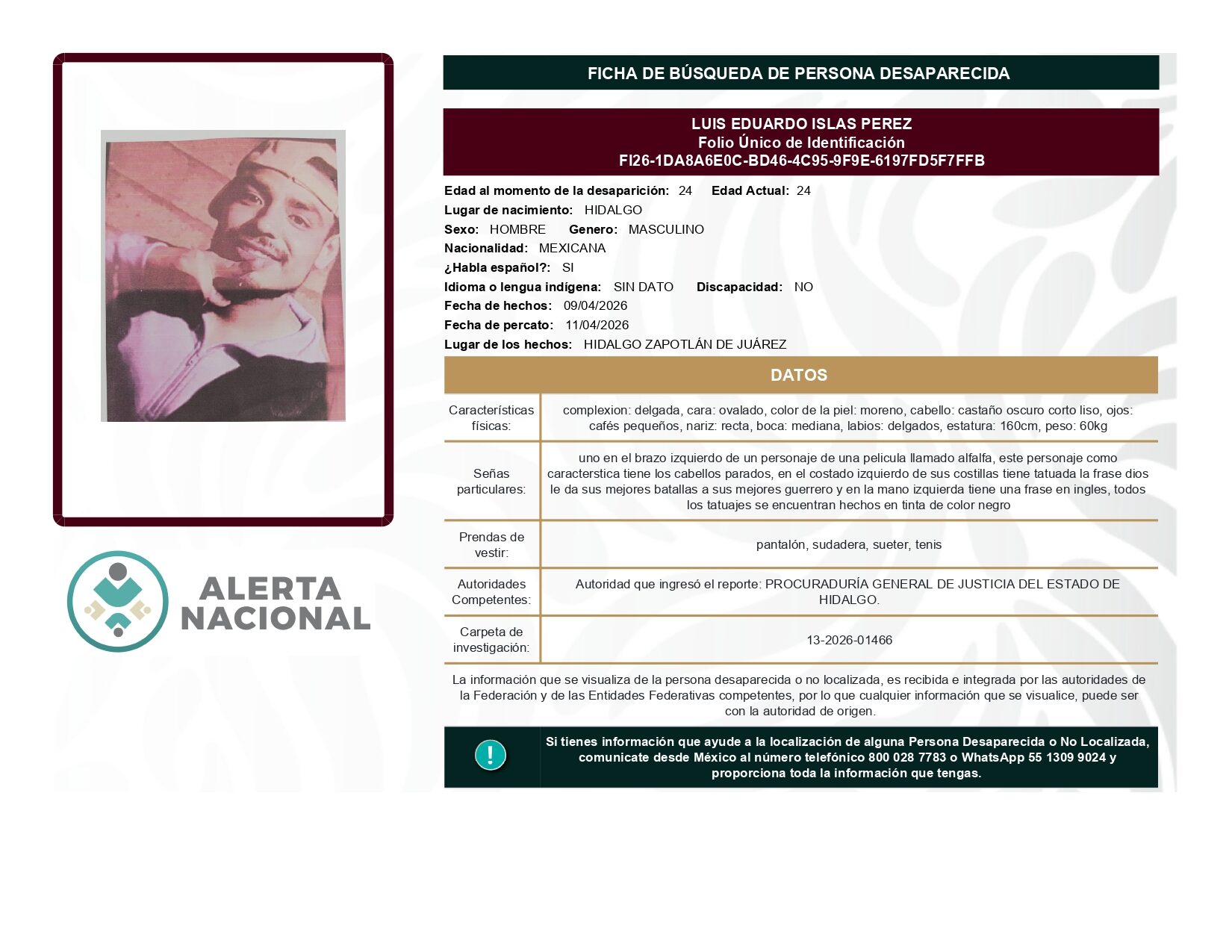 ALERTA NACIONAL DE BÚSQUEDA, LOCALIZACIÓN E IDENTIFICACIÓN DE PERSONAS DESAPARECIDAS Y NO LOCALIZADAS
