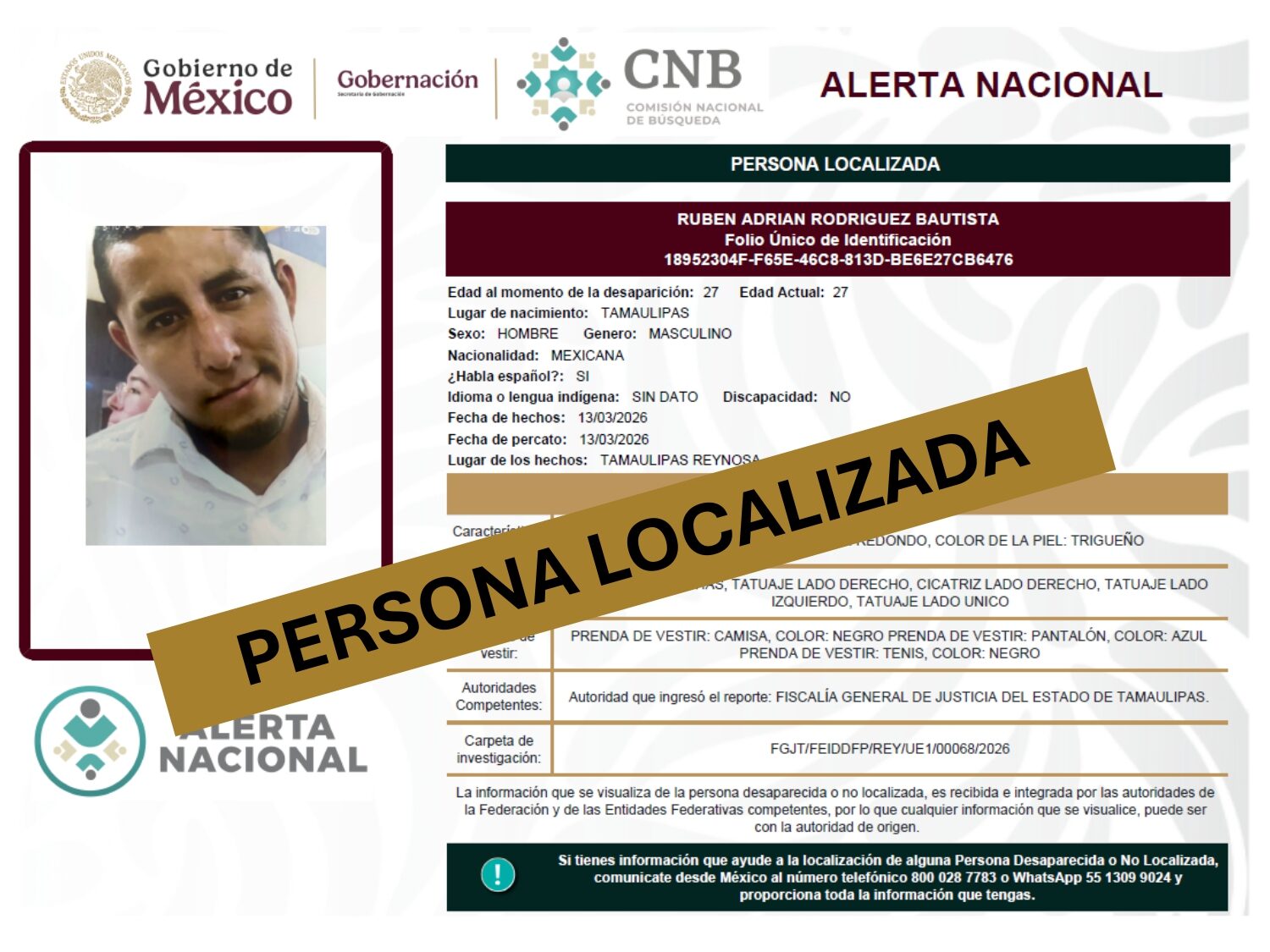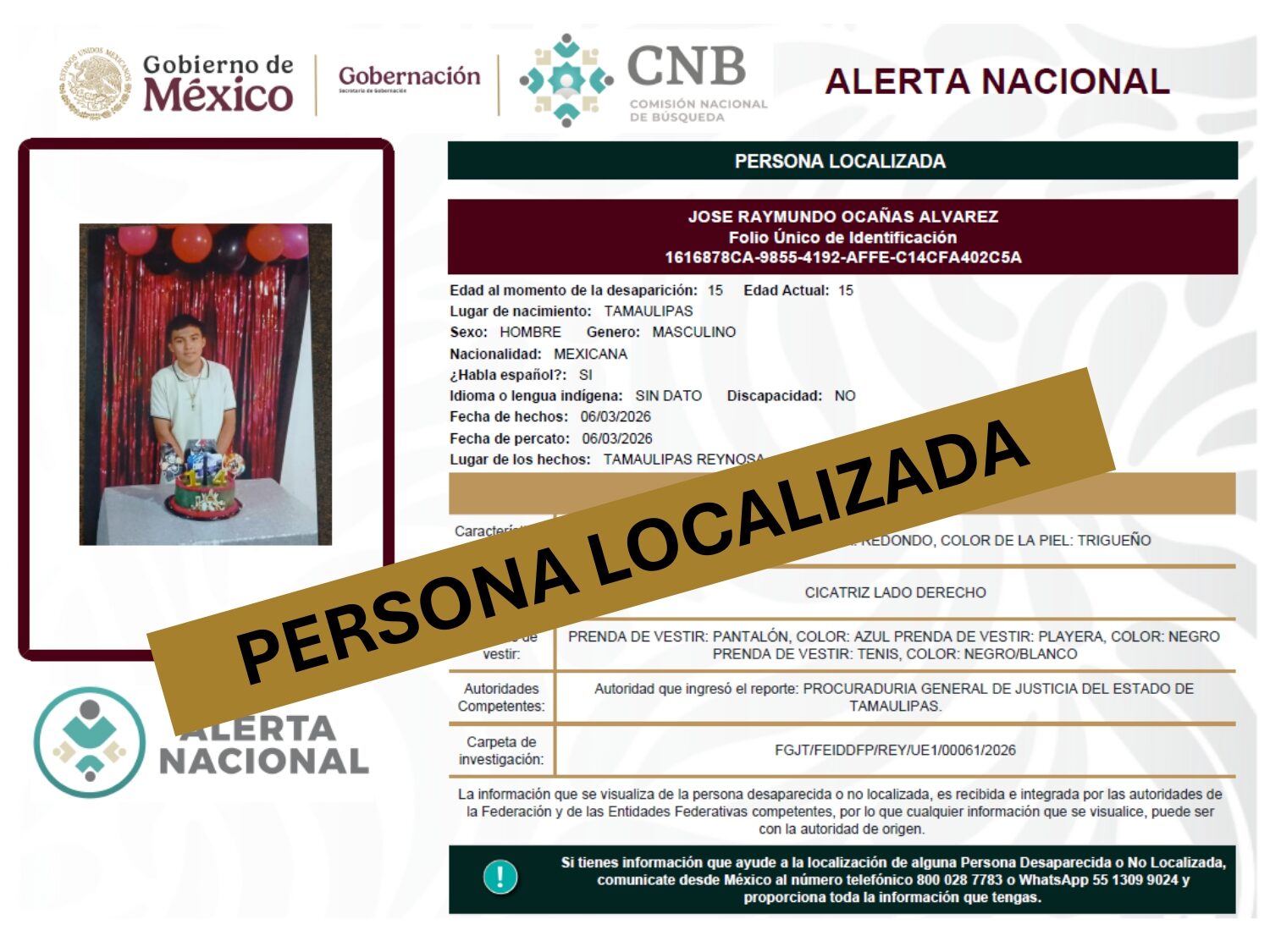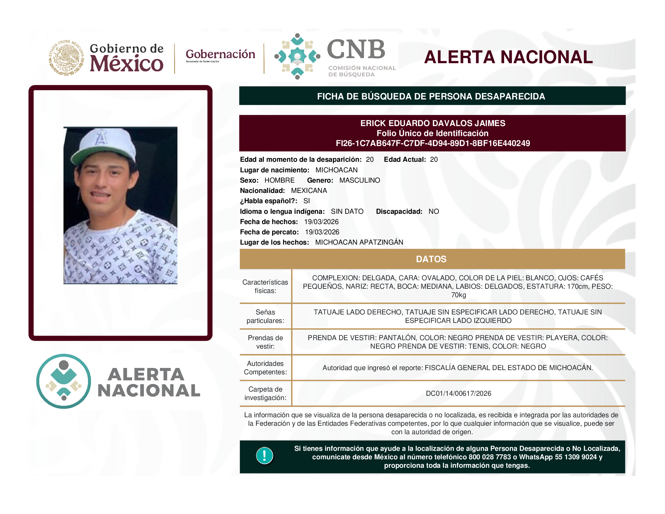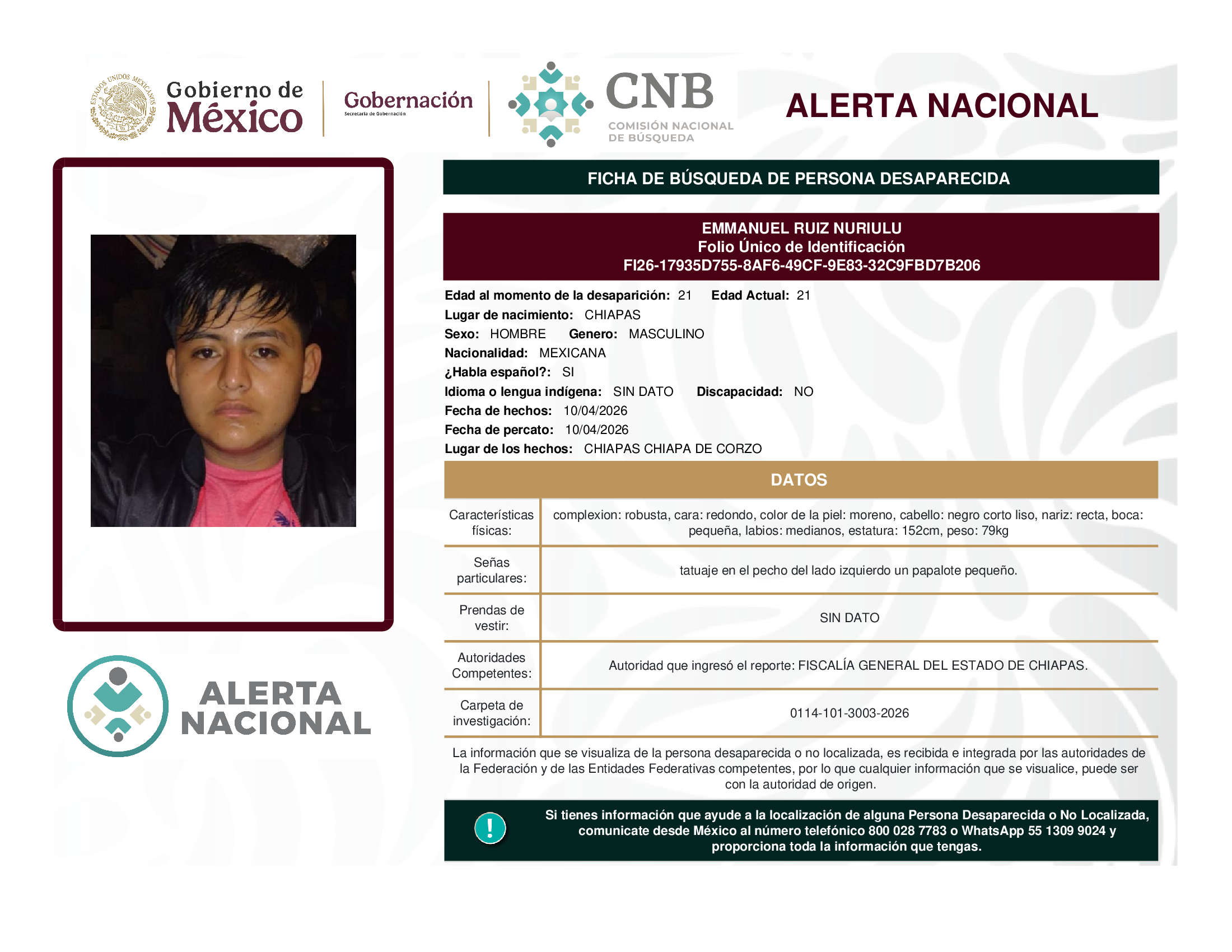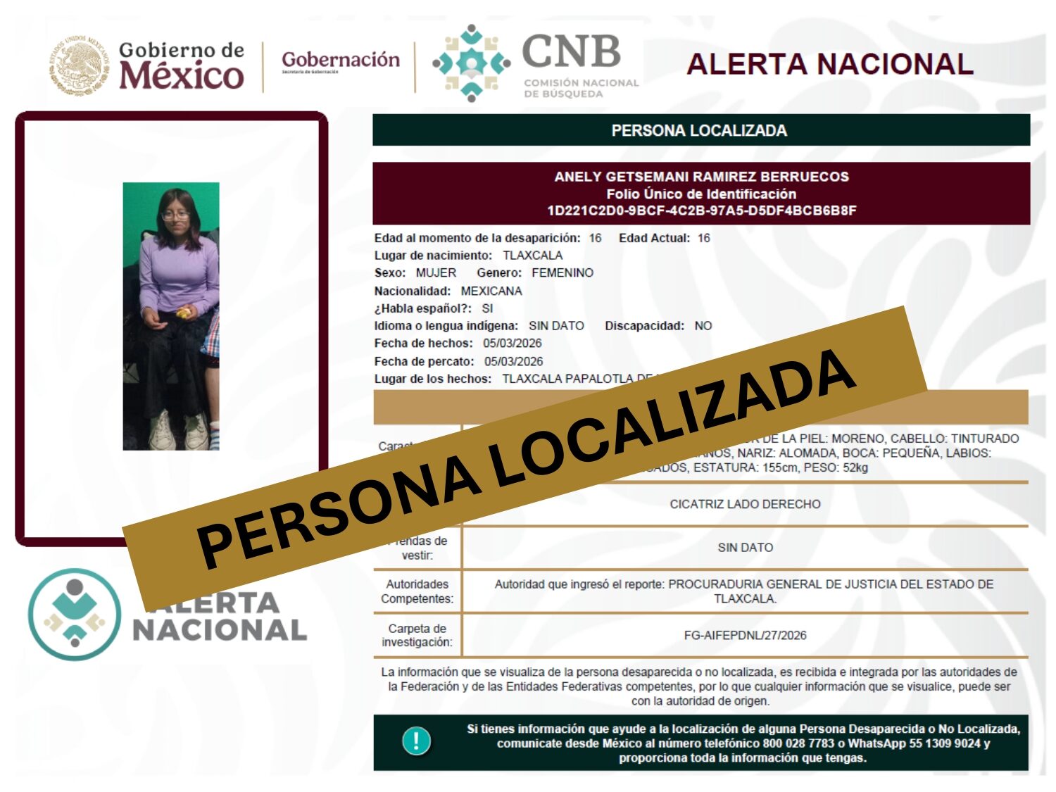 ALERTA NACIONAL DE BÚSQUEDA, LOCALIZACIÓN E IDENTIFICACIÓN DE PERSONAS DESAPARECIDAS Y NO LOCALIZADAS