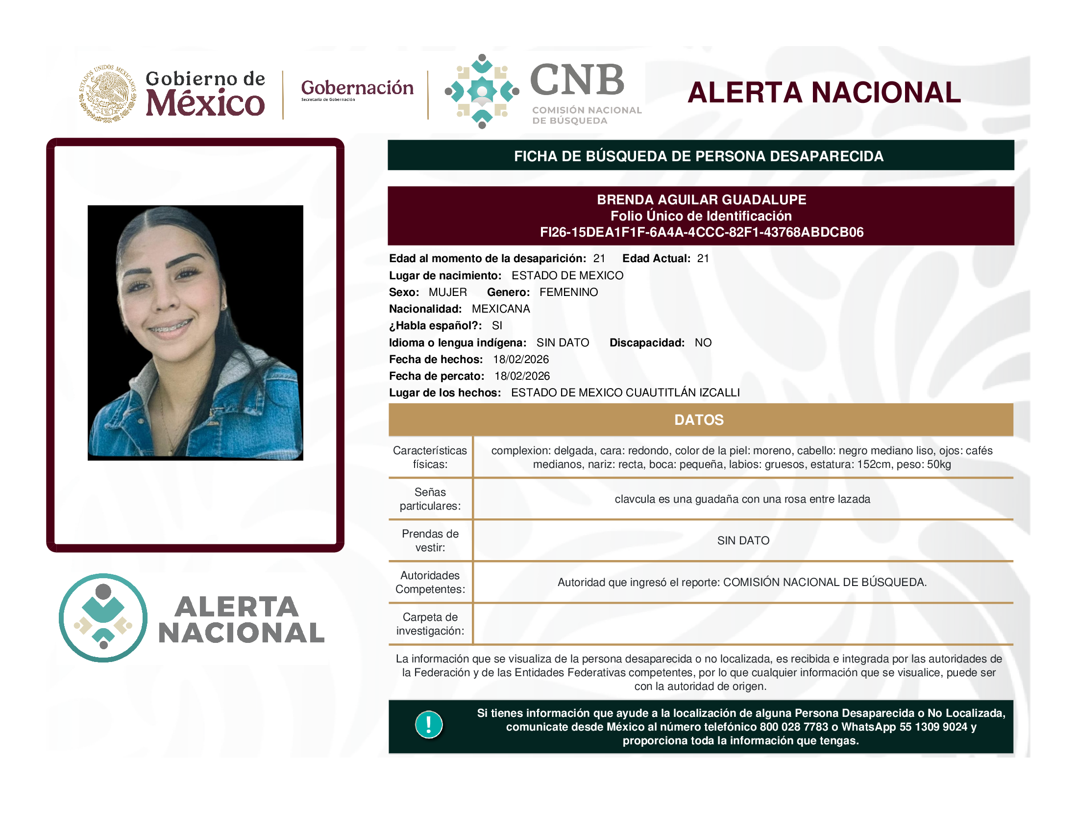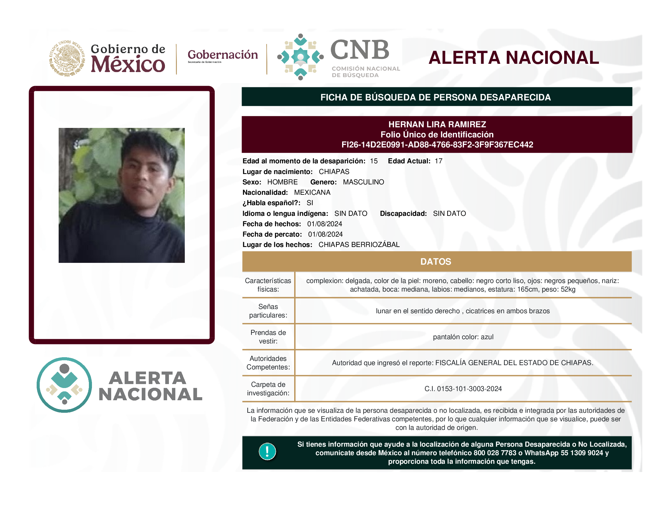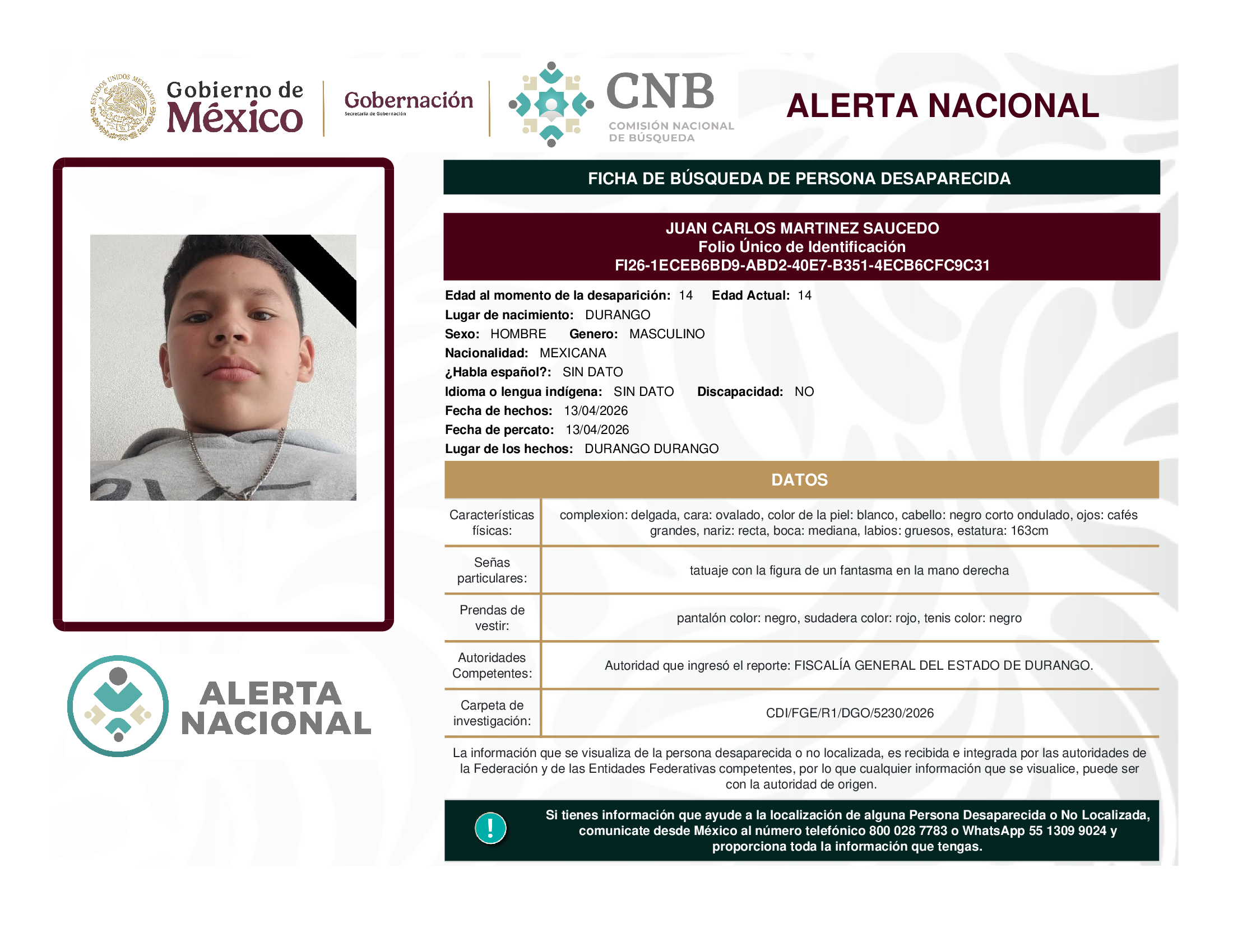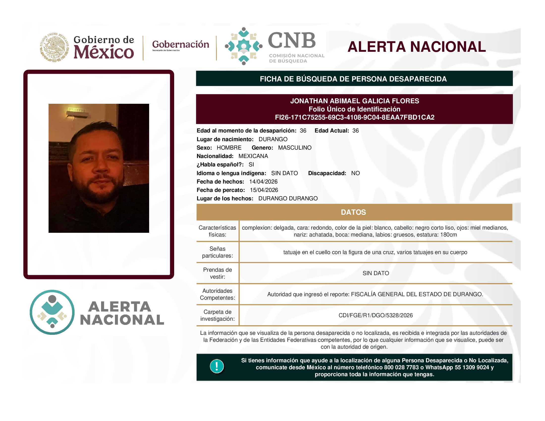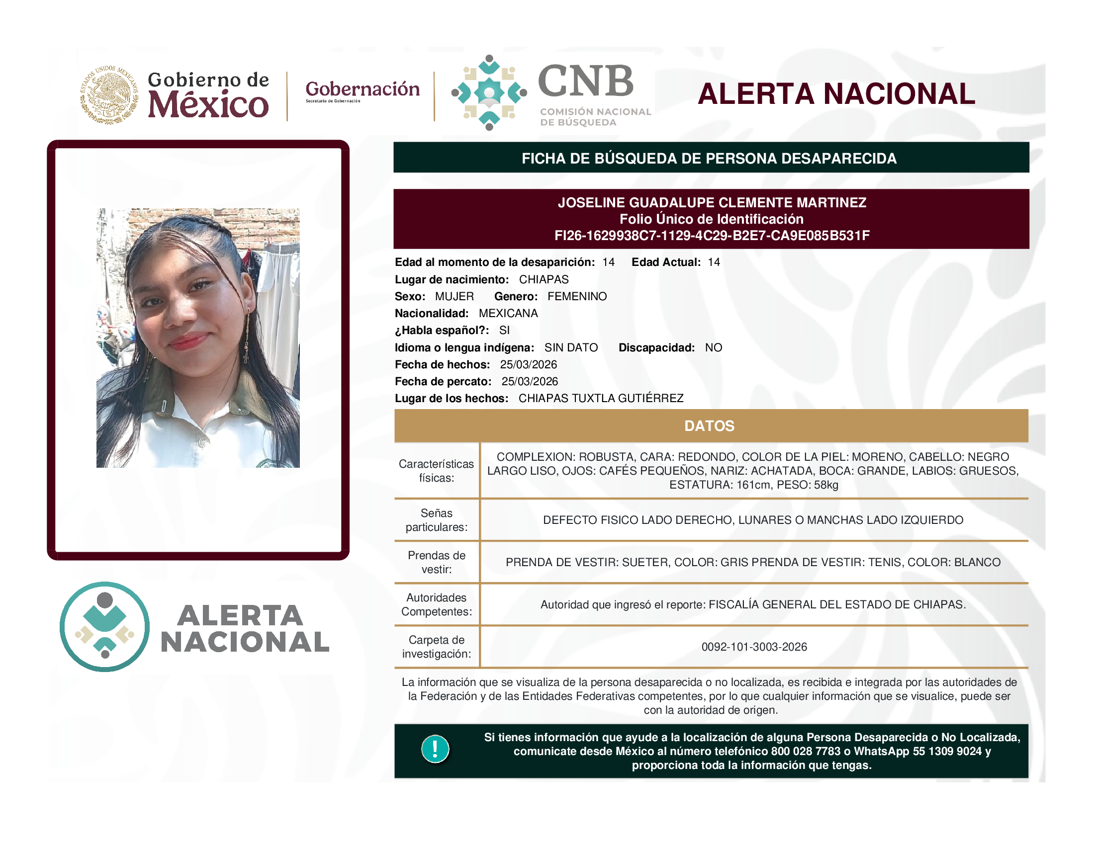 ALERTA NACIONAL DE BÚSQUEDA, LOCALIZACIÓN E IDENTIFICACIÓN DE PERSONAS DESAPARECIDAS Y NO LOCALIZADAS