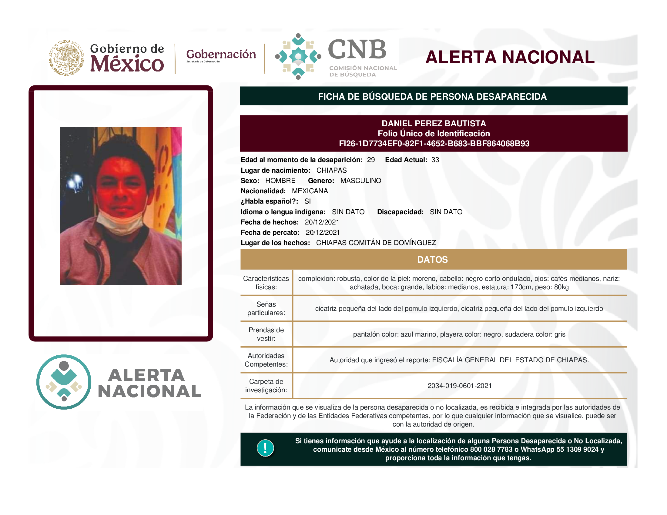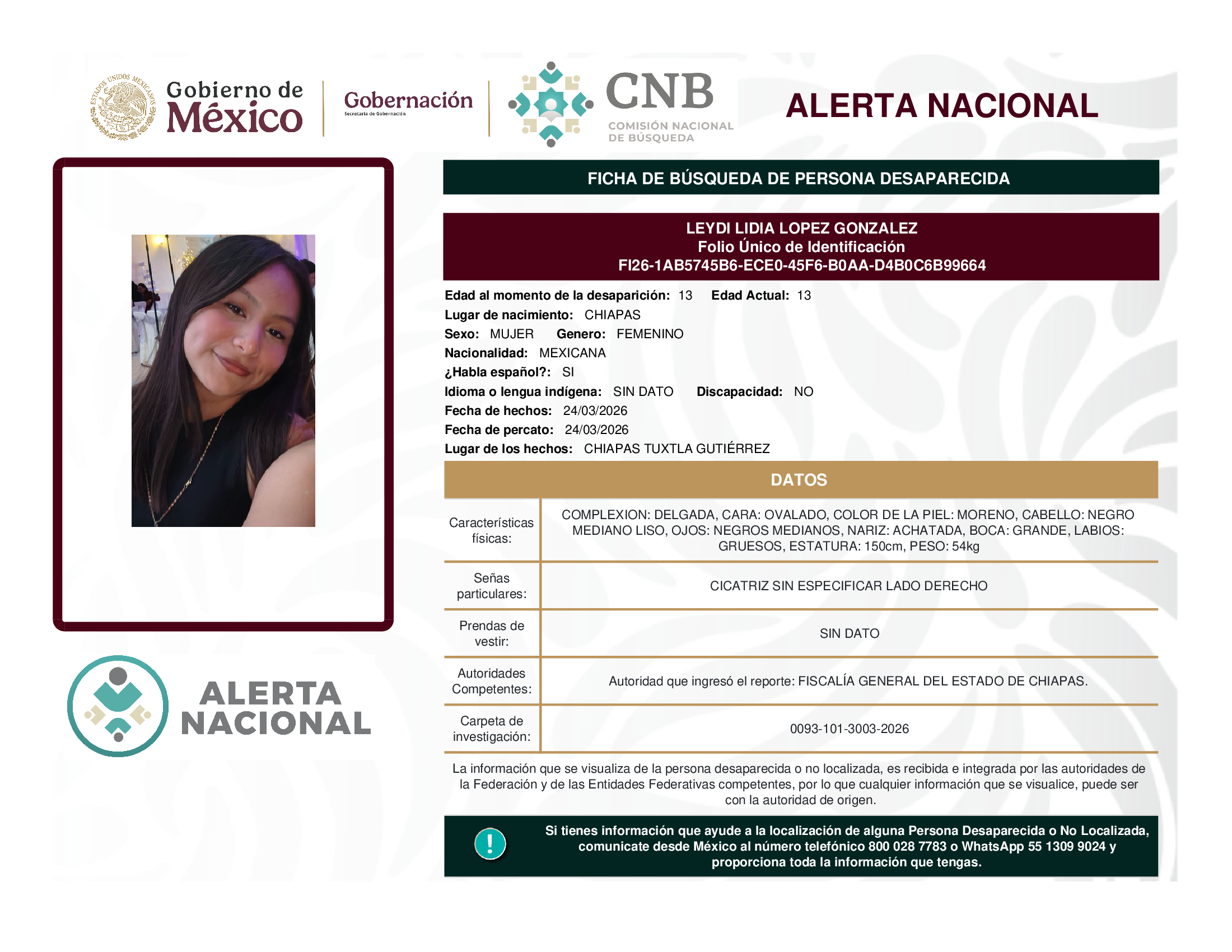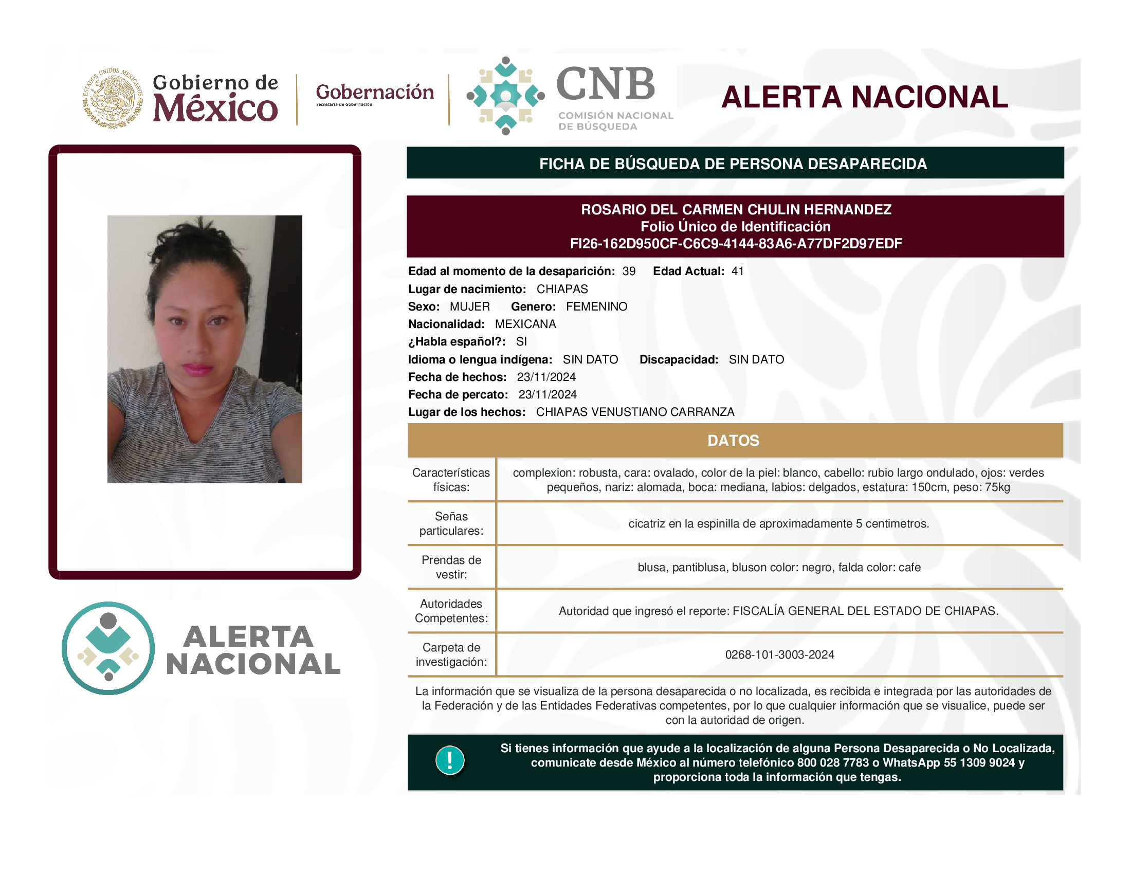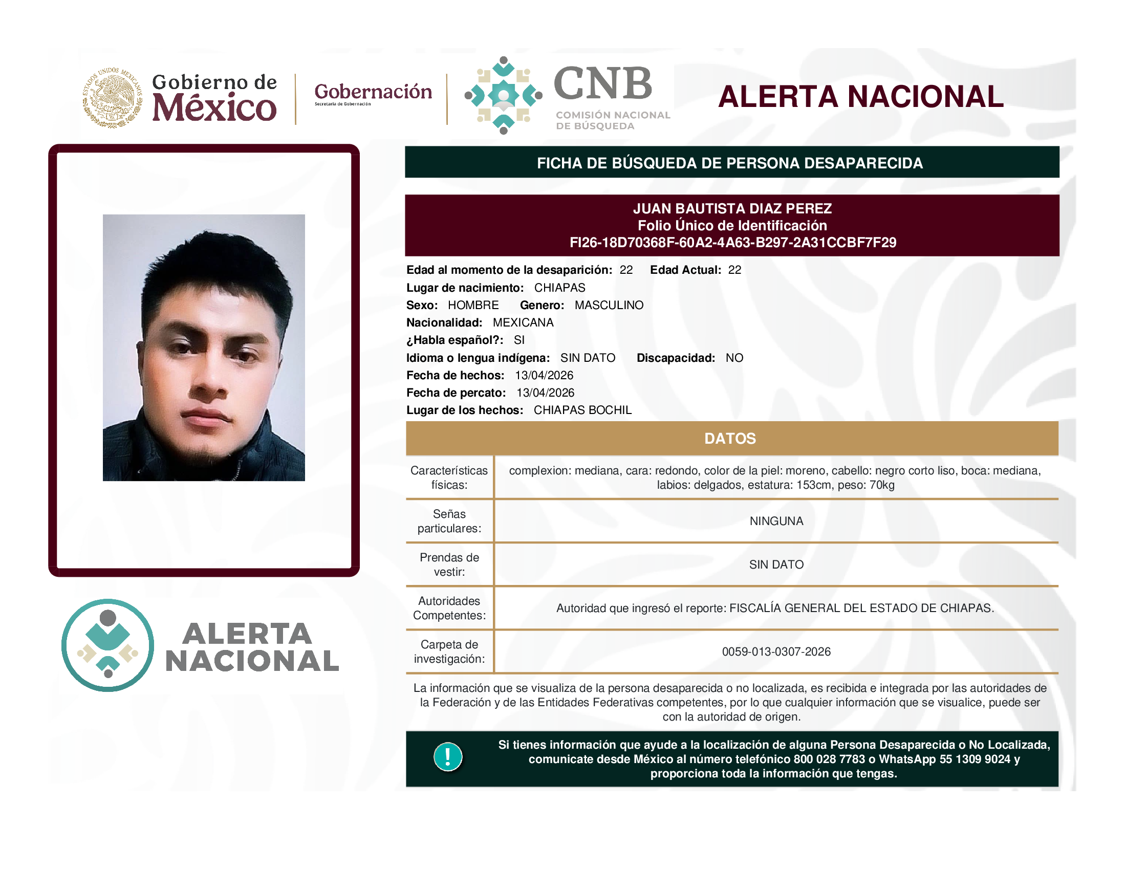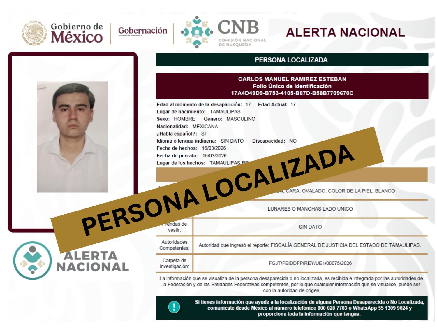ALERTA NACIONAL DE BÚSQUEDA, LOCALIZACIÓN E IDENTIFICACIÓN DE PERSONAS DESAPARECIDAS Y NO LOCALIZADAS