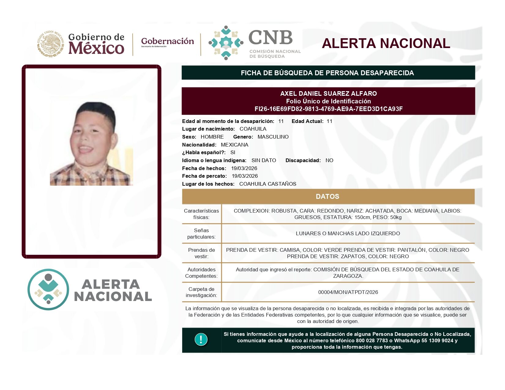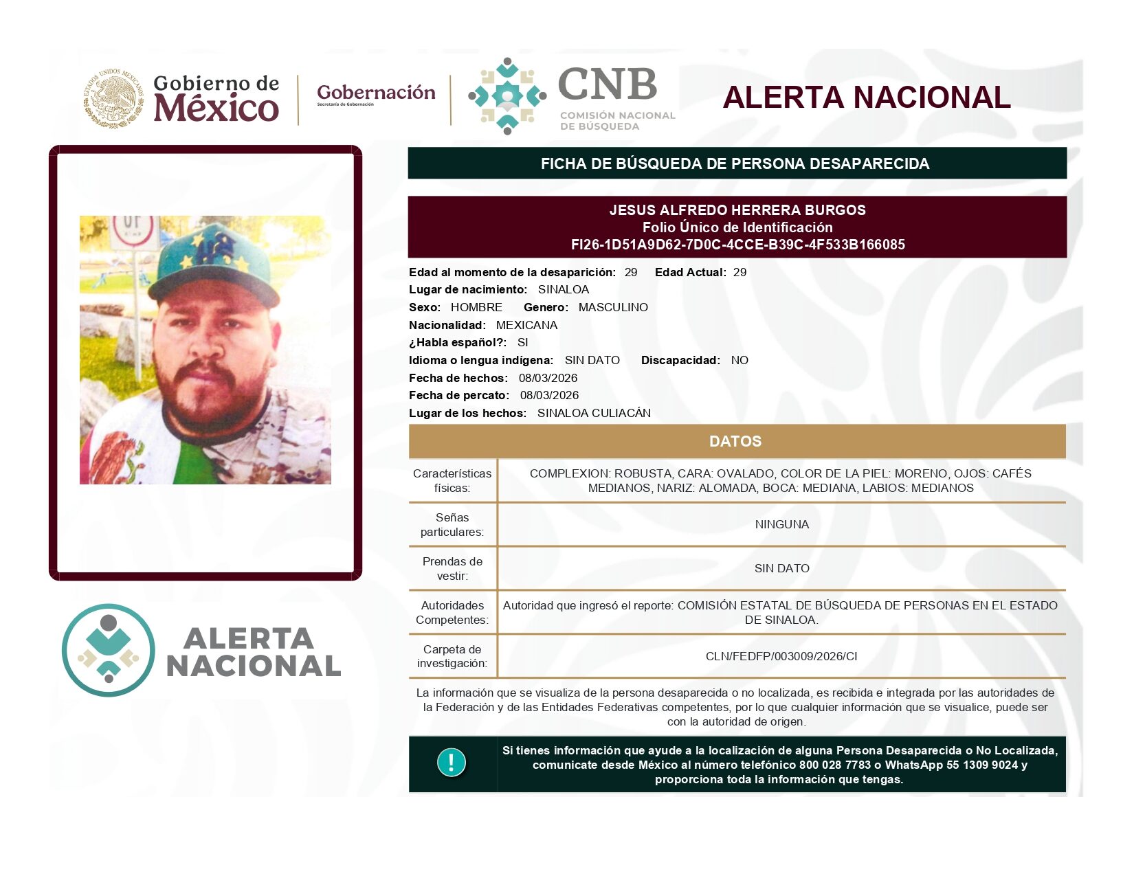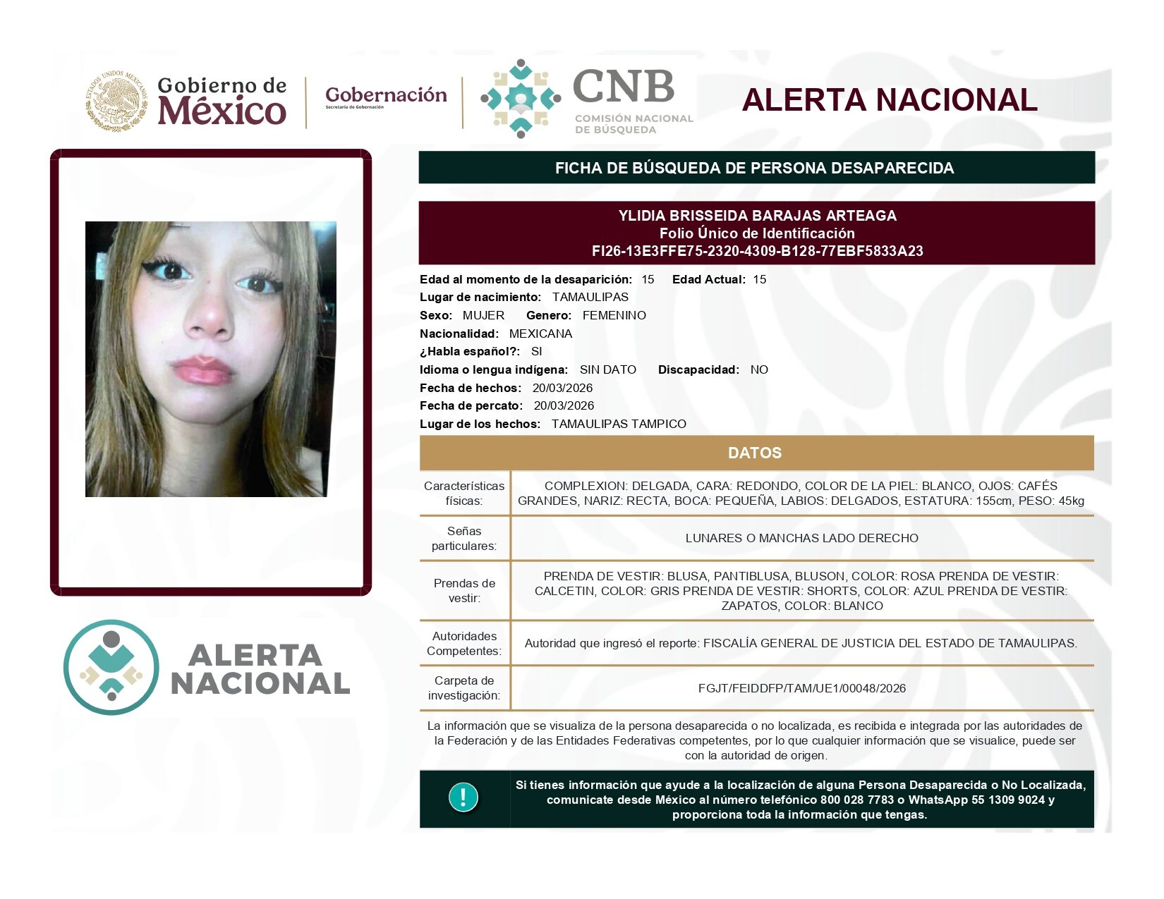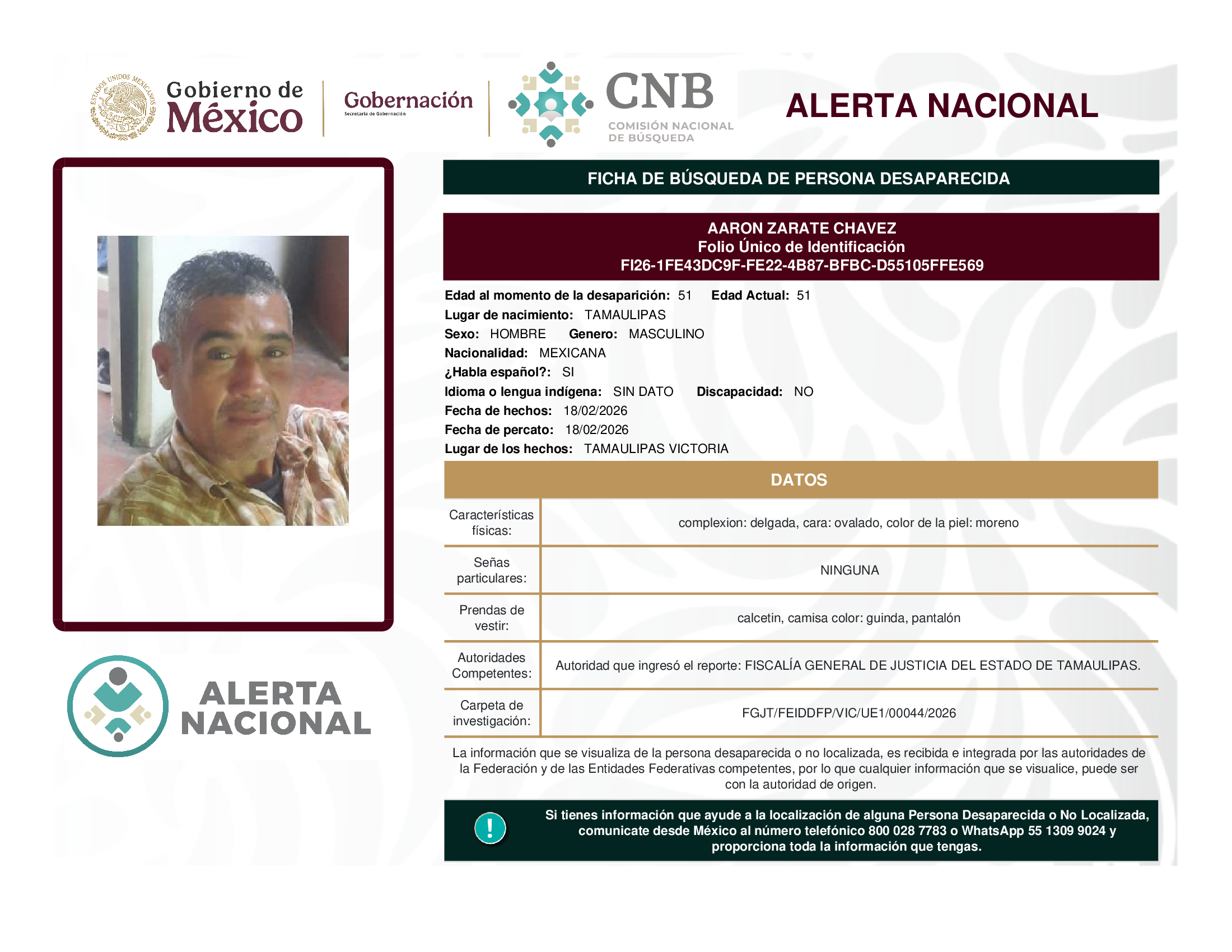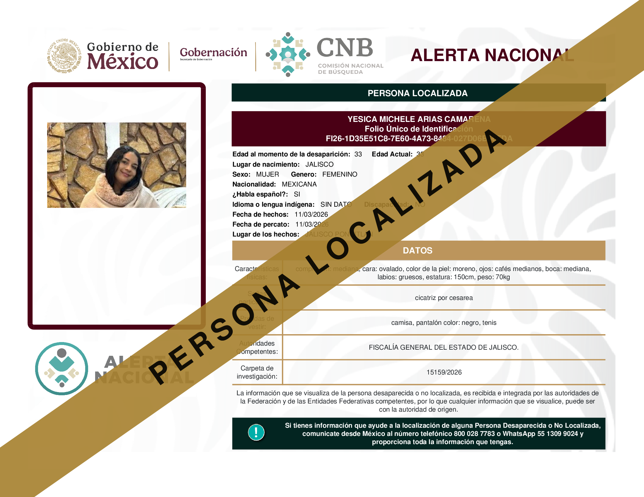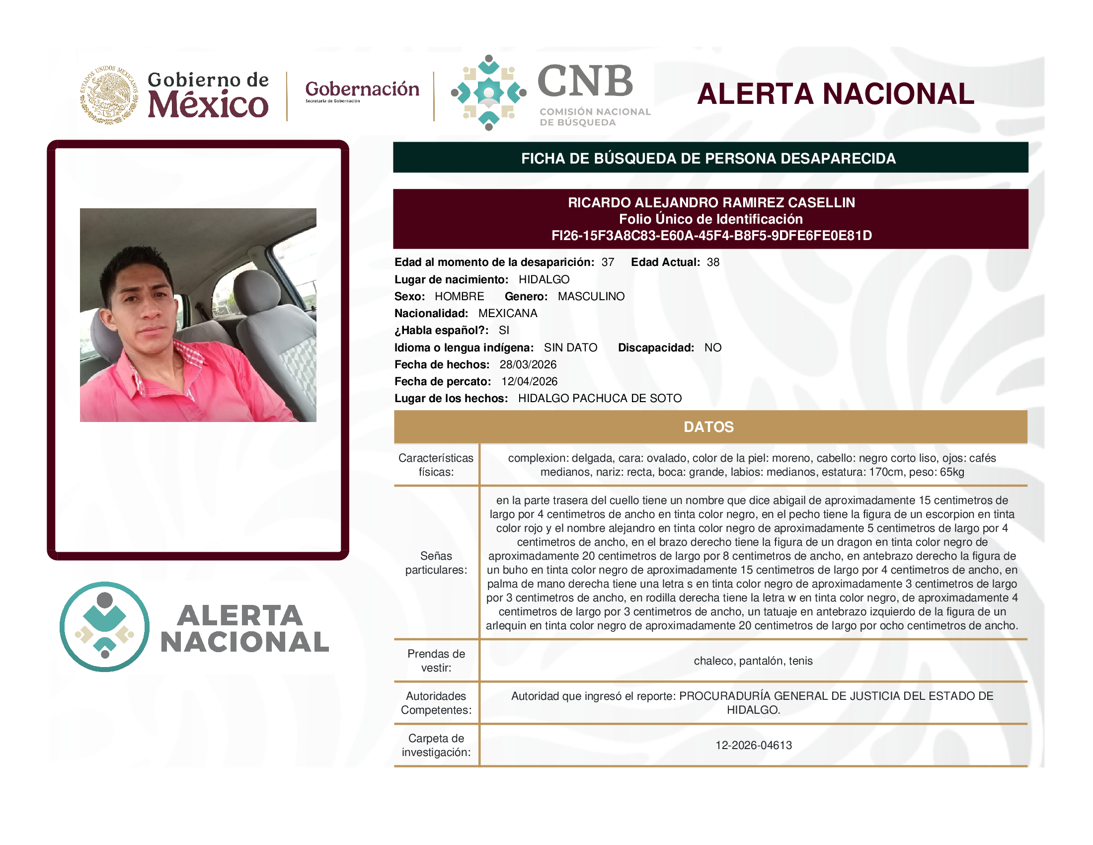 ALERTA NACIONAL DE BÚSQUEDA, LOCALIZACIÓN E IDENTIFICACIÓN DE PERSONAS DESAPARECIDAS Y NO LOCALIZADAS