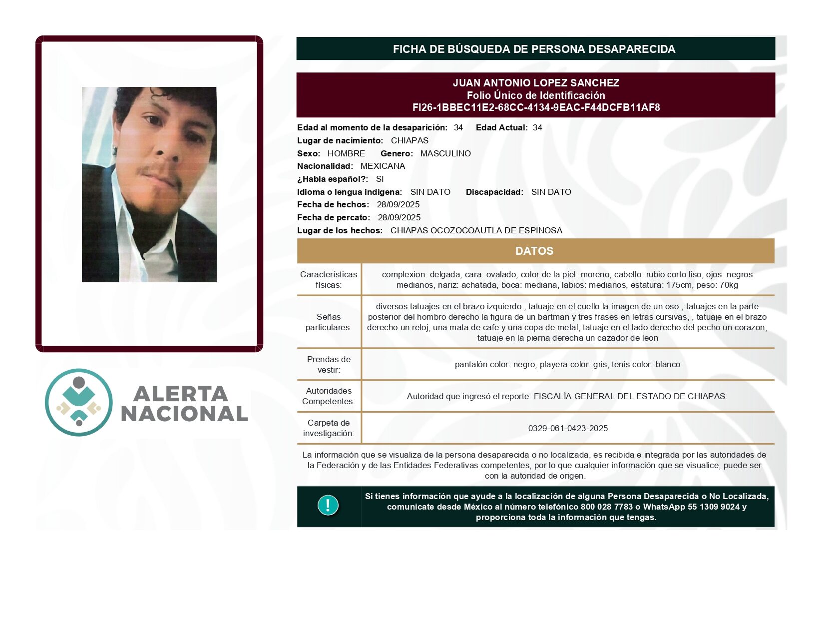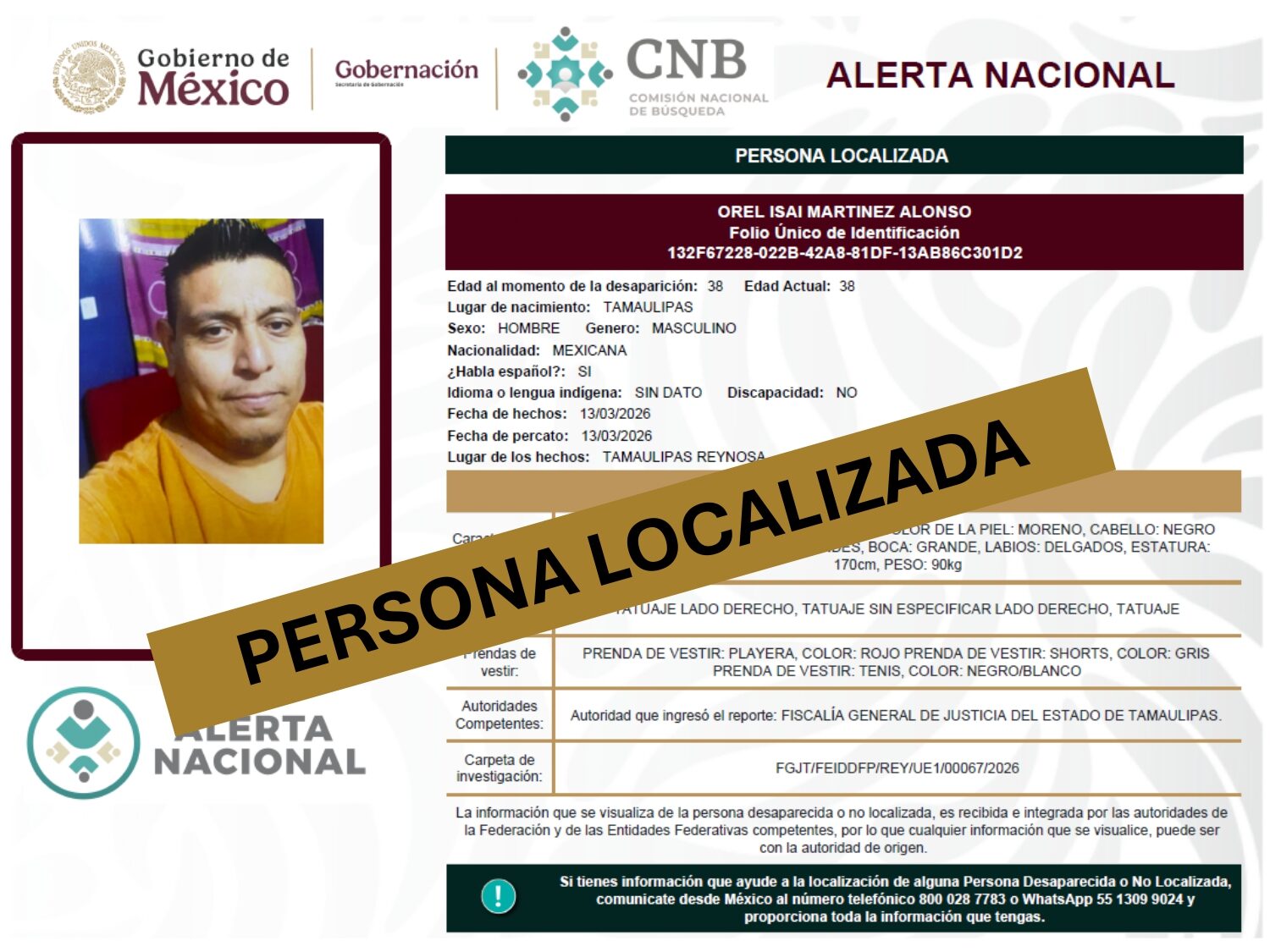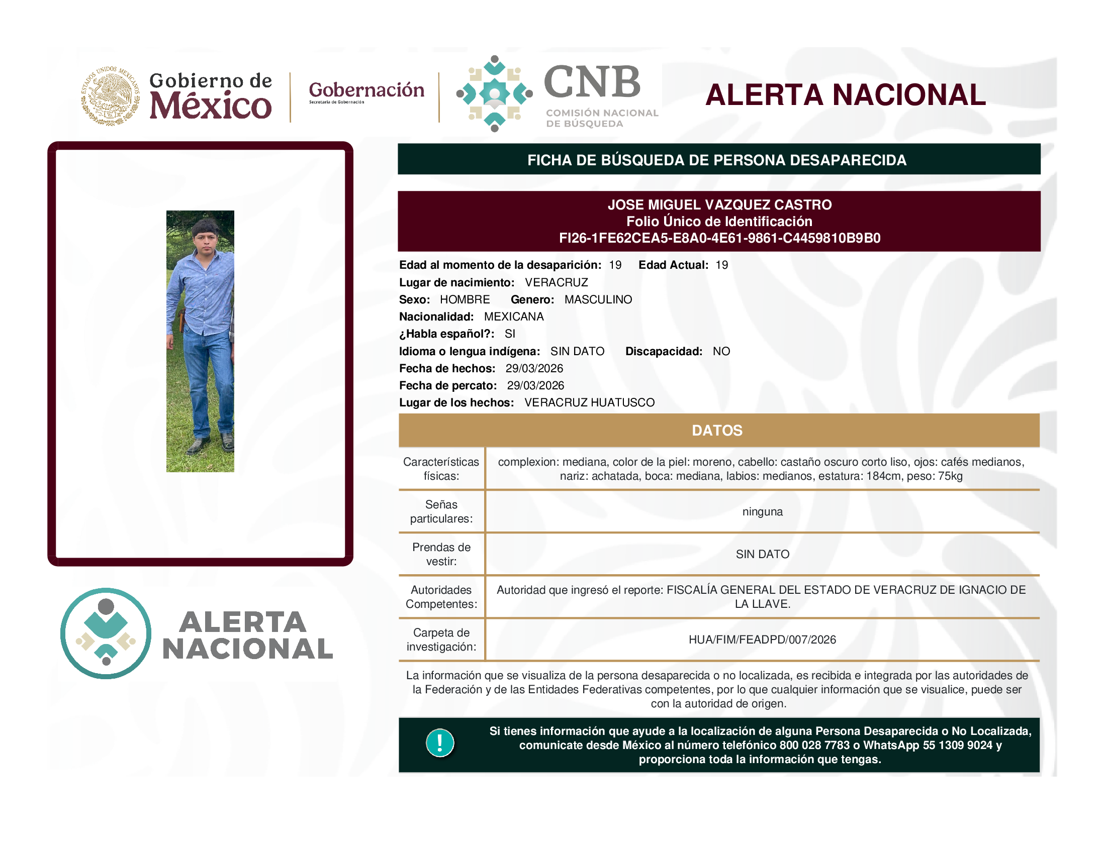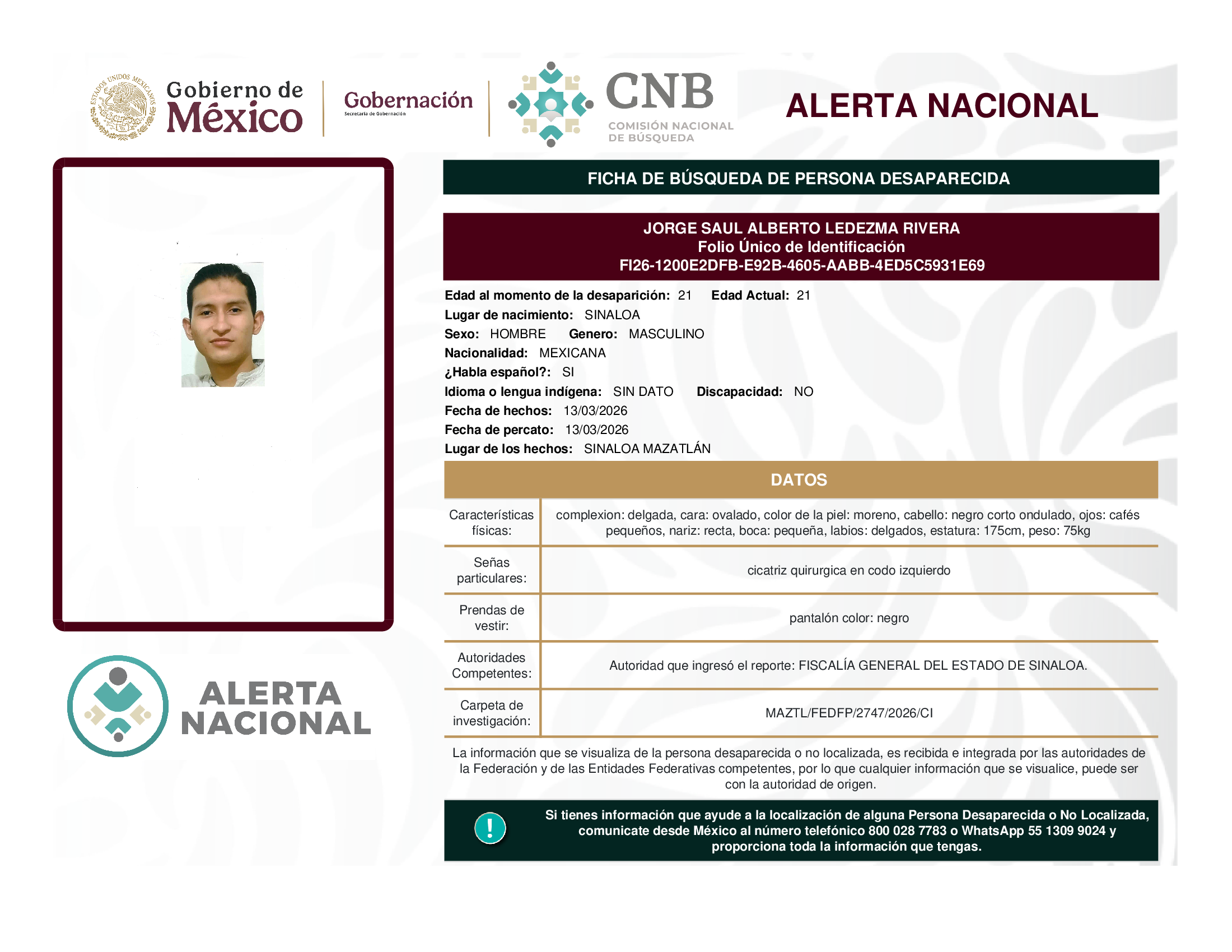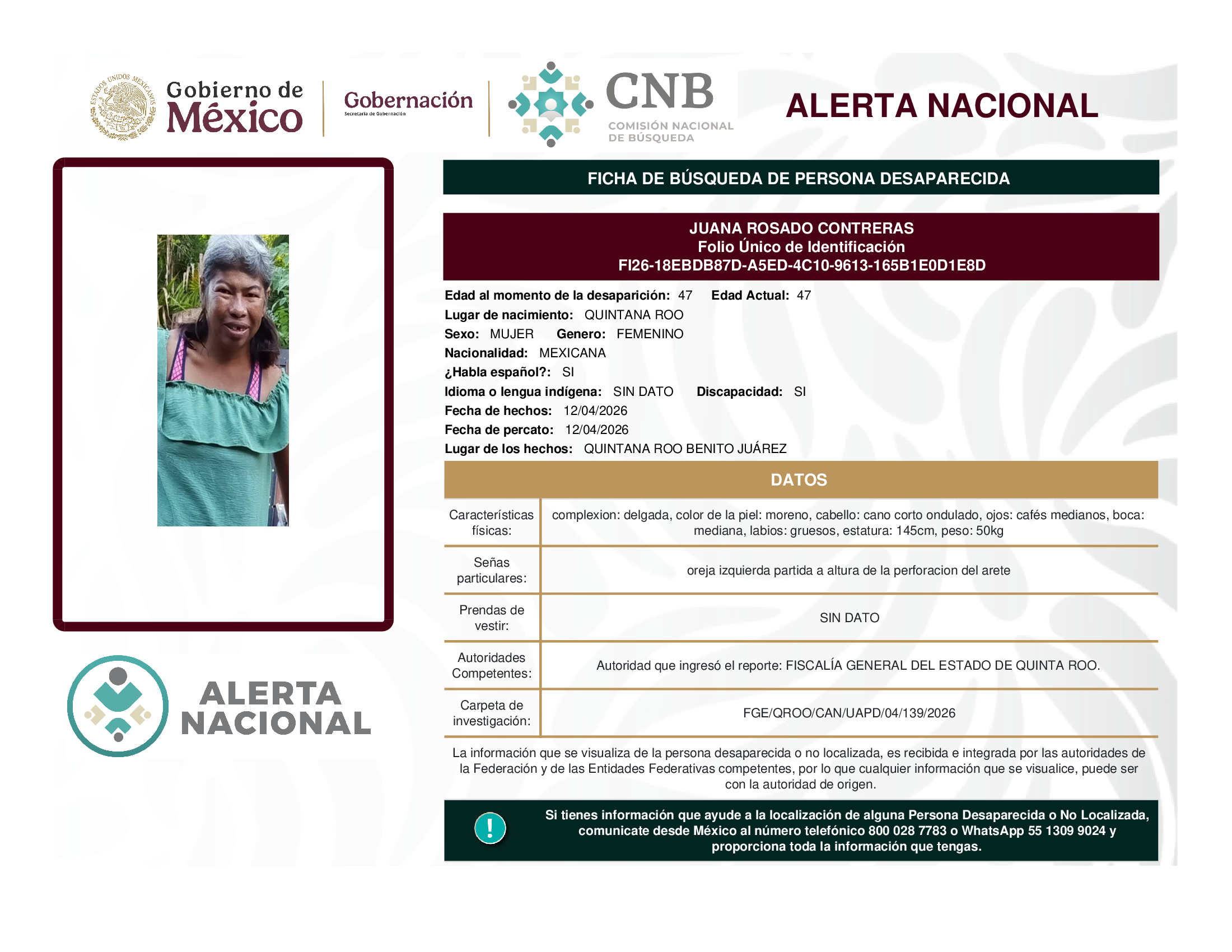 ALERTA NACIONAL DE BÚSQUEDA, LOCALIZACIÓN E IDENTIFICACIÓN DE PERSONAS DESAPARECIDAS Y NO LOCALIZADAS