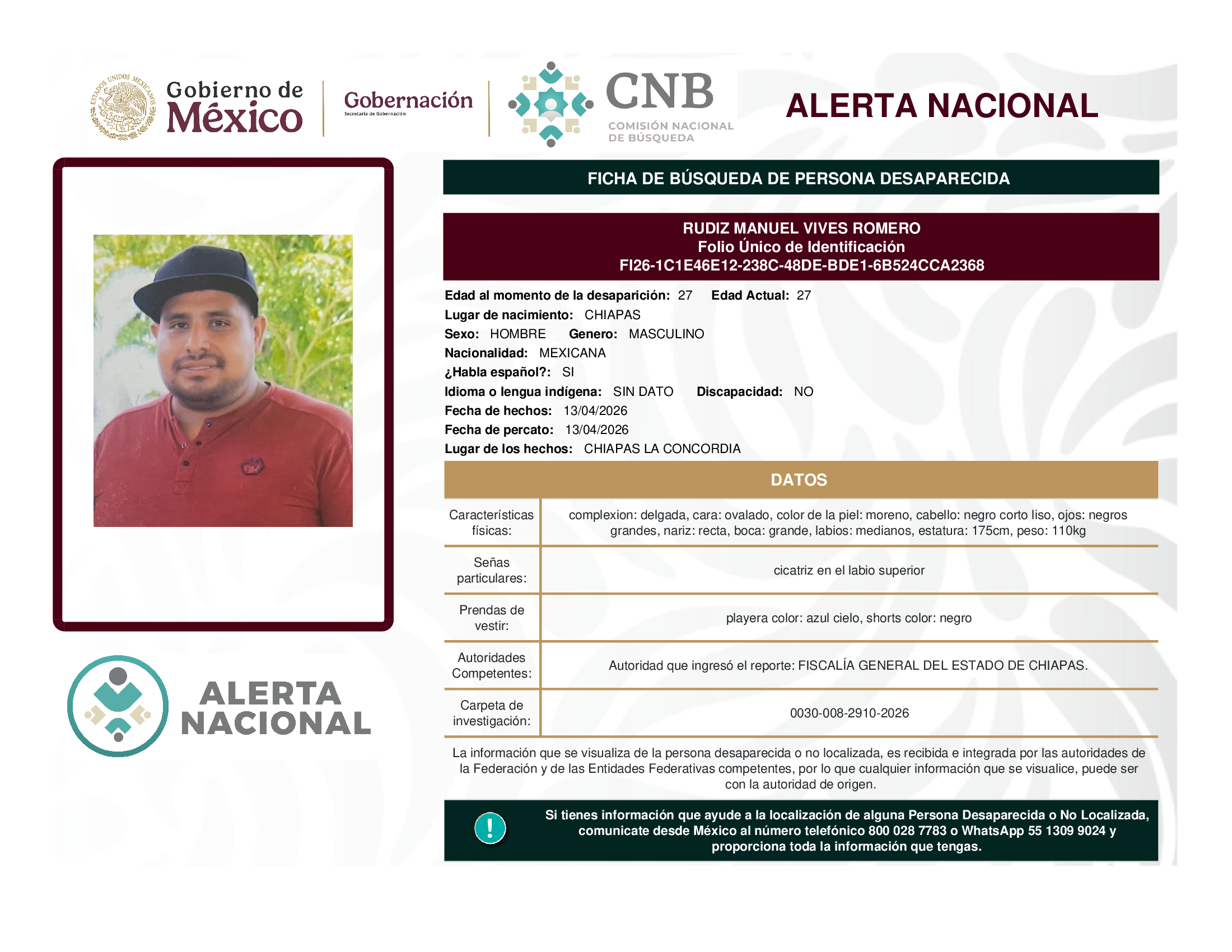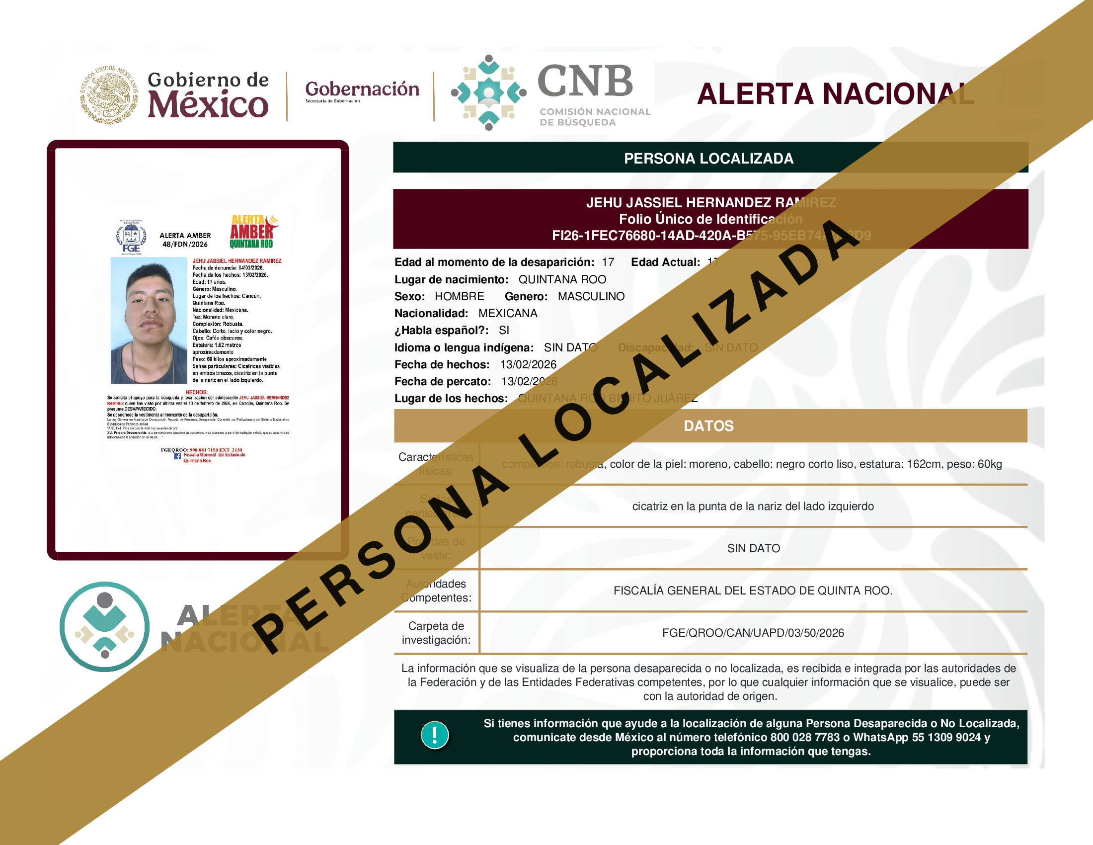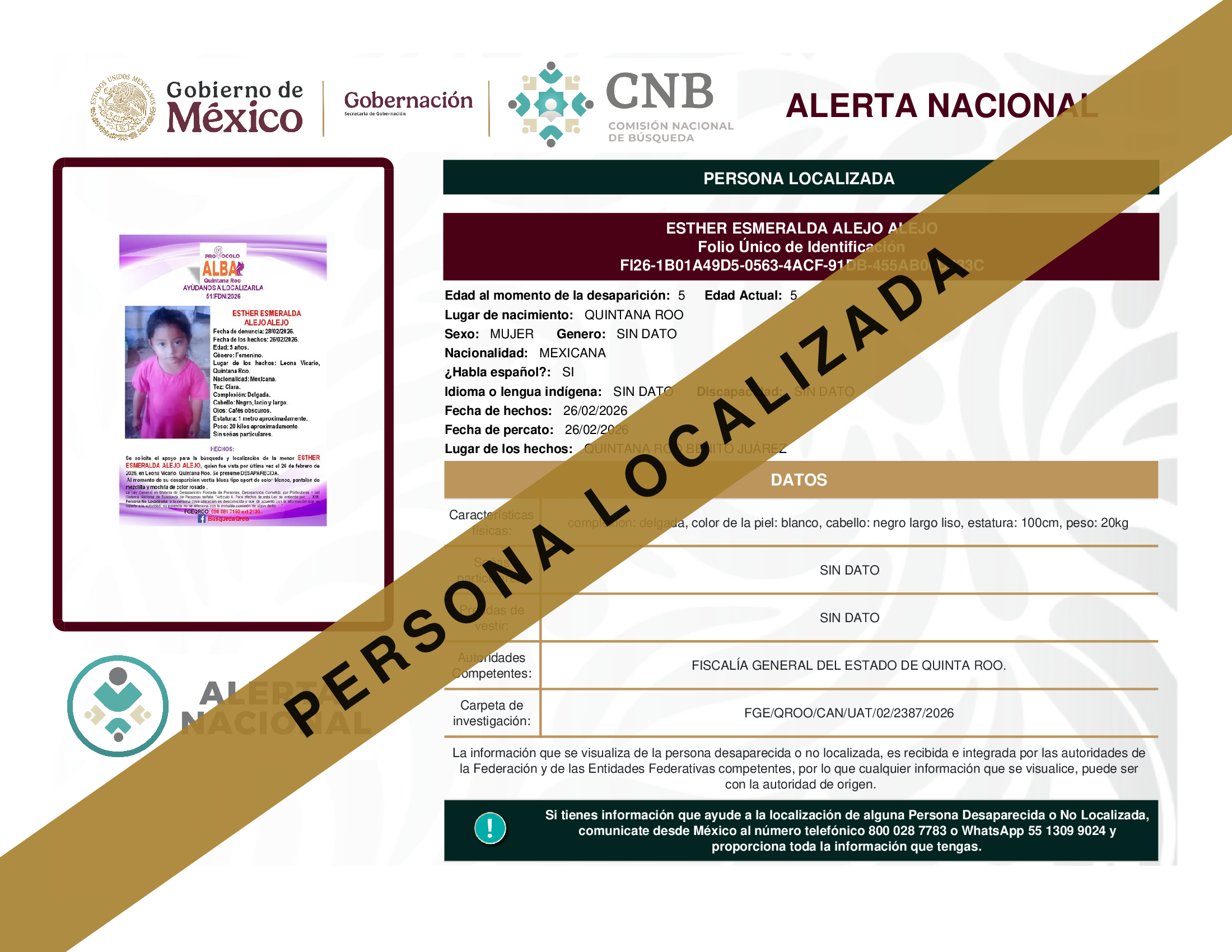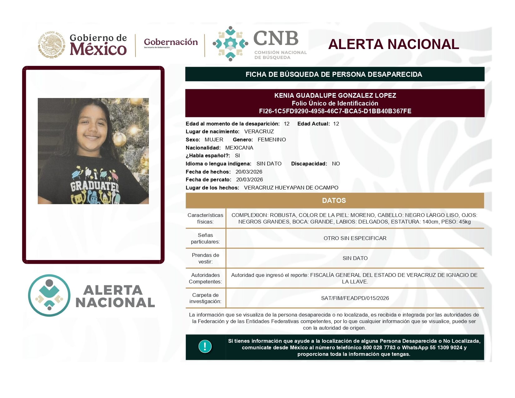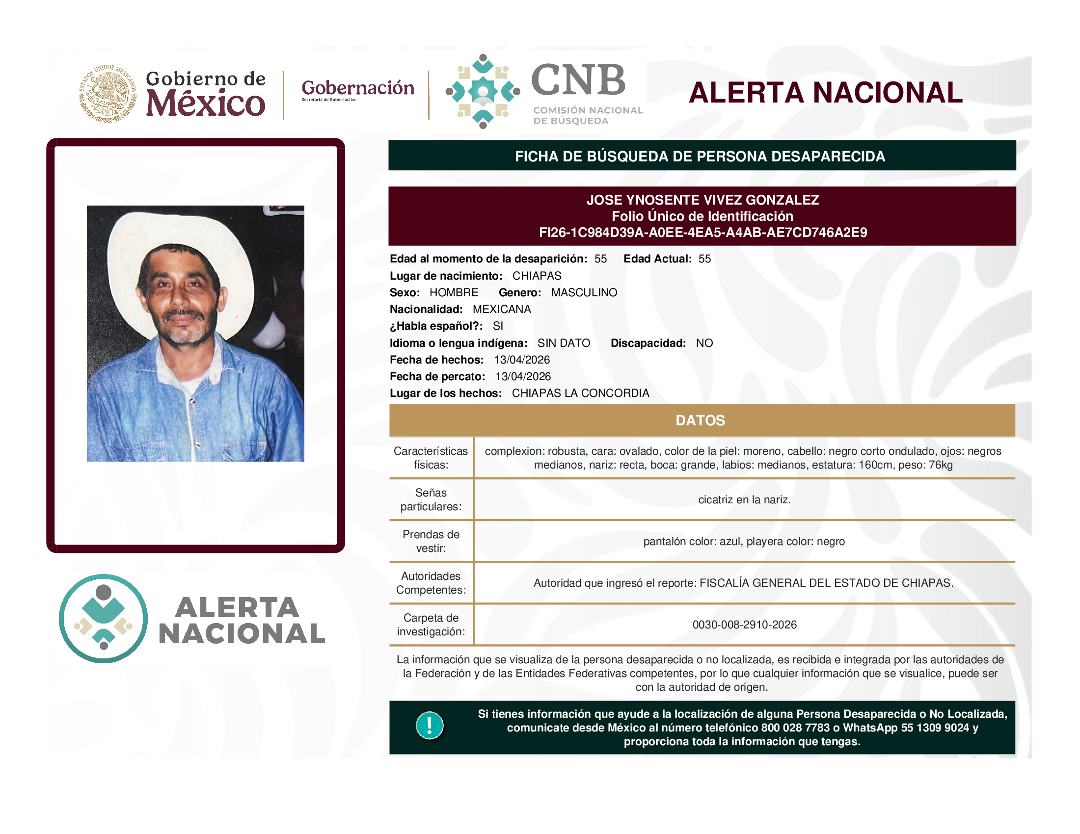 ALERTA NACIONAL DE BÚSQUEDA, LOCALIZACIÓN E IDENTIFICACIÓN DE PERSONAS DESAPARECIDAS Y NO LOCALIZADAS