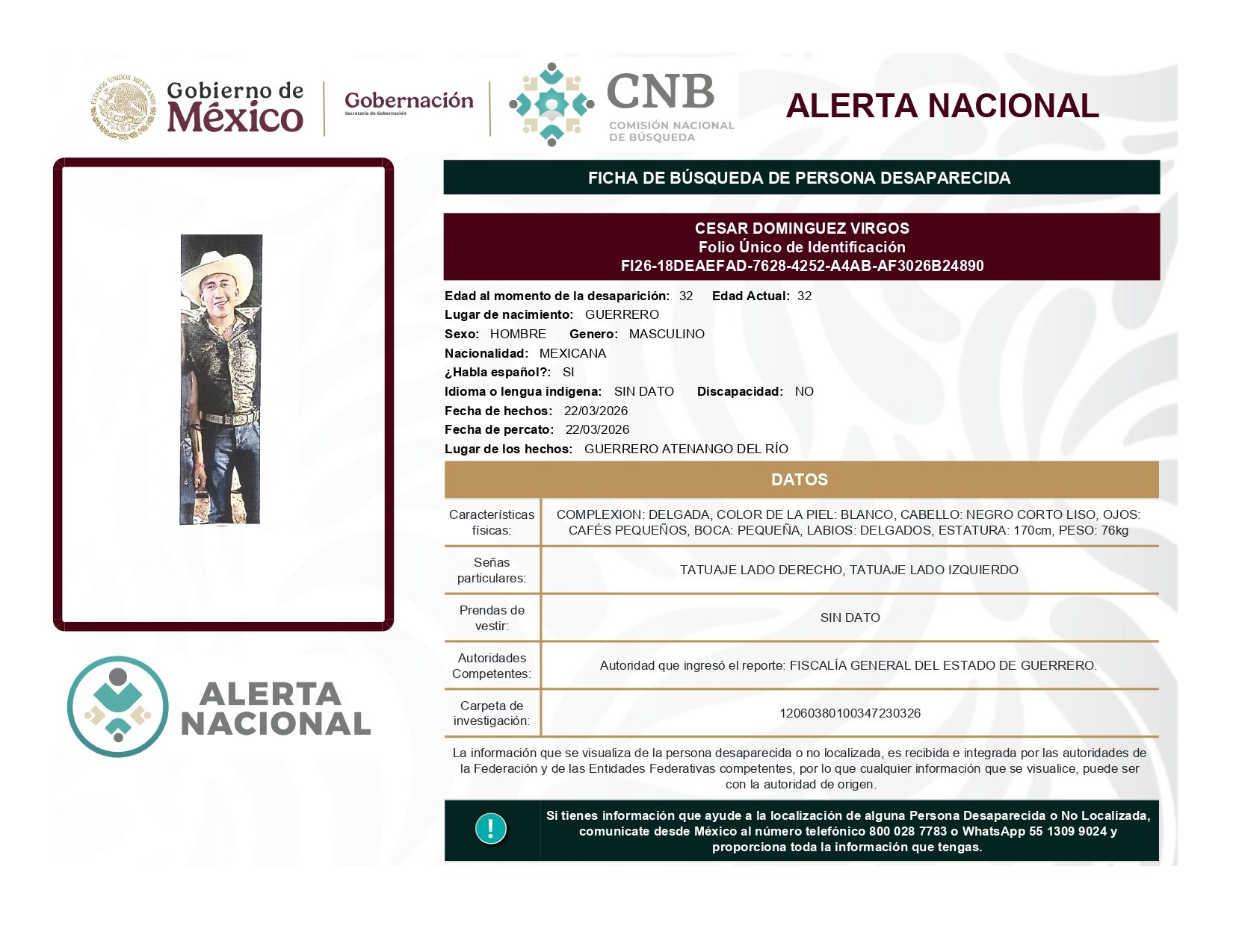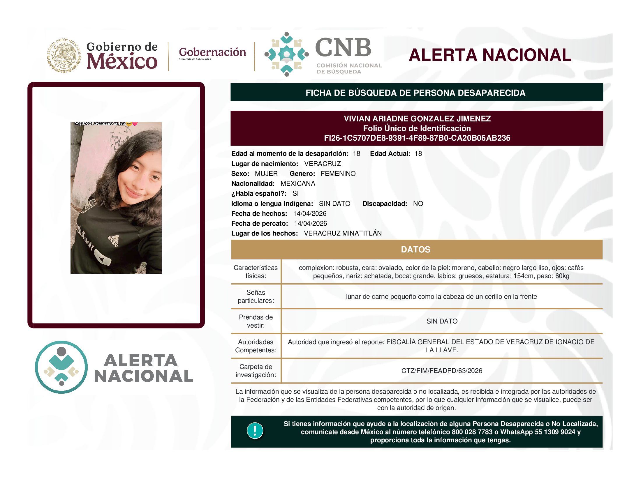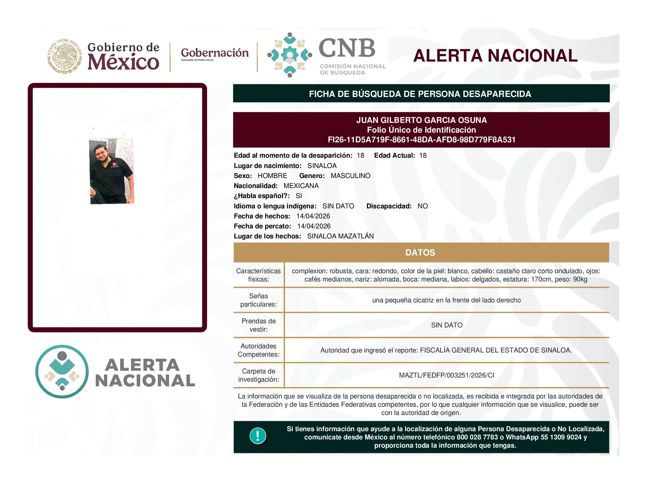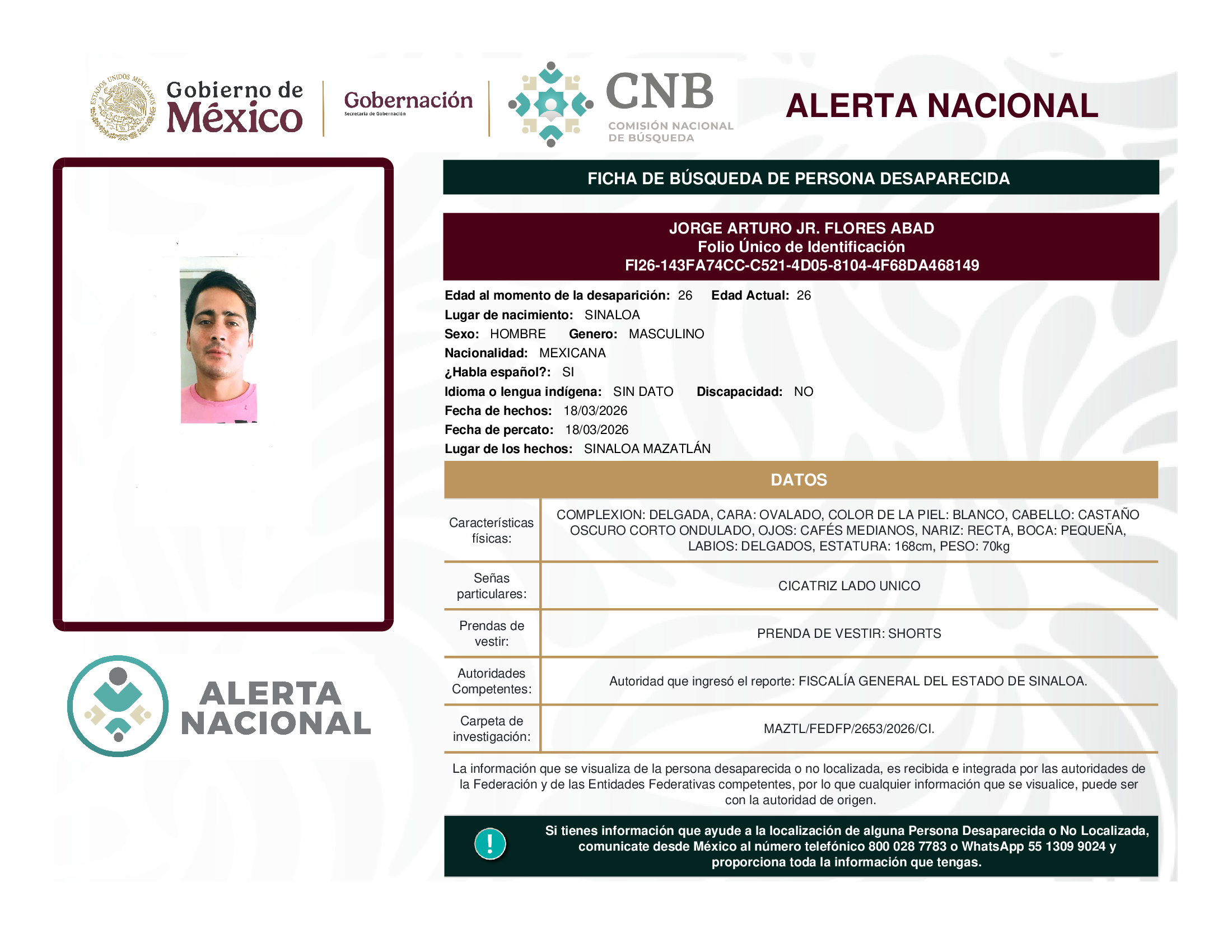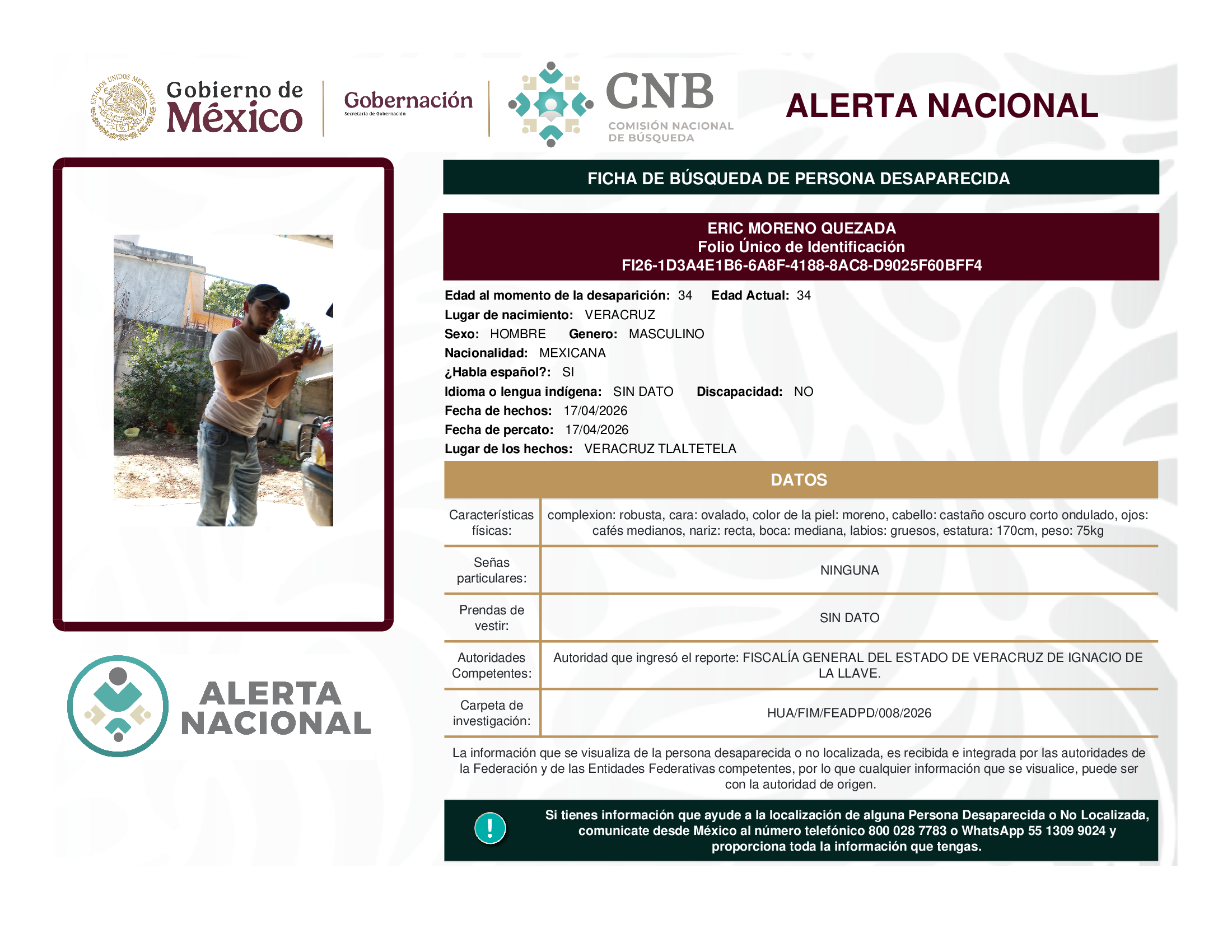 ALERTA NACIONAL DE BÚSQUEDA, LOCALIZACIÓN E IDENTIFICACIÓN DE PERSONAS DESAPARECIDAS Y NO LOCALIZADAS