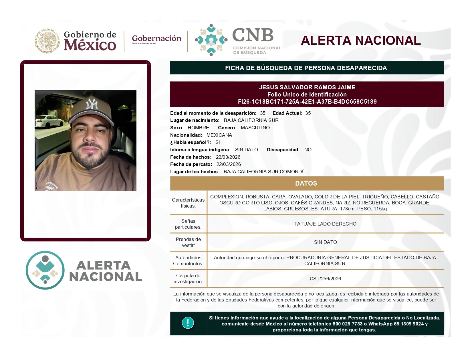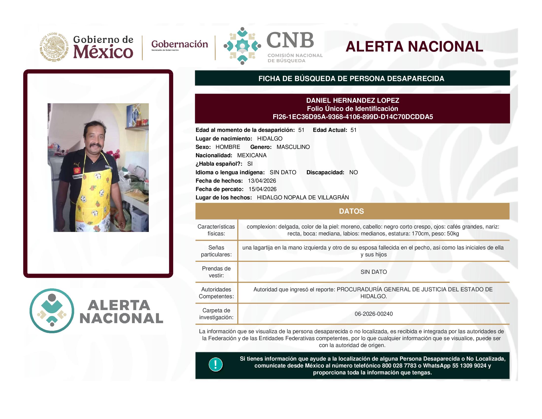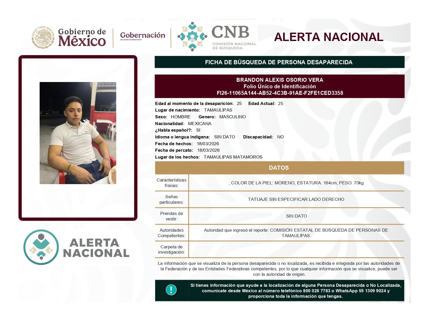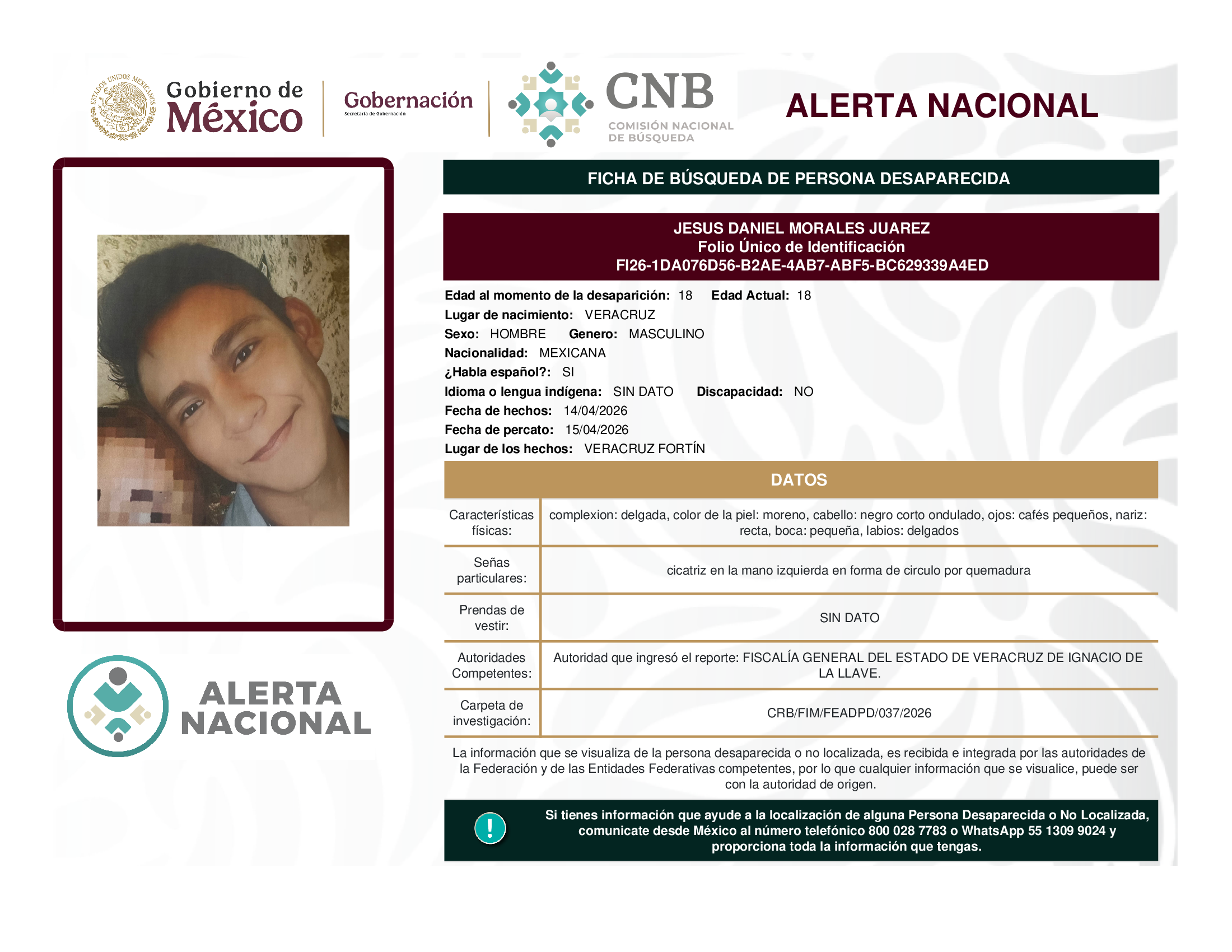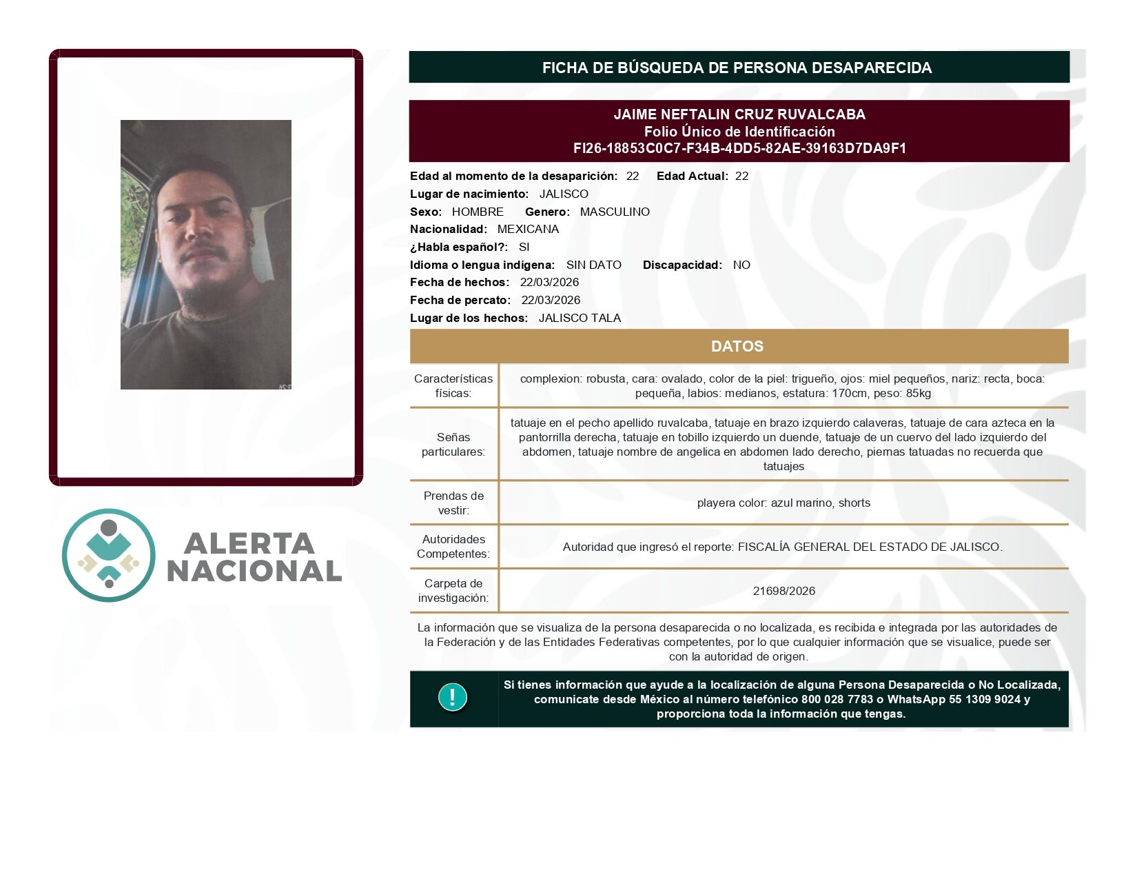ALERTA NACIONAL DE BÚSQUEDA, LOCALIZACIÓN E IDENTIFICACIÓN DE PERSONAS DESAPARECIDAS Y NO LOCALIZADAS
