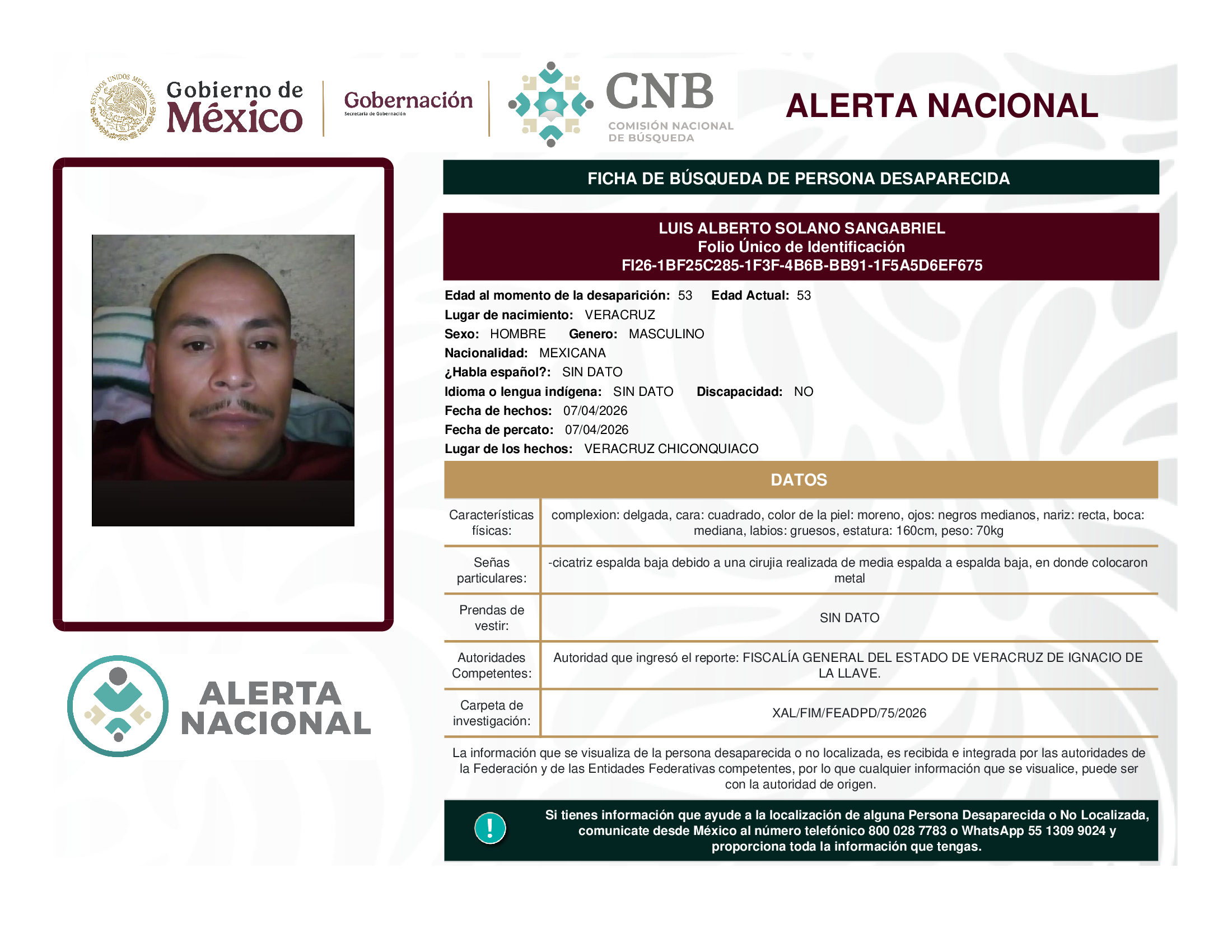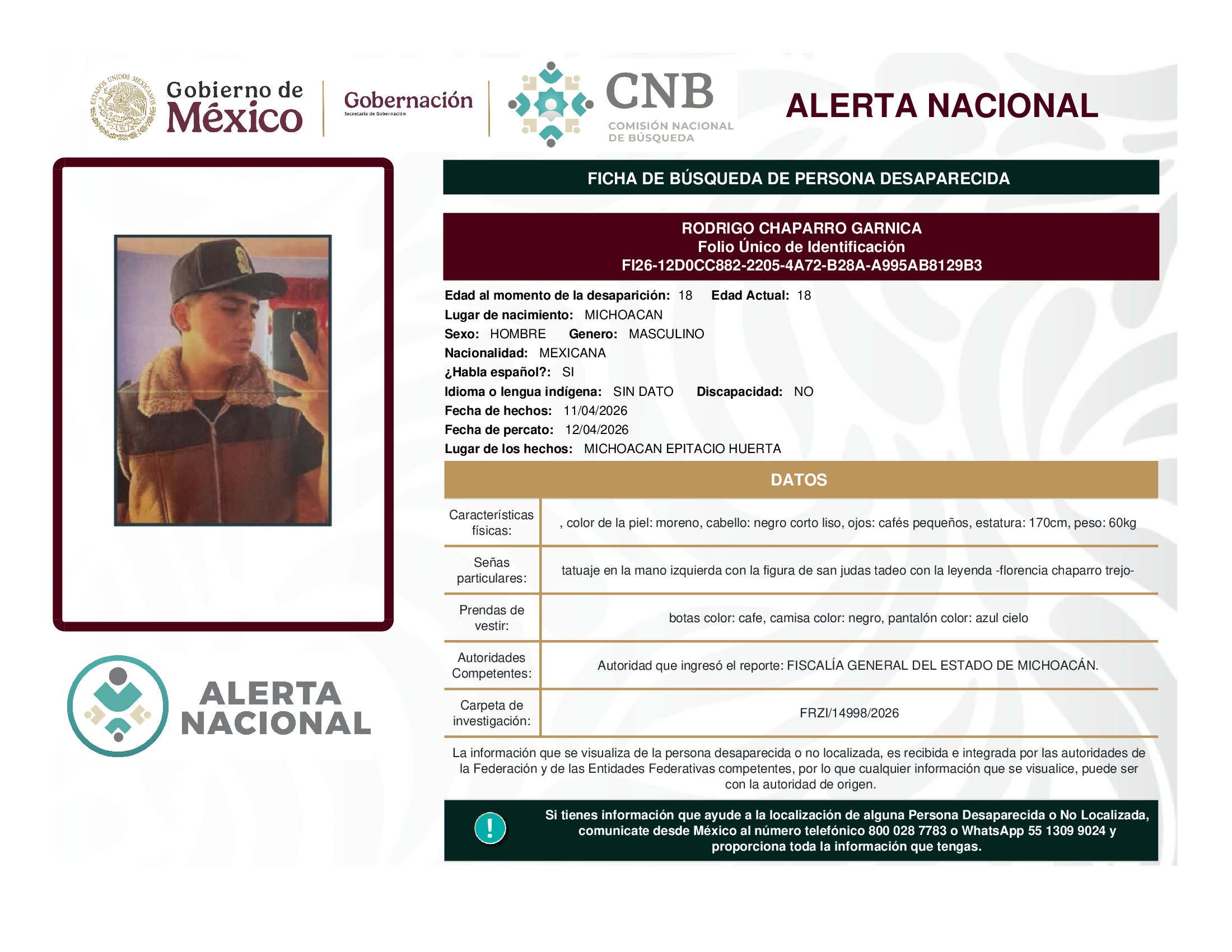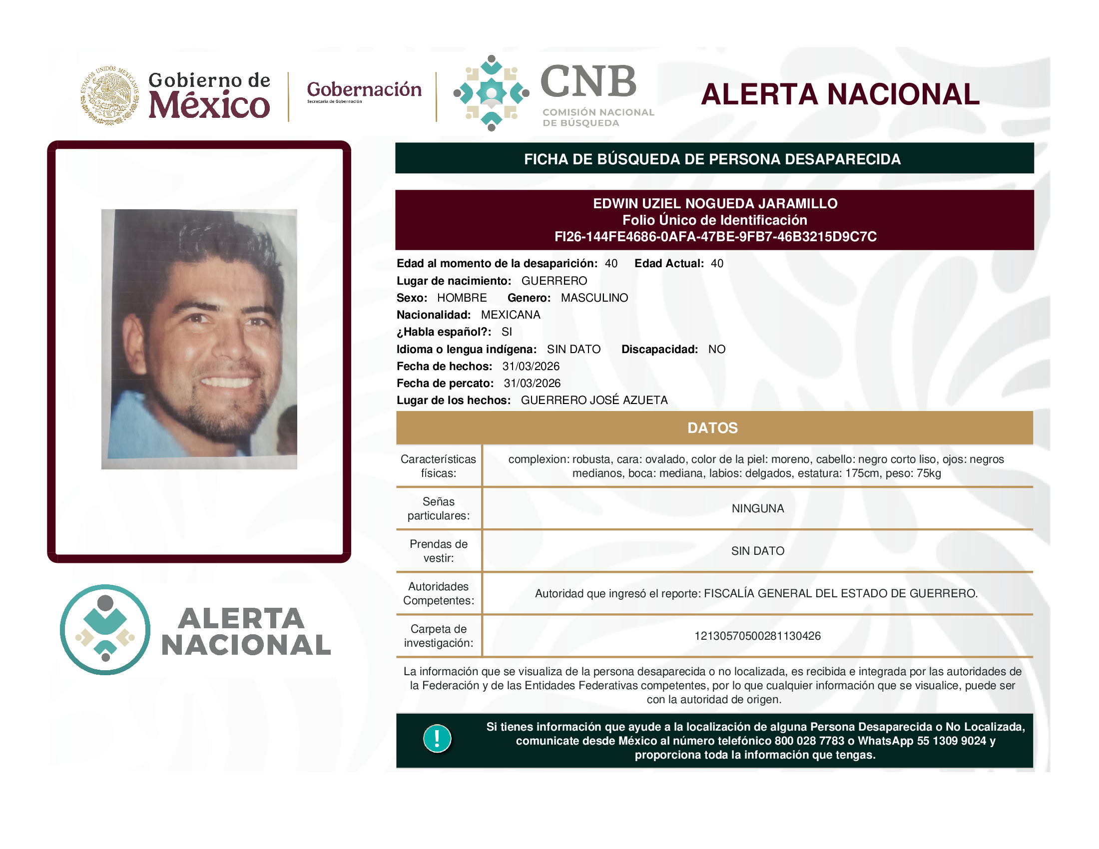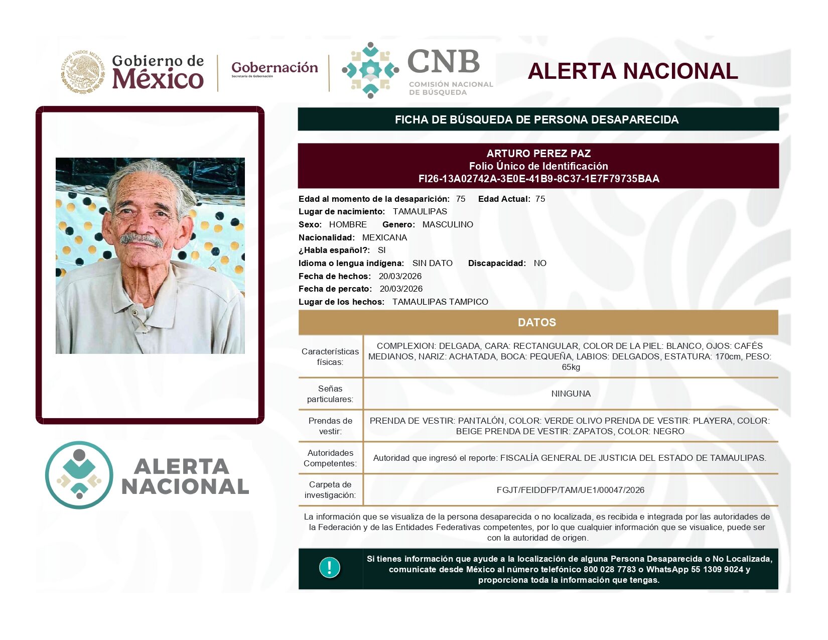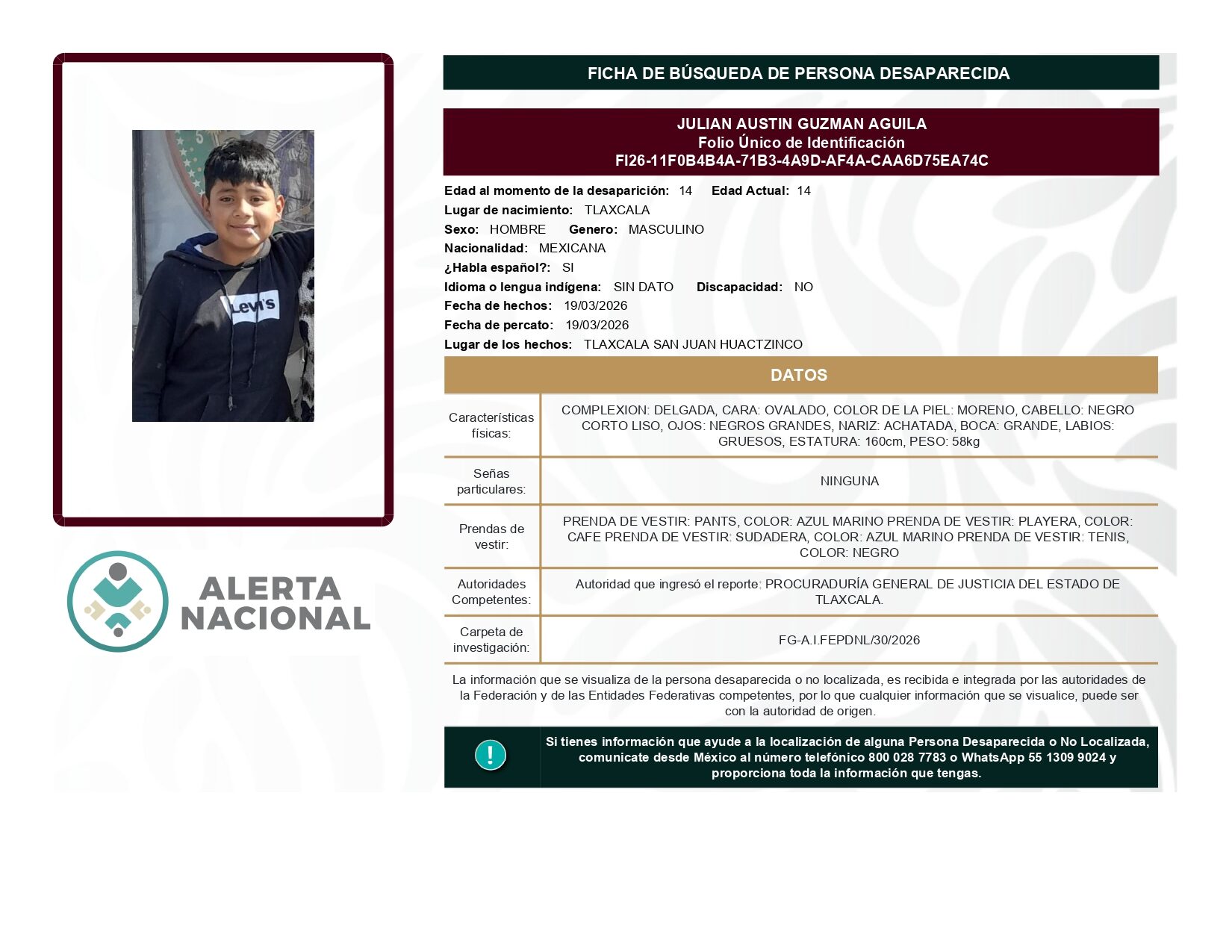 ALERTA NACIONAL DE BÚSQUEDA, LOCALIZACIÓN E IDENTIFICACIÓN DE PERSONAS DESAPARECIDAS Y NO LOCALIZADAS