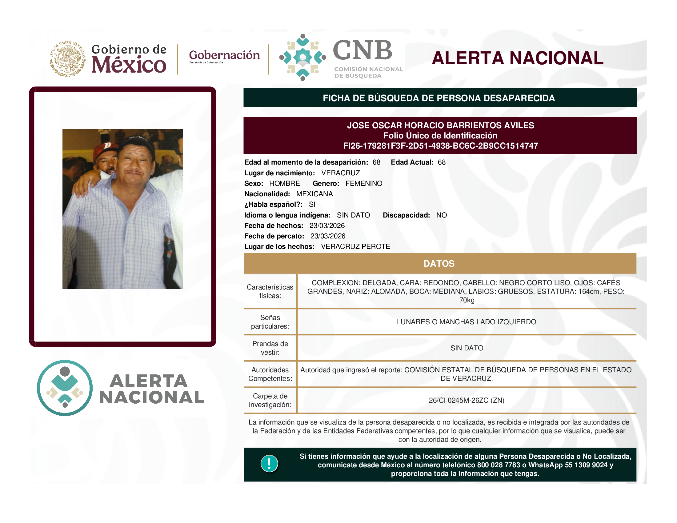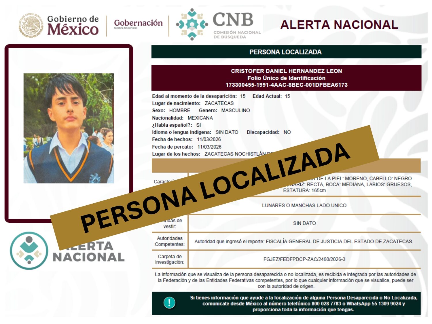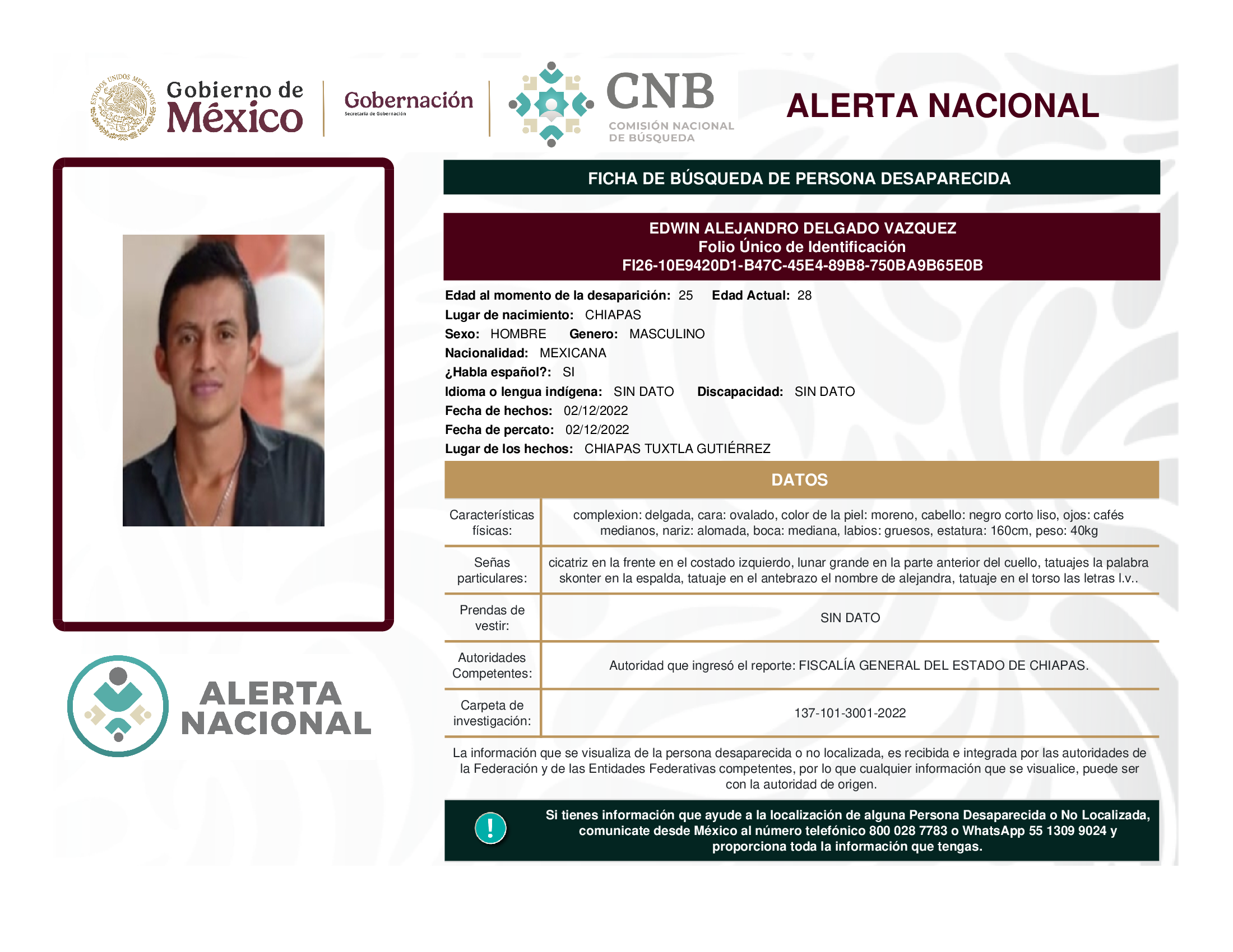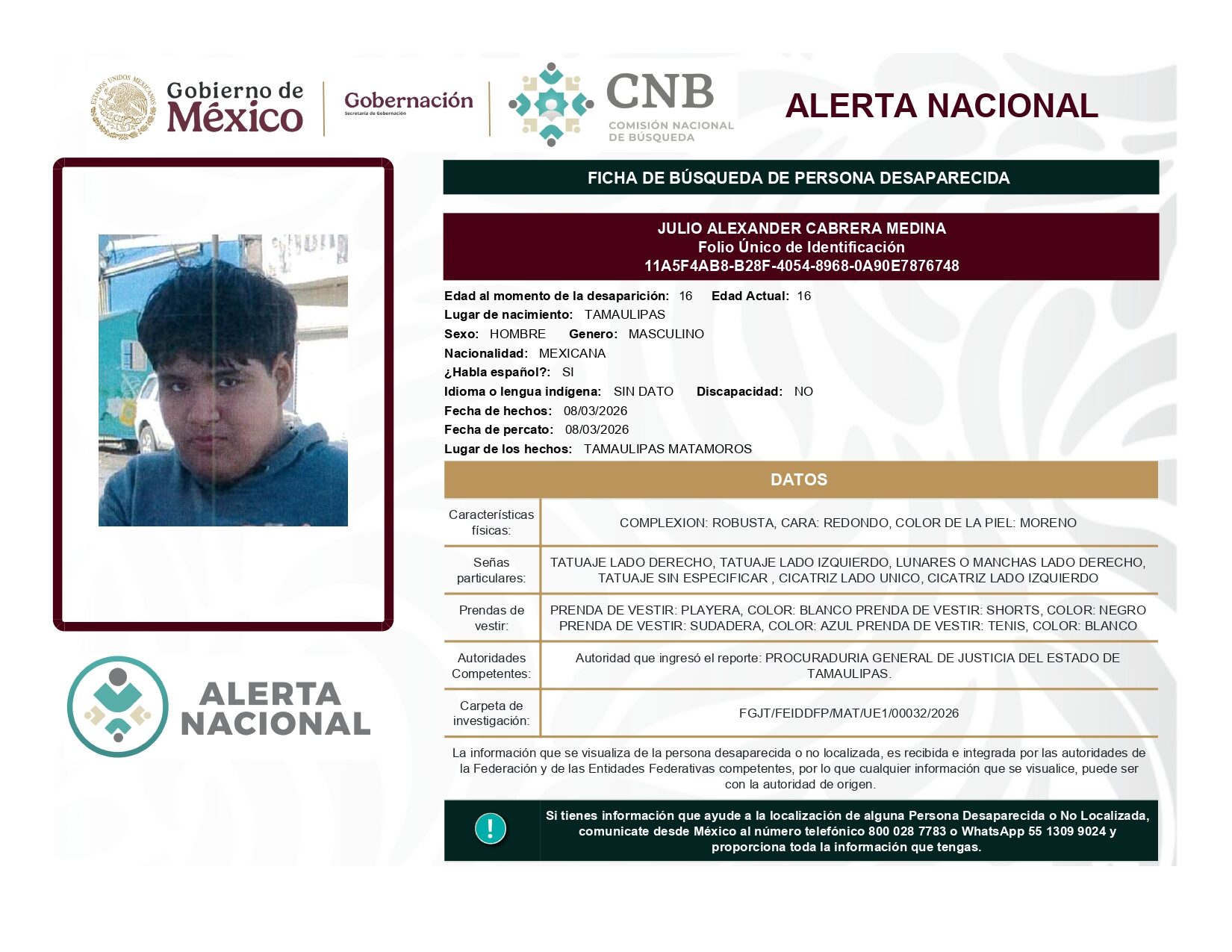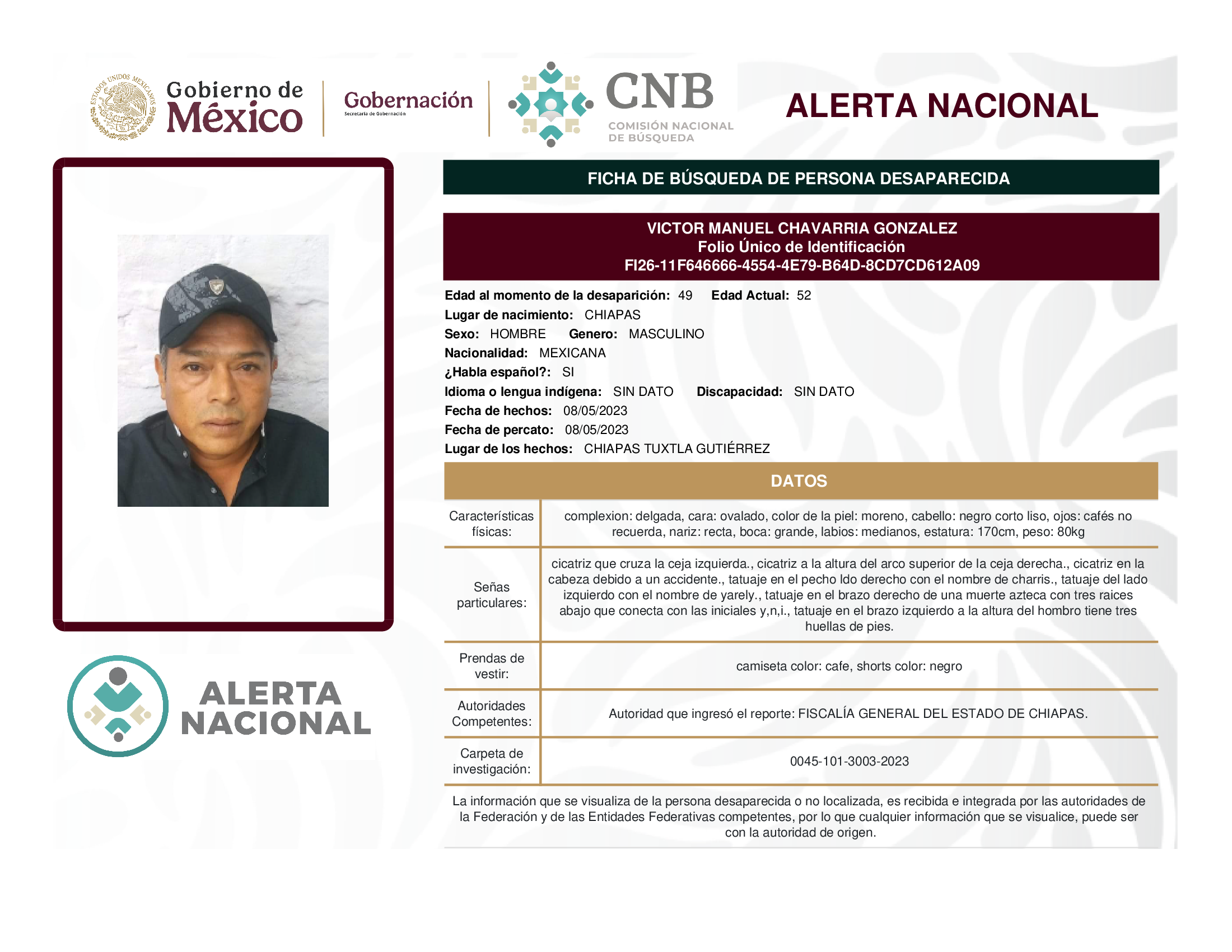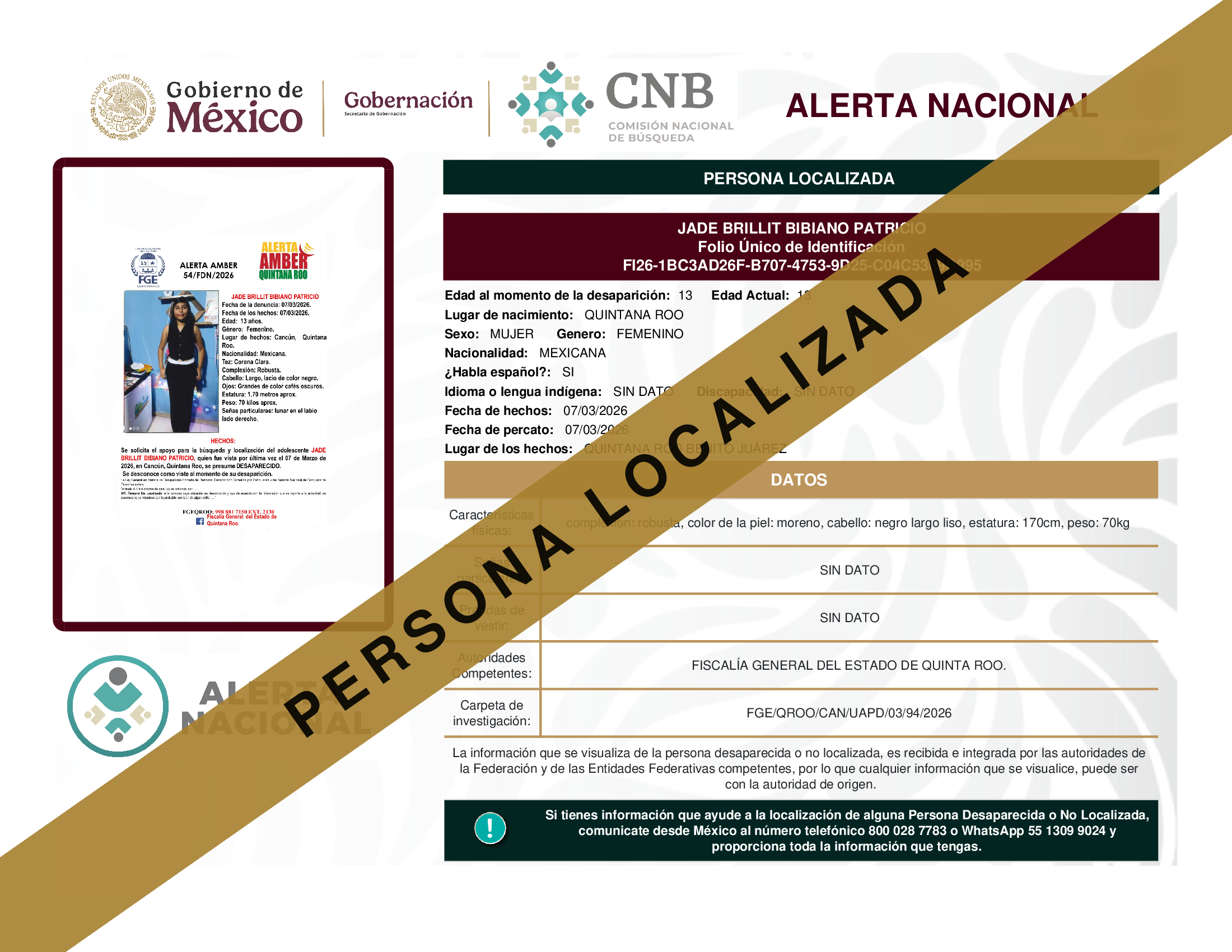 ALERTA NACIONAL DE BÚSQUEDA, LOCALIZACIÓN E IDENTIFICACIÓN DE PERSONAS DESAPARECIDAS Y NO LOCALIZADAS