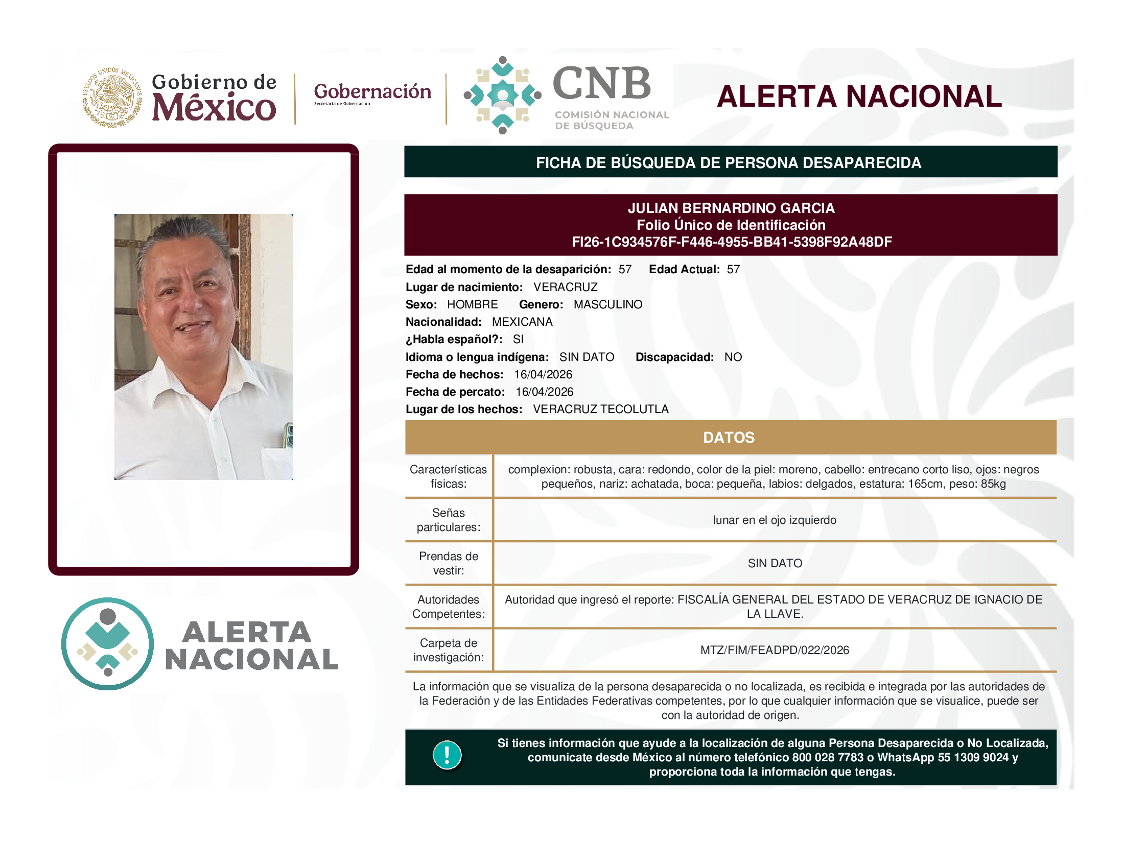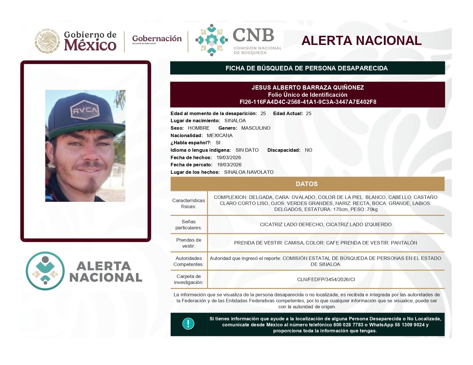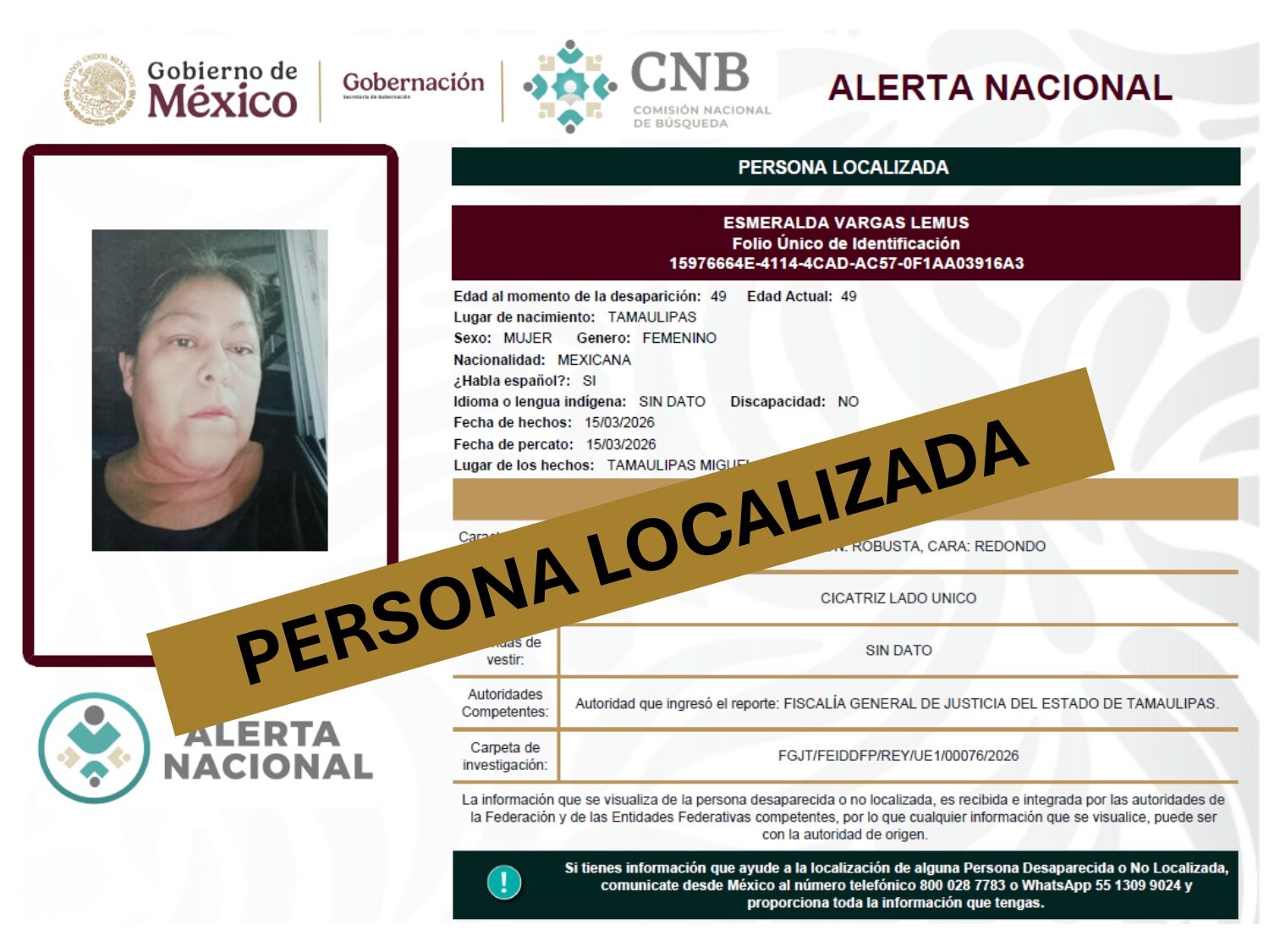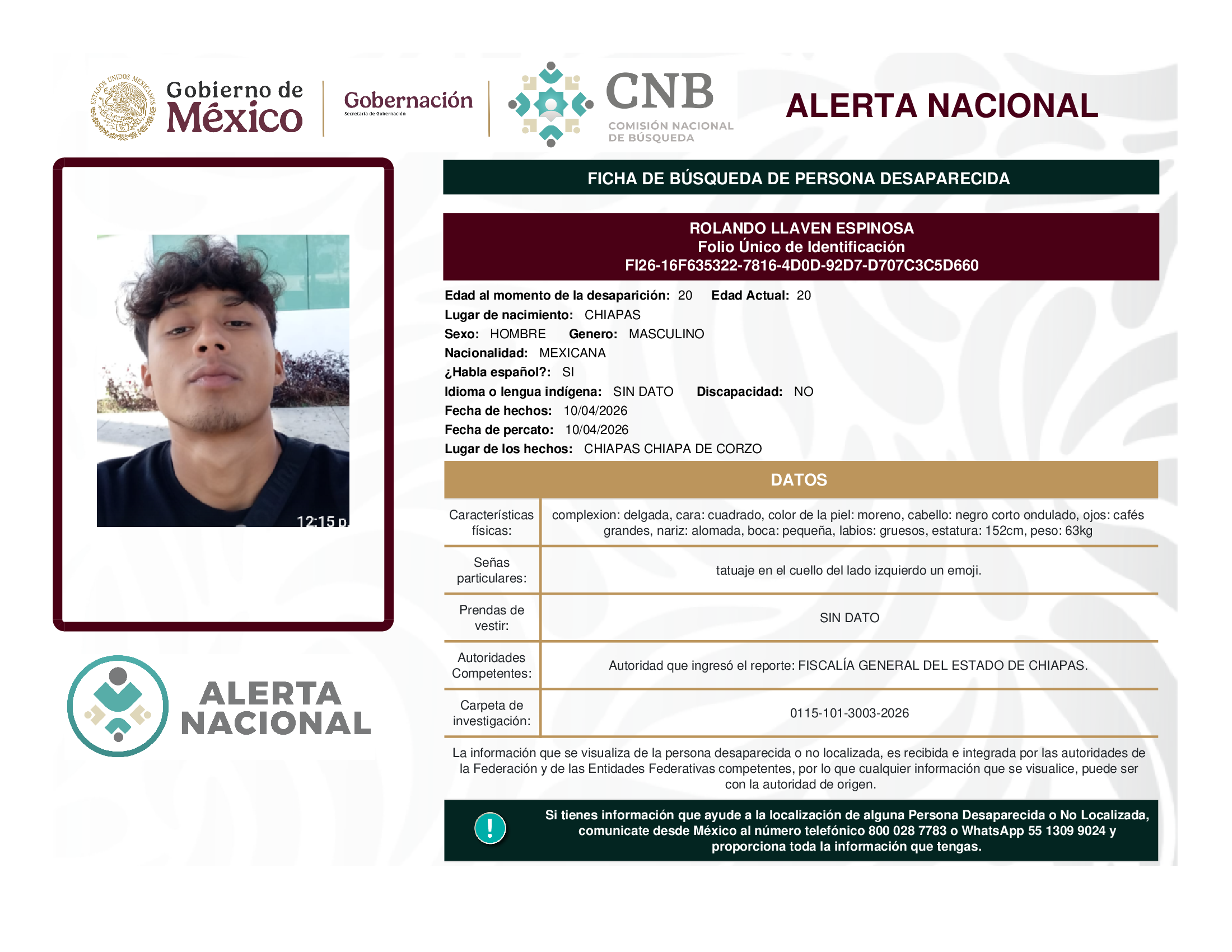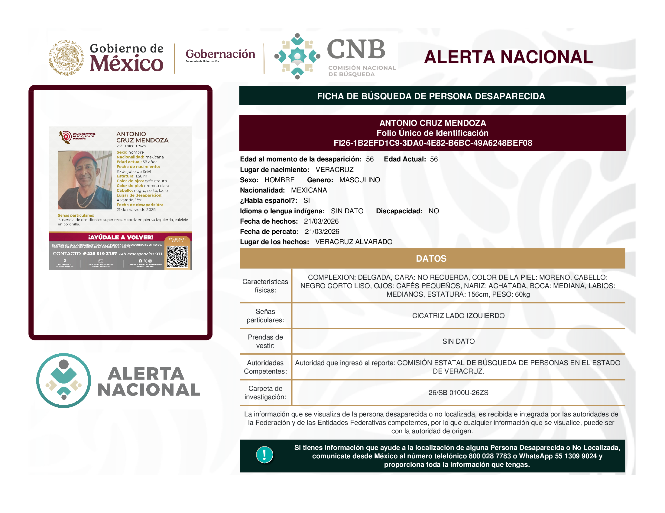 ALERTA NACIONAL DE BÚSQUEDA, LOCALIZACIÓN E IDENTIFICACIÓN DE PERSONAS DESAPARECIDAS Y NO LOCALIZADAS
