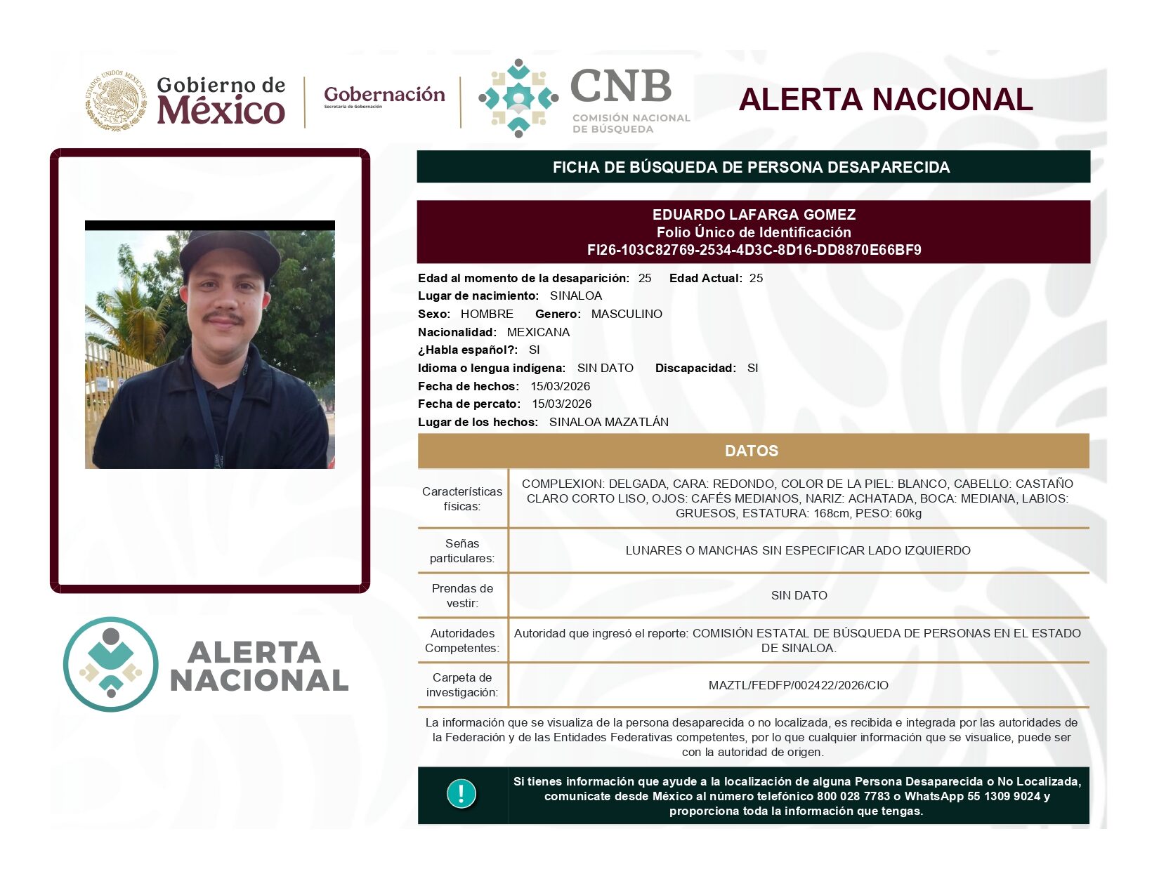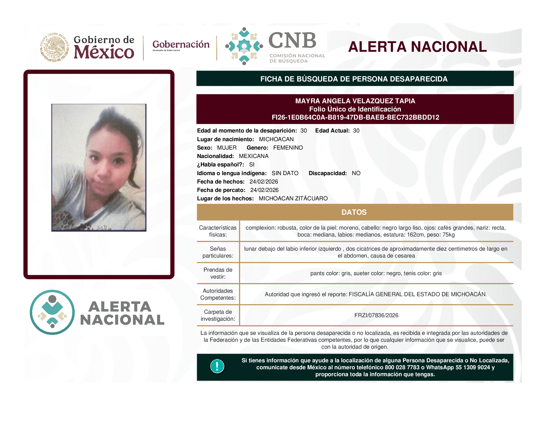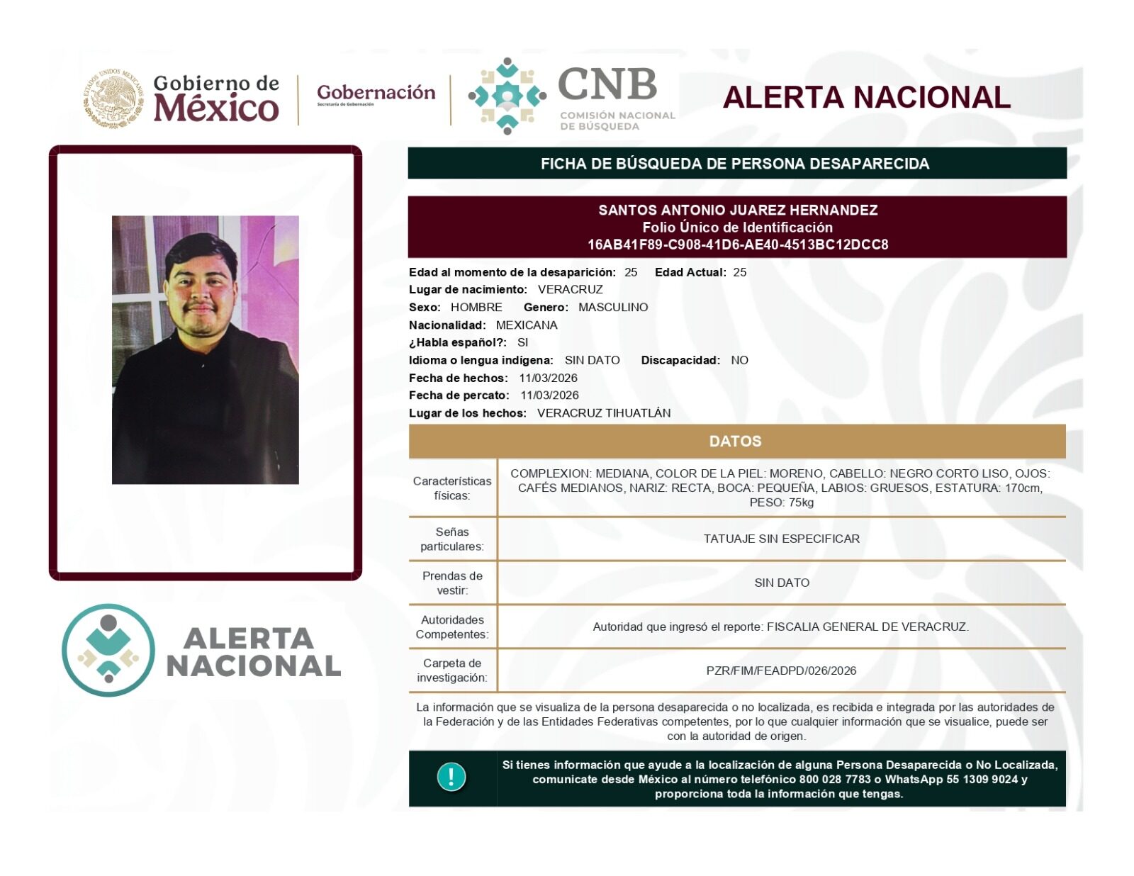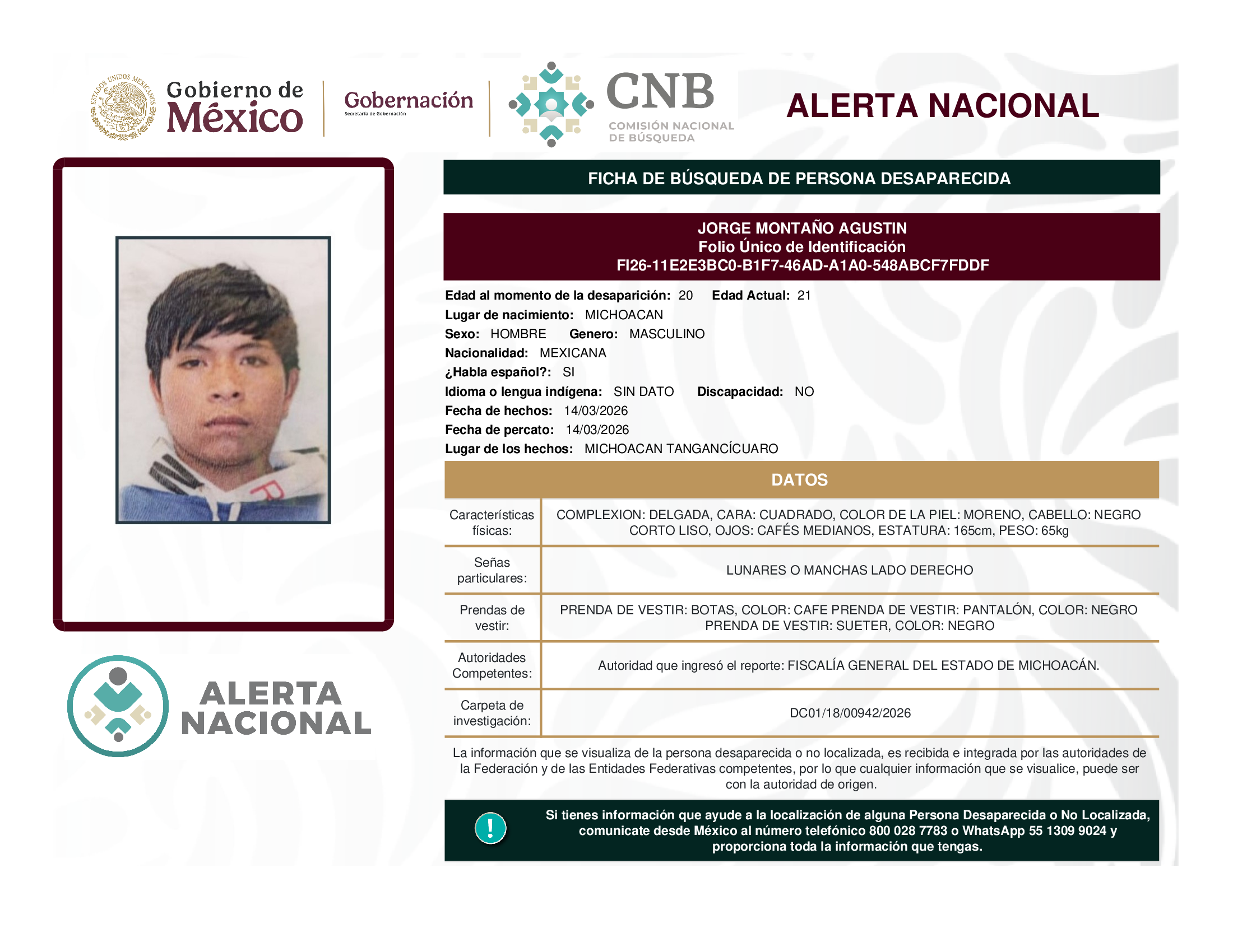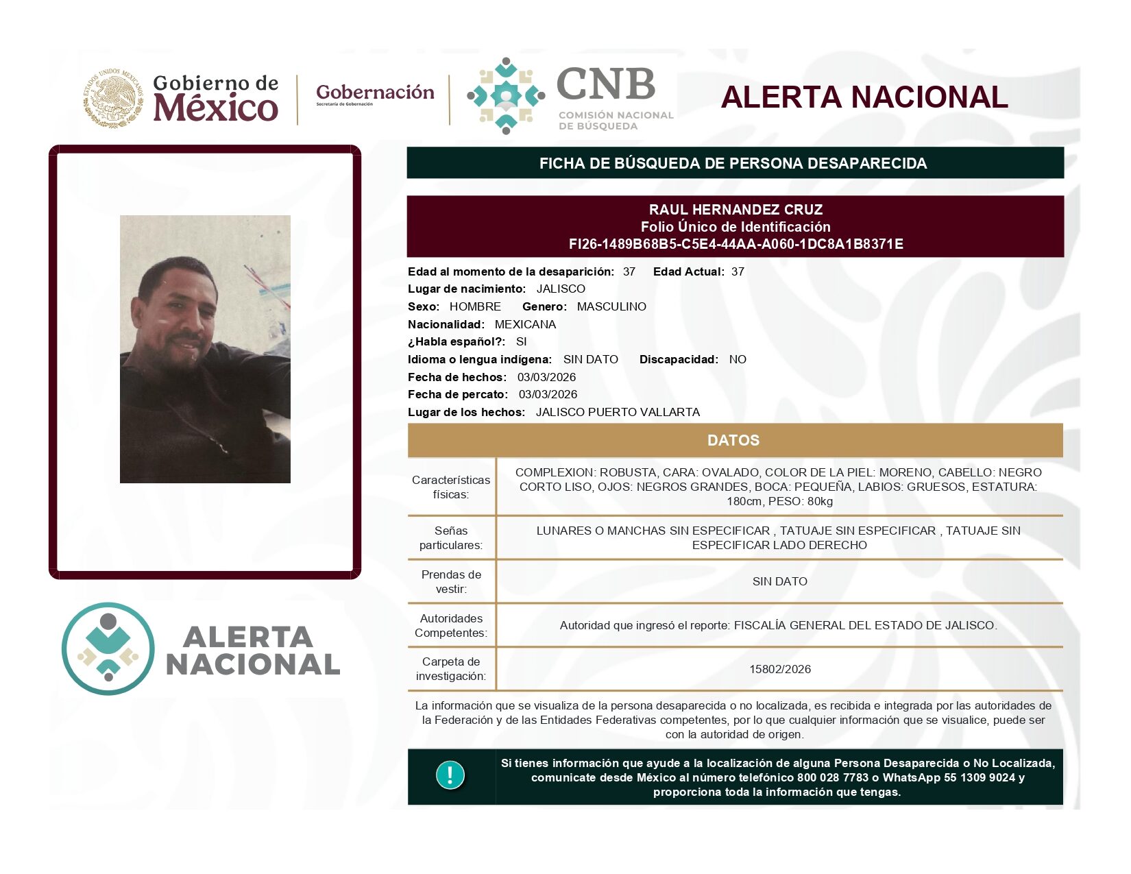 ALERTA NACIONAL DE BÚSQUEDA, LOCALIZACIÓN E IDENTIFICACIÓN DE PERSONAS DESAPARECIDAS Y NO LOCALIZADAS