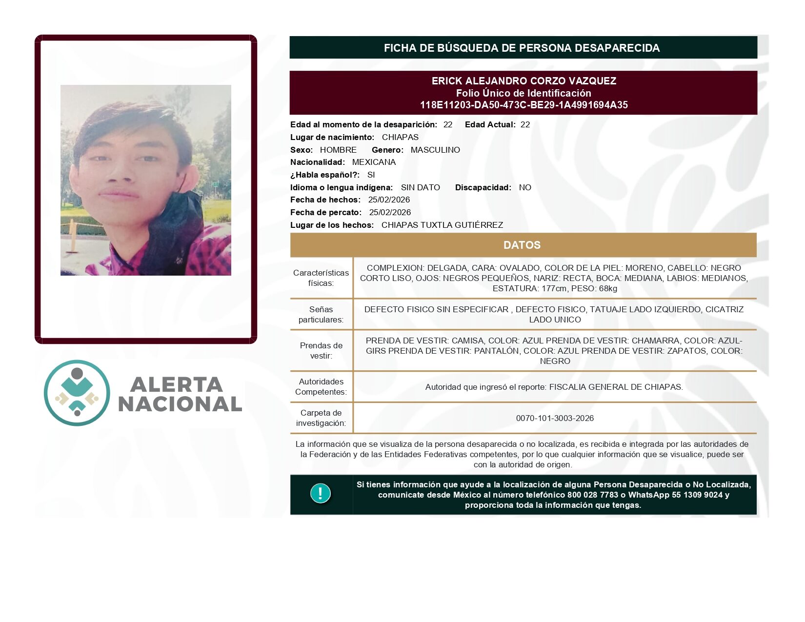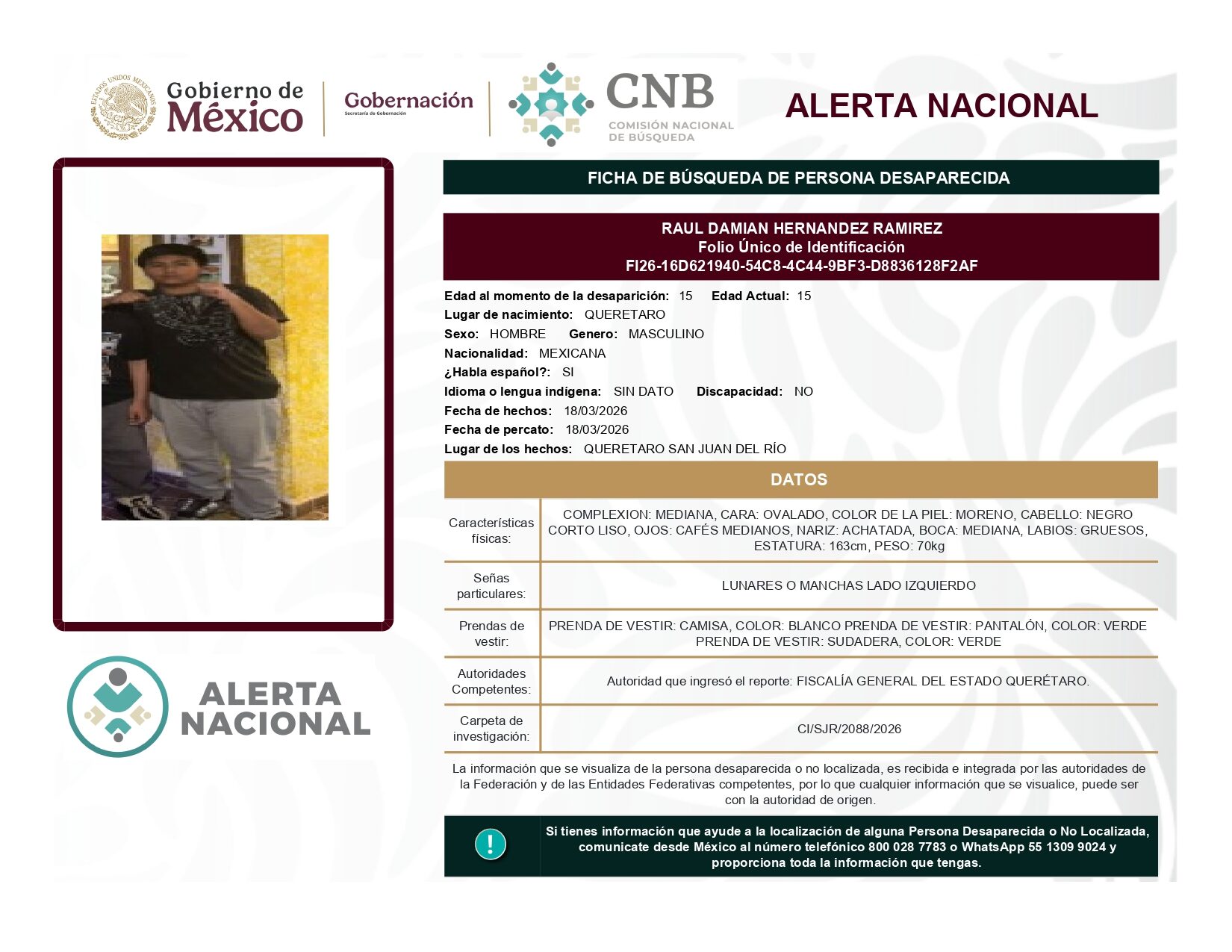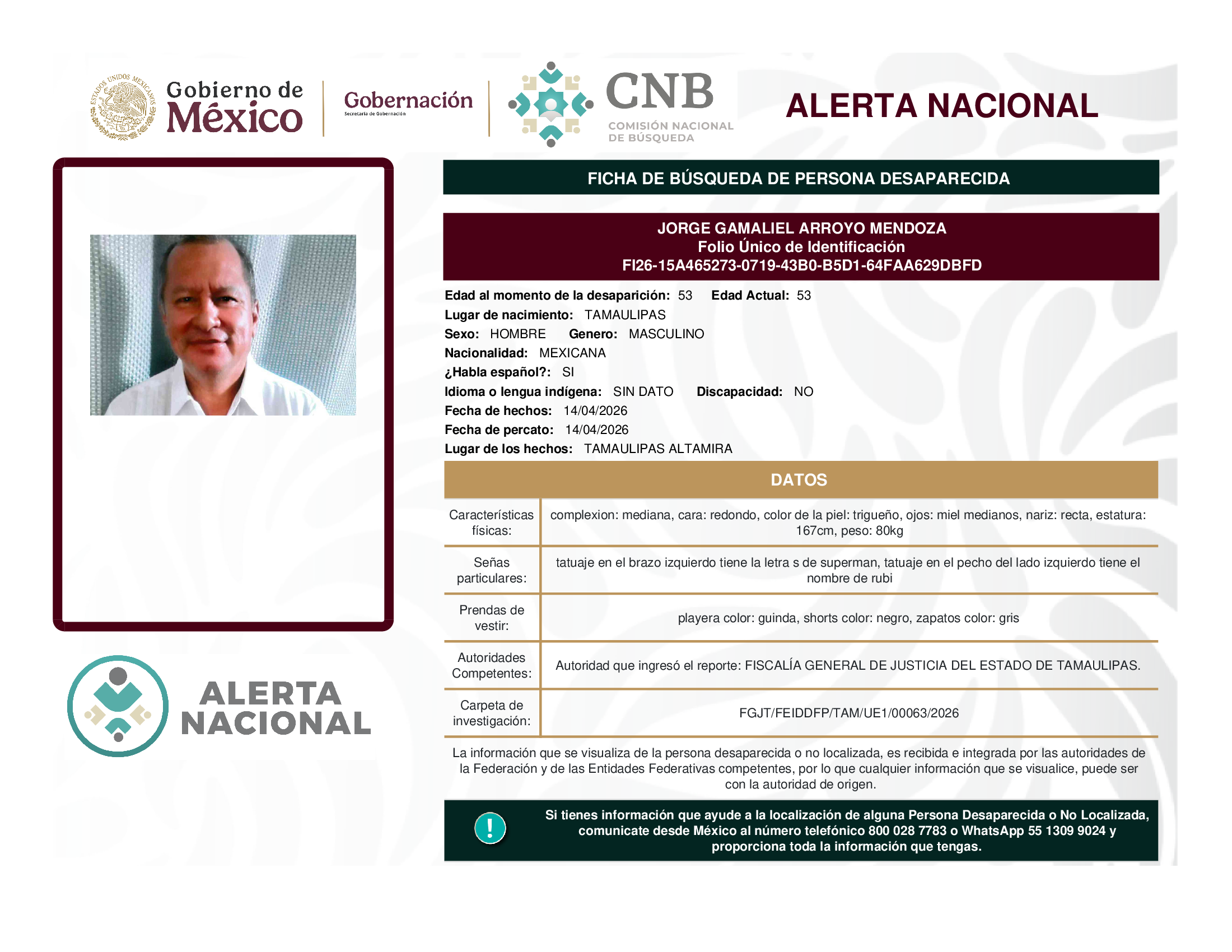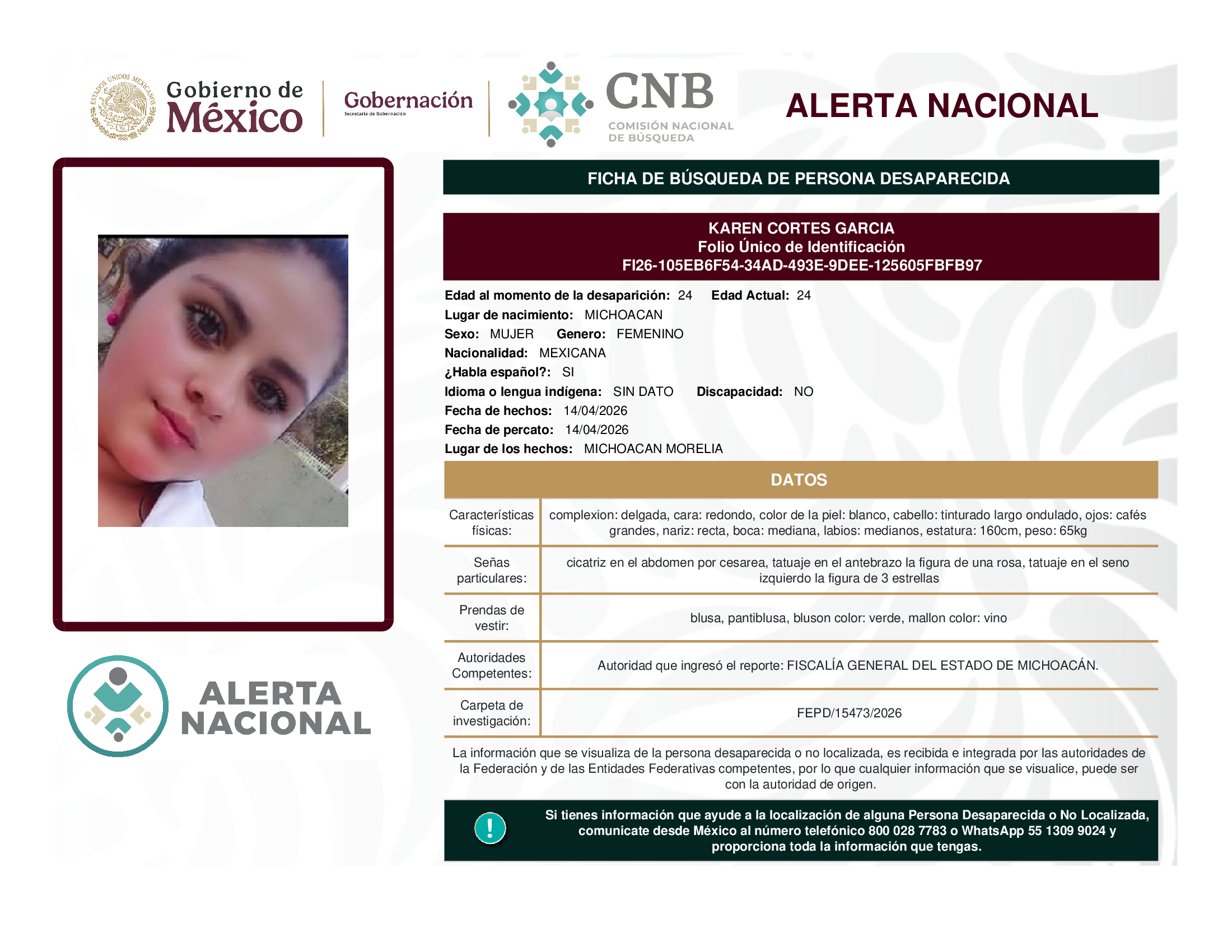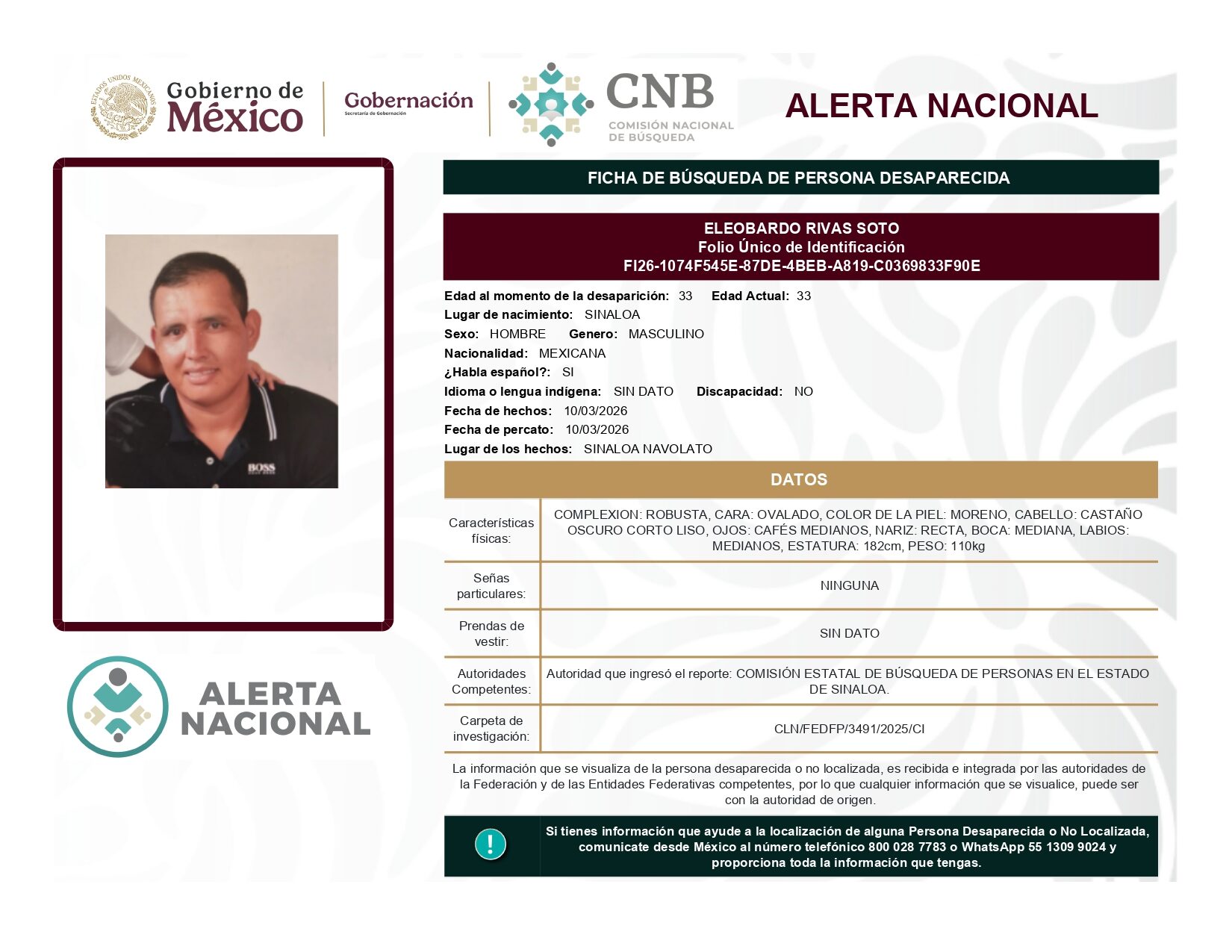ALERTA NACIONAL DE BÚSQUEDA, LOCALIZACIÓN E IDENTIFICACIÓN DE PERSONAS DESAPARECIDAS Y NO LOCALIZADAS