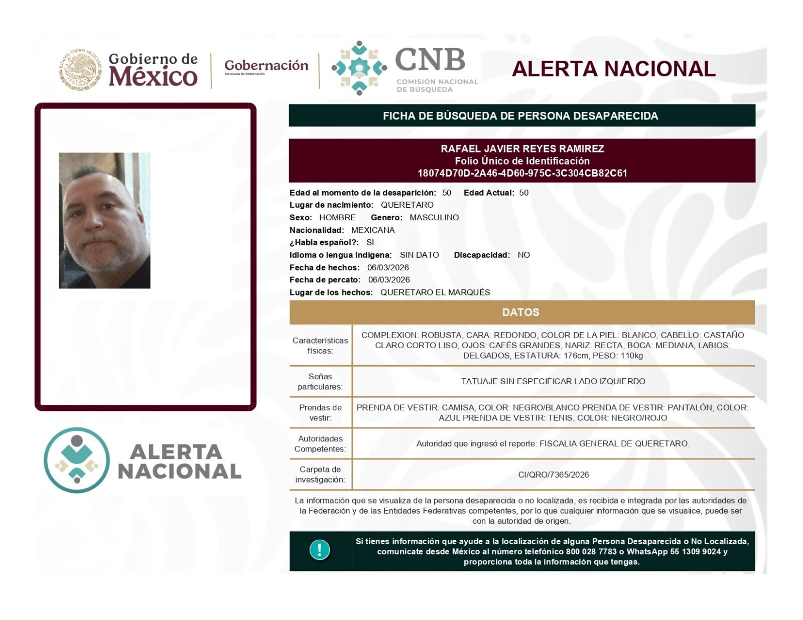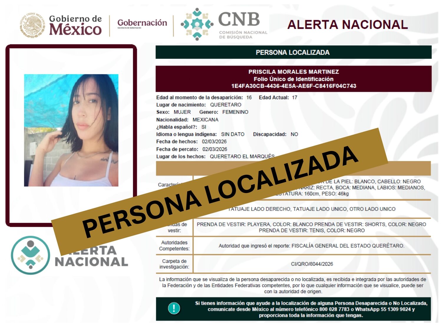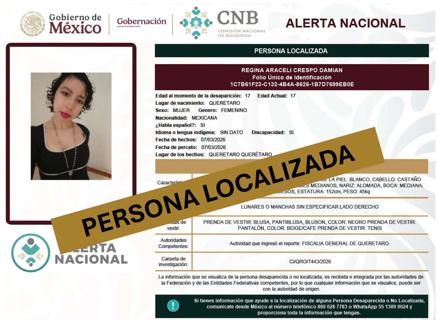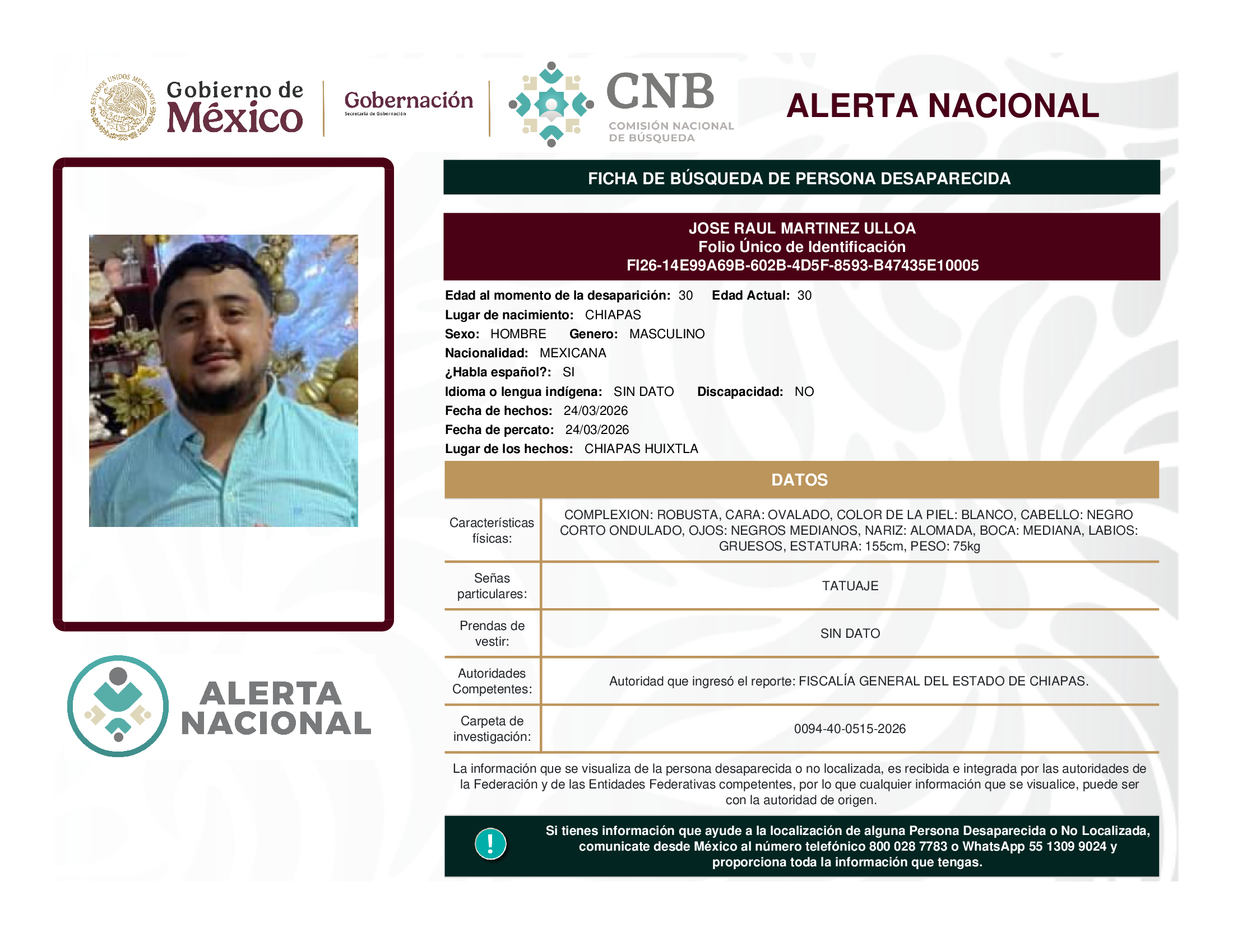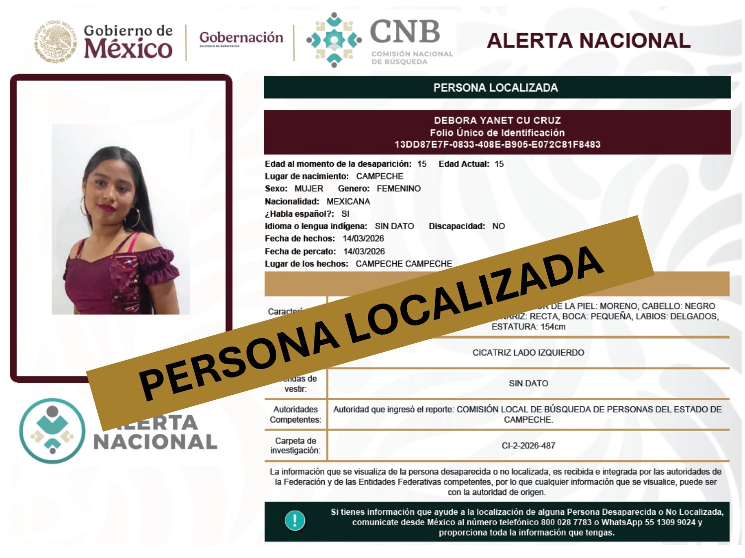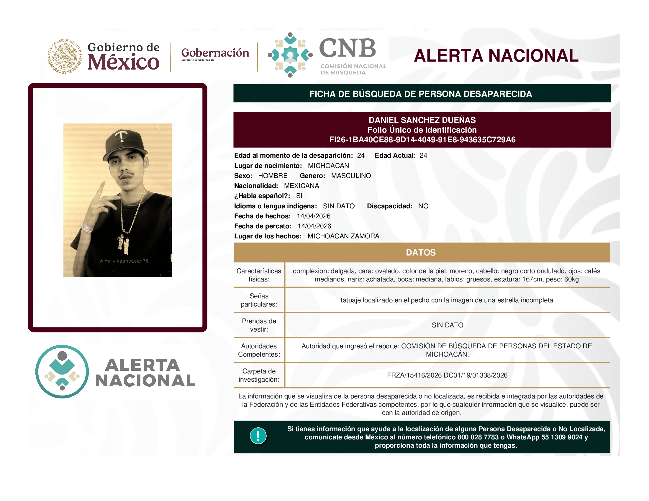 ALERTA NACIONAL DE BÚSQUEDA, LOCALIZACIÓN E IDENTIFICACIÓN DE PERSONAS DESAPARECIDAS Y NO LOCALIZADAS