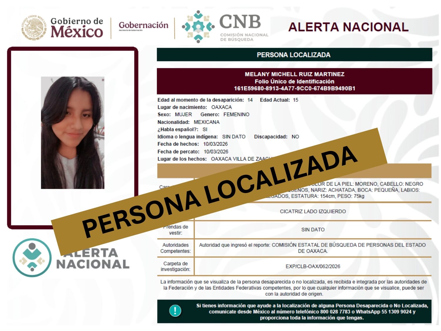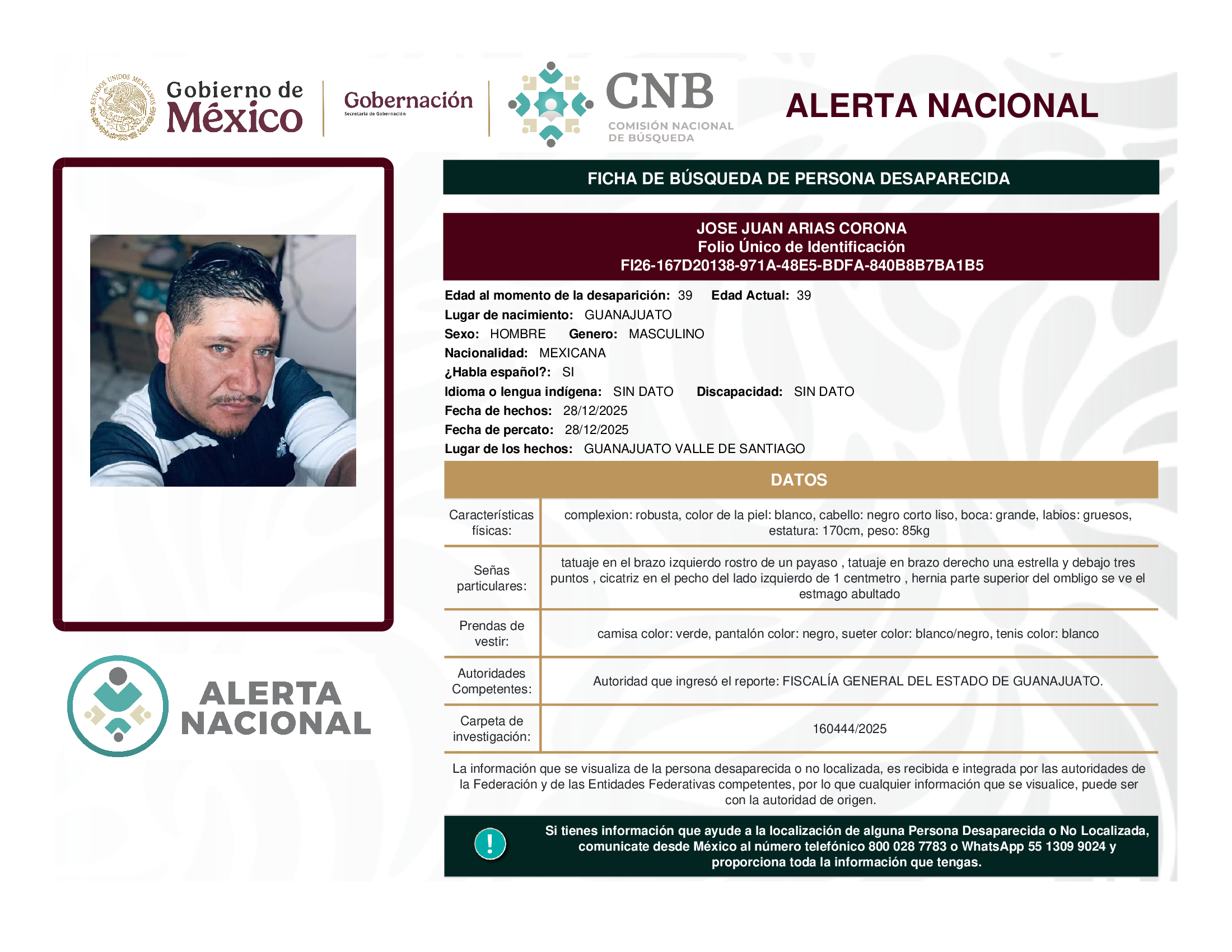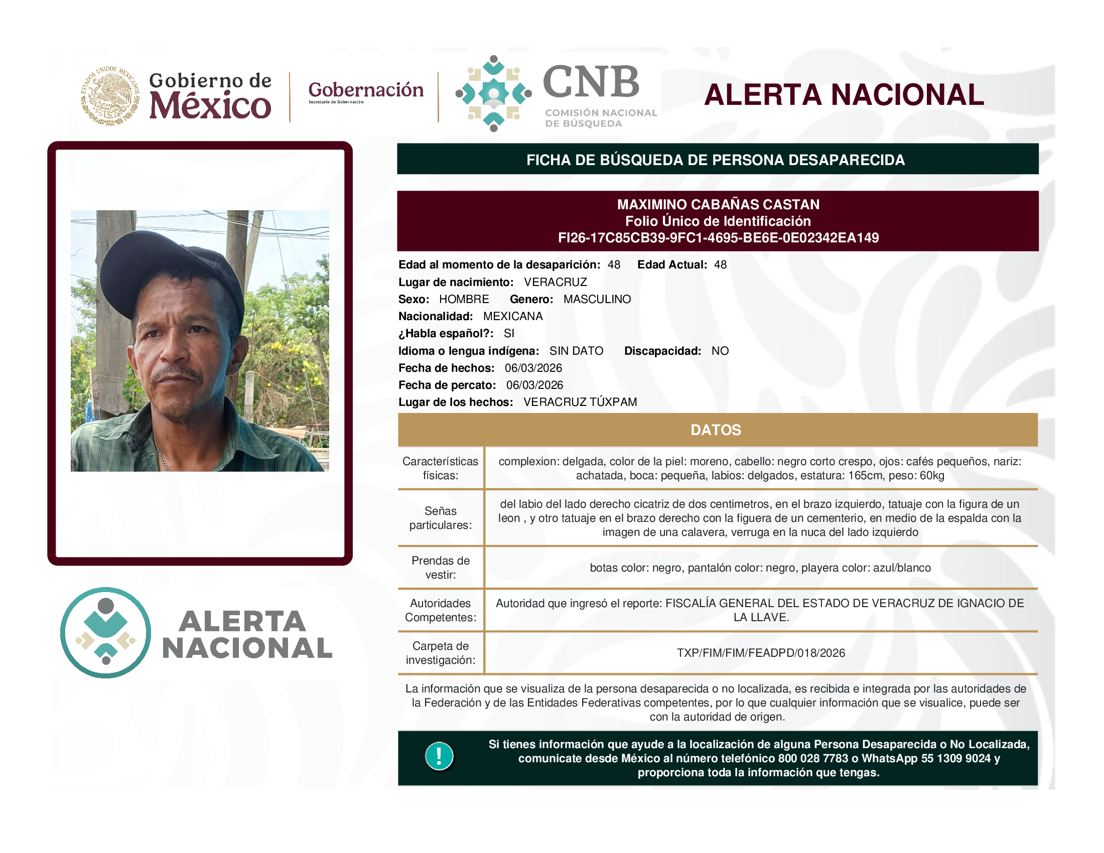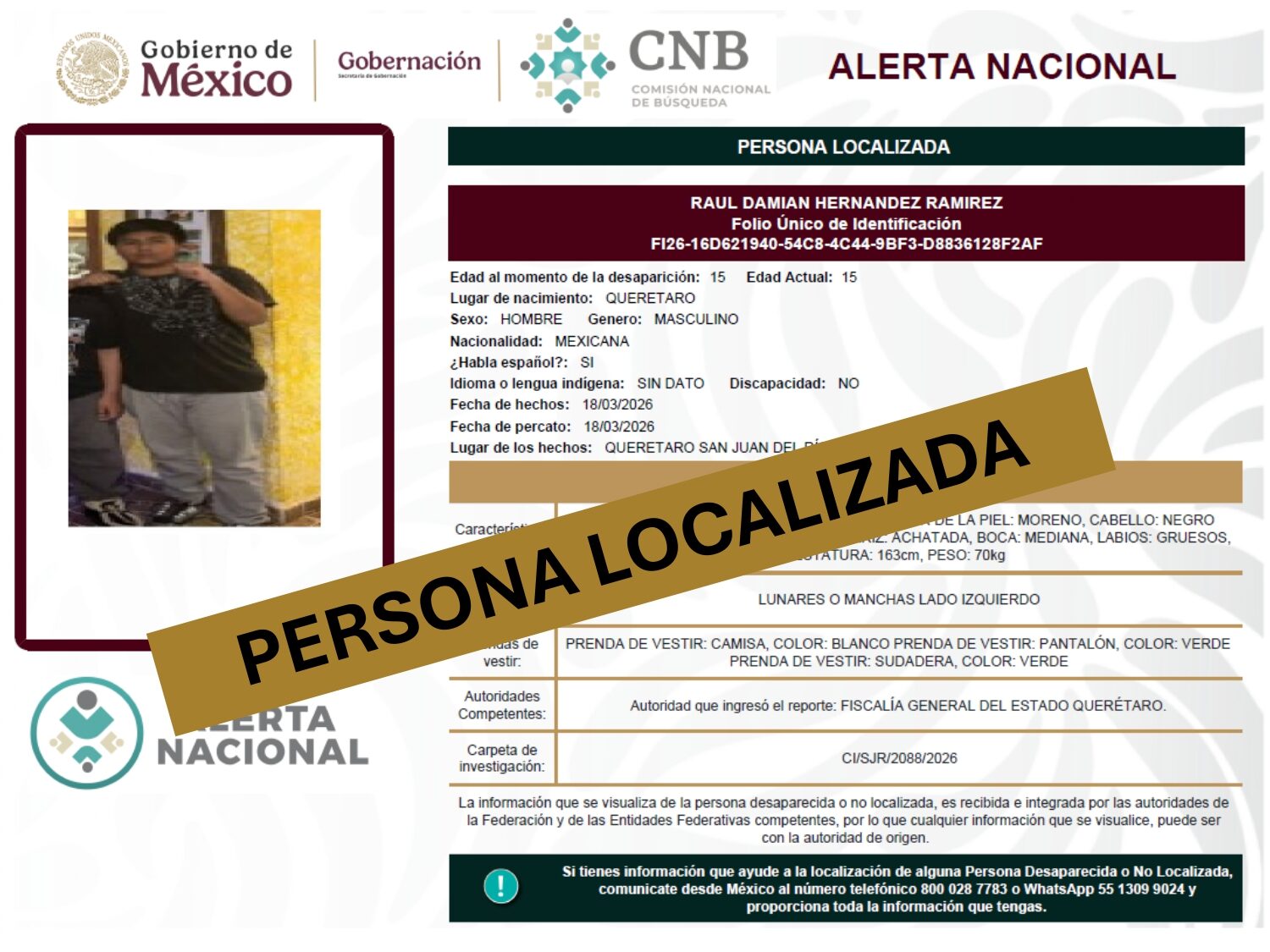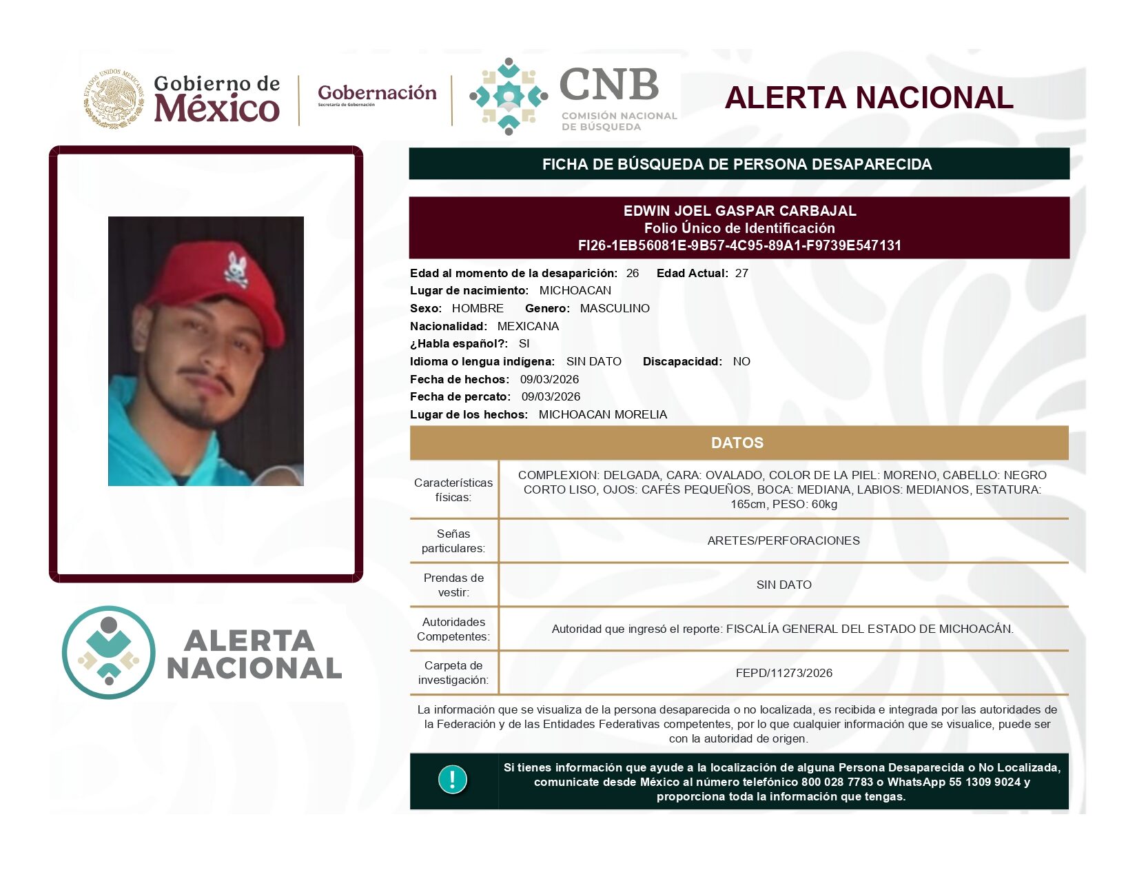 ALERTA NACIONAL DE BÚSQUEDA, LOCALIZACIÓN E IDENTIFICACIÓN DE PERSONAS DESAPARECIDAS Y NO LOCALIZADAS