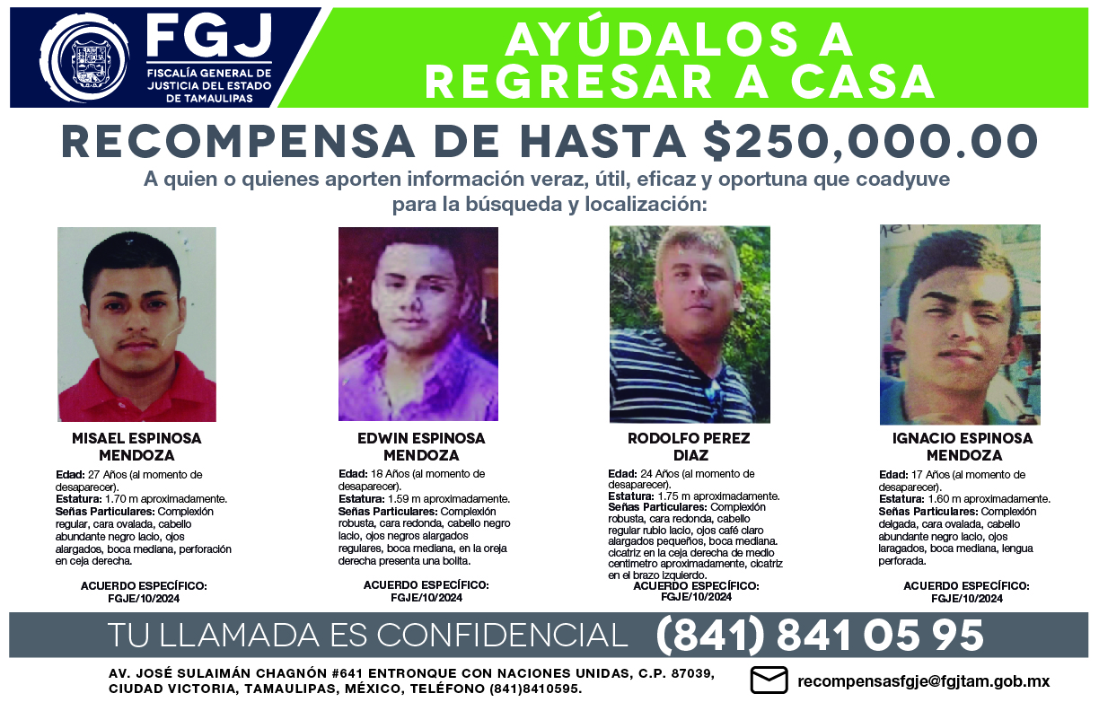 MISAEL ESPINOSA MENDOZA, EDWIN ESPINOSA MENDOZA, IGNACIO ESPINOSA MENDOZA Y RODOLFO PÉREZ DÍAZ 11 marzo, 2025 Recompensas(Colaboraciones ) FGJE-10-2024 MISAEL ESPINOSA MENDOZA, EDWIN ESPINOSA MENDOZA, IGNACIO ESPINOSA MENDOZA Y RODOLFO PÉREZ DÍAZ